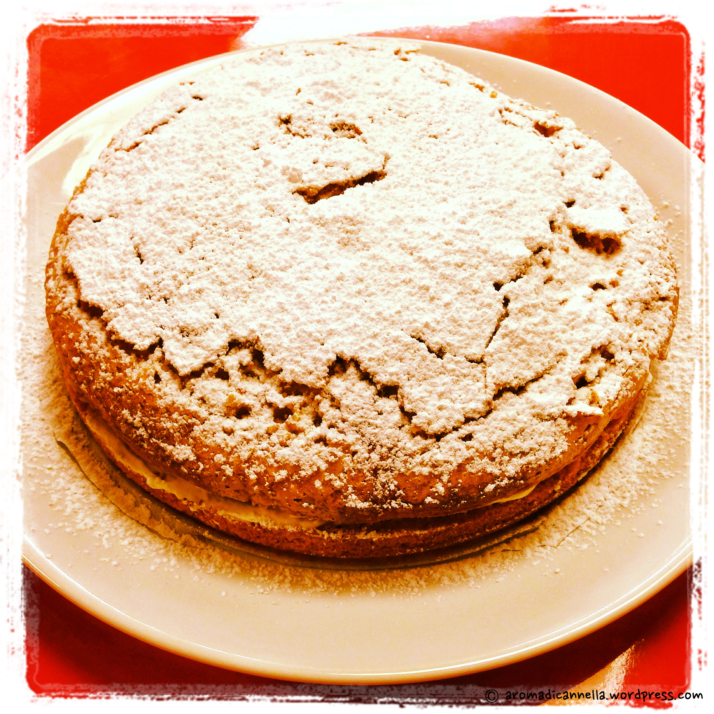 Una volta fredda, tagliate la torta a metà e farcite con la panna montata. Spolverate con lo zucchero a velo.