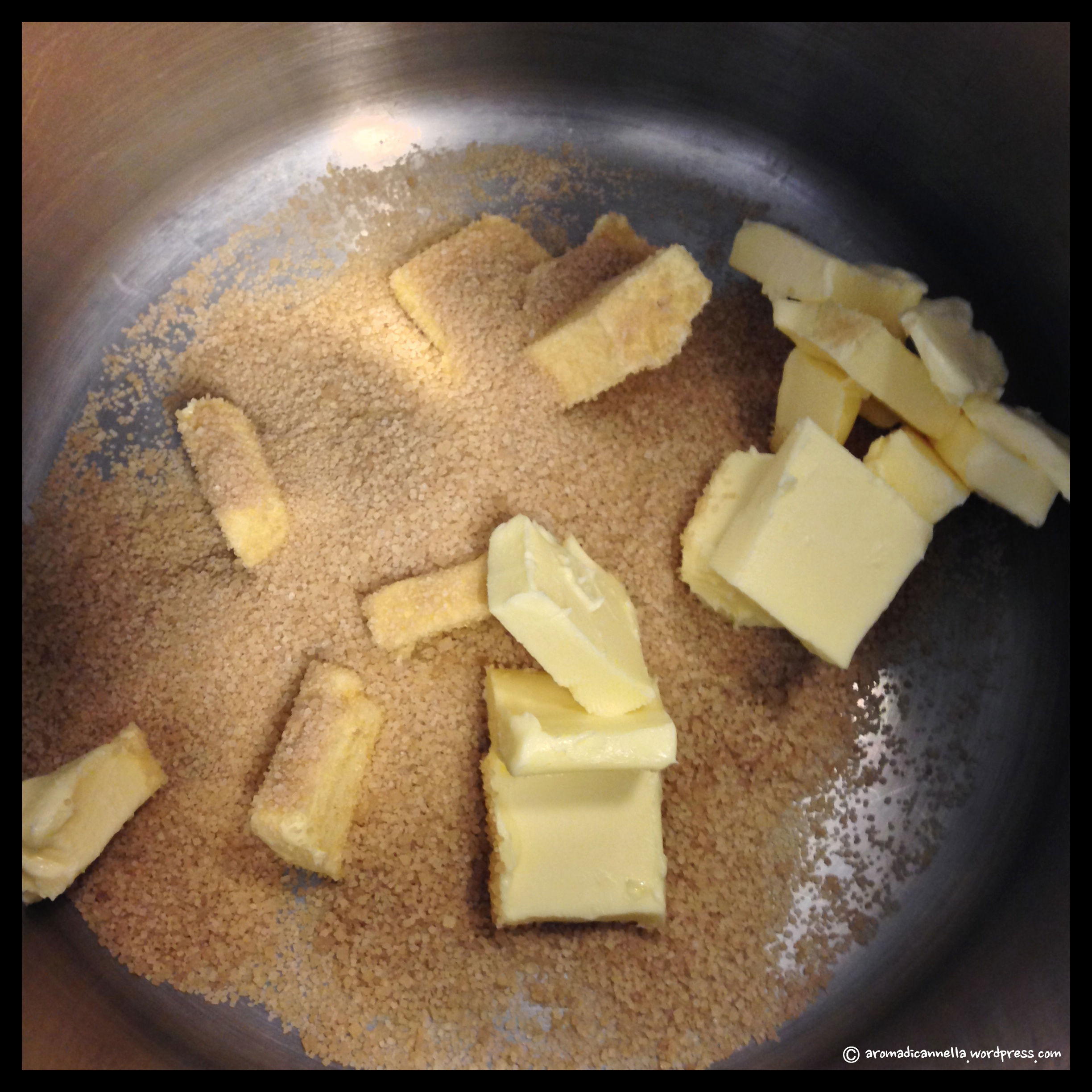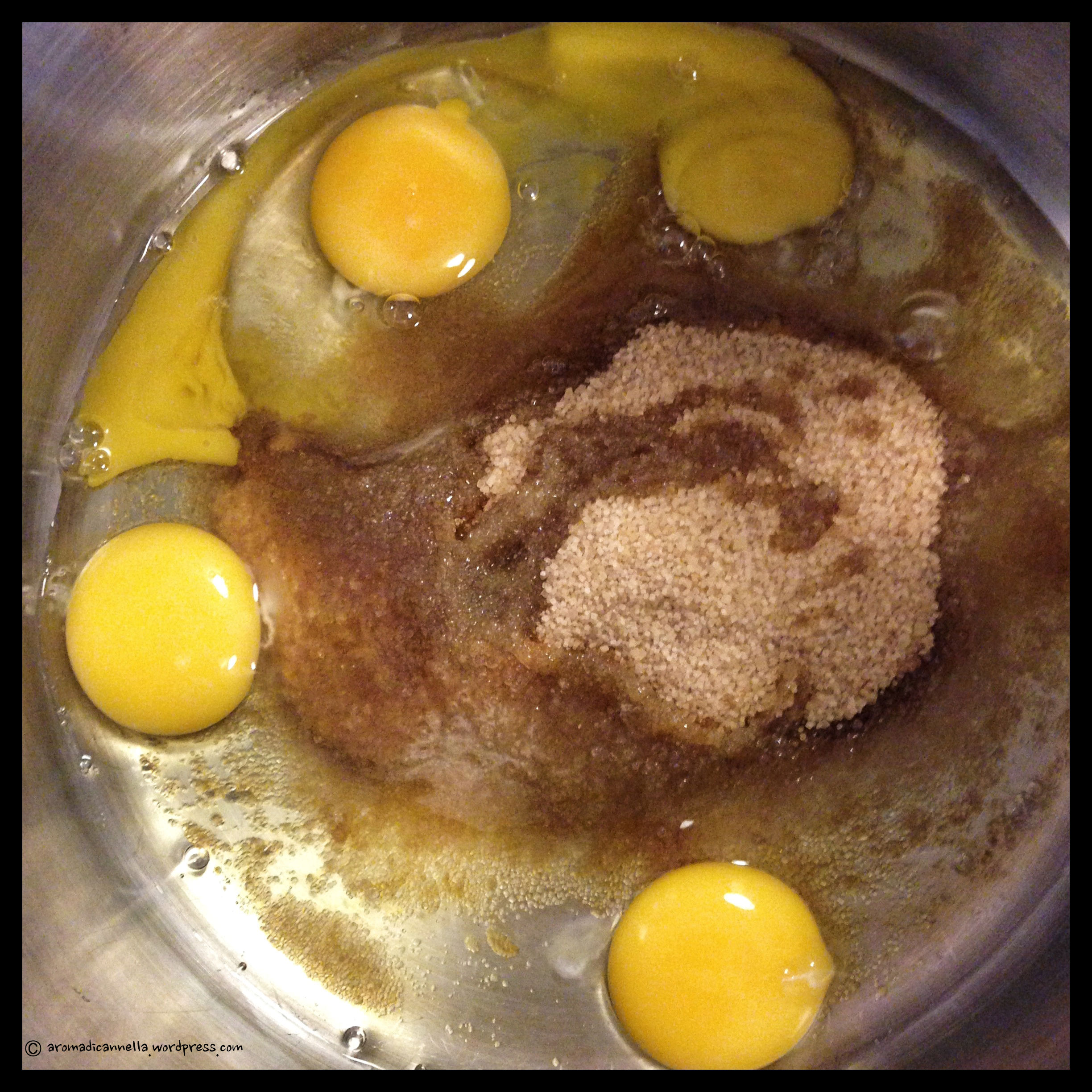 In un’altra ciotola più grande (io ho usato una pentola da pasta, per capirsi, perché purtroppo in cucina non disponiamo di molti utensili) spezzettate il burro ammorbidito e aggiungete lo zucchero.