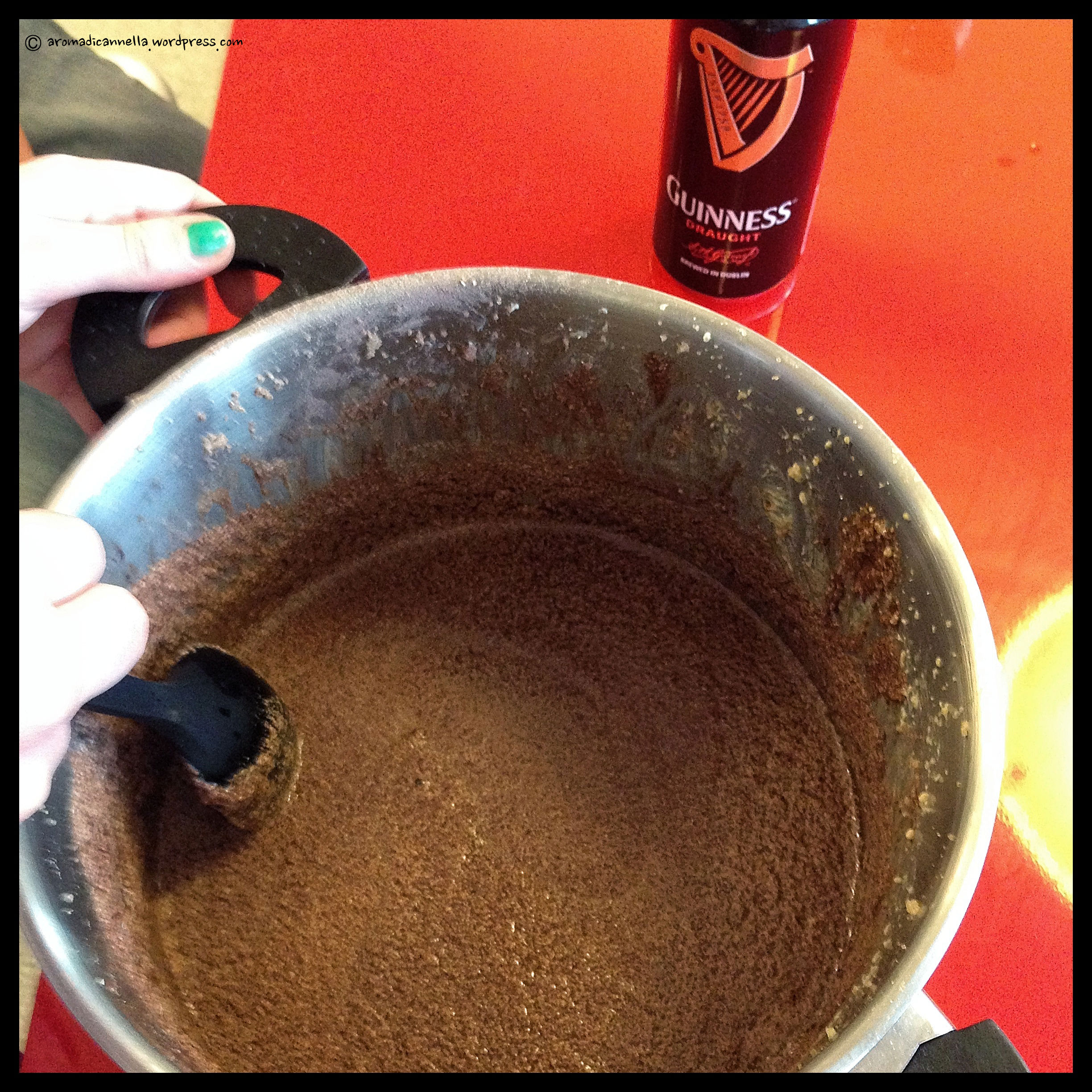E’ stato un bel lavoro di squadra comunque, abbiamo pasticciato un sacco per tutta domenica pomeriggio. E dato che l’indomani, ossia oggi, sarebbe stato San Patrizio, abbiamo pensato ad una torta al cioccolato aromatizzata alla Guinness.
