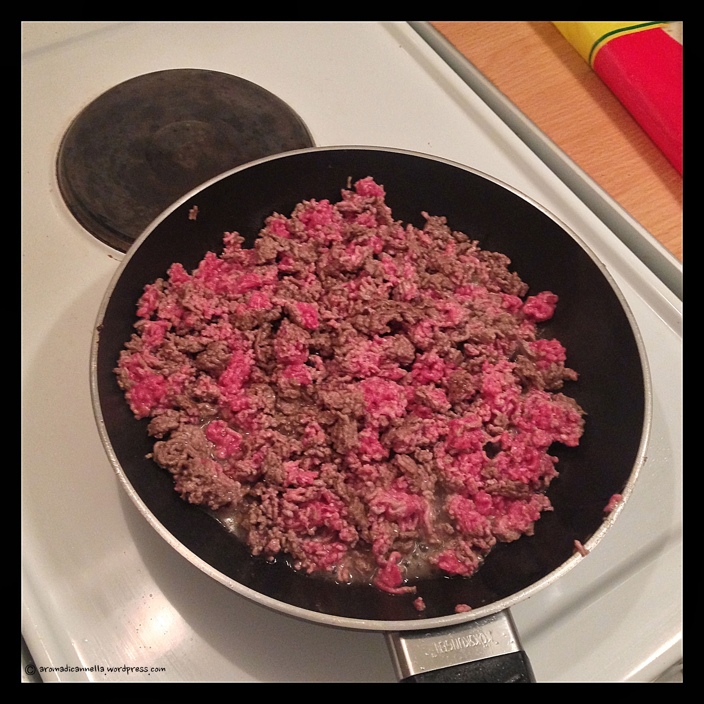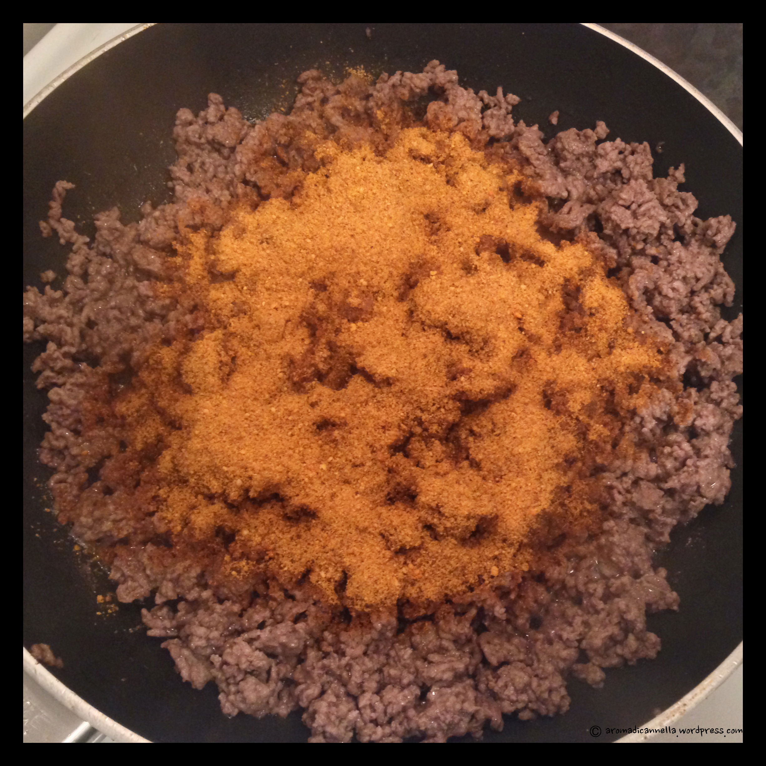 Cucinate la carne in una padella con un po’ d’olio. Quando la cottura è quasi ultimata aggiungete il mix di spezie per tacos e ultimate la cottura.