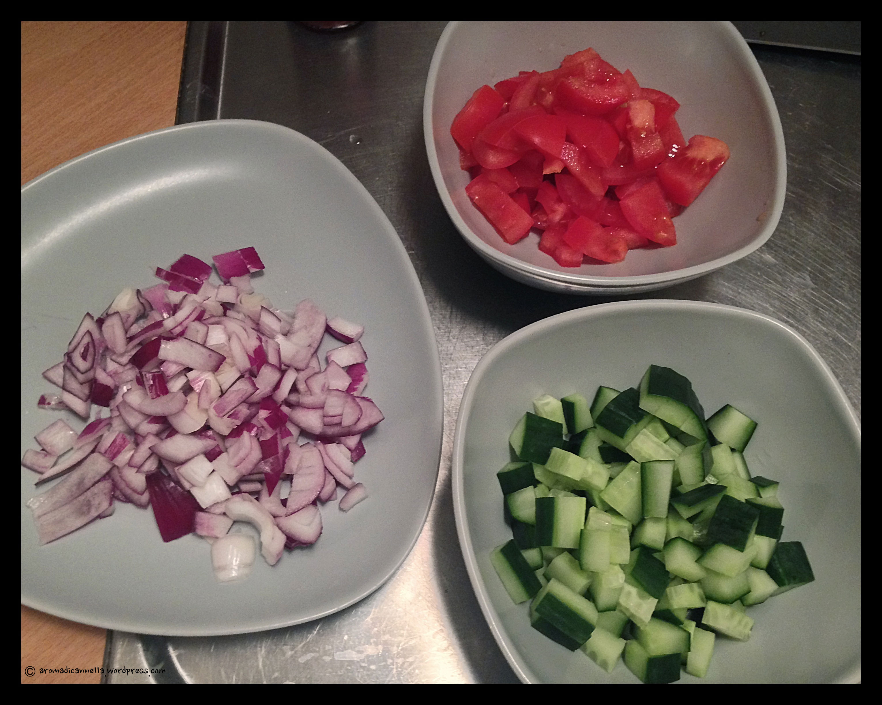 Dopo aver scelto gli ingredienti, aver volutamente omesso il cetriolo (mi spiace ma non ci vado d’accordo) e aver disposto tutto con cura per la foto,