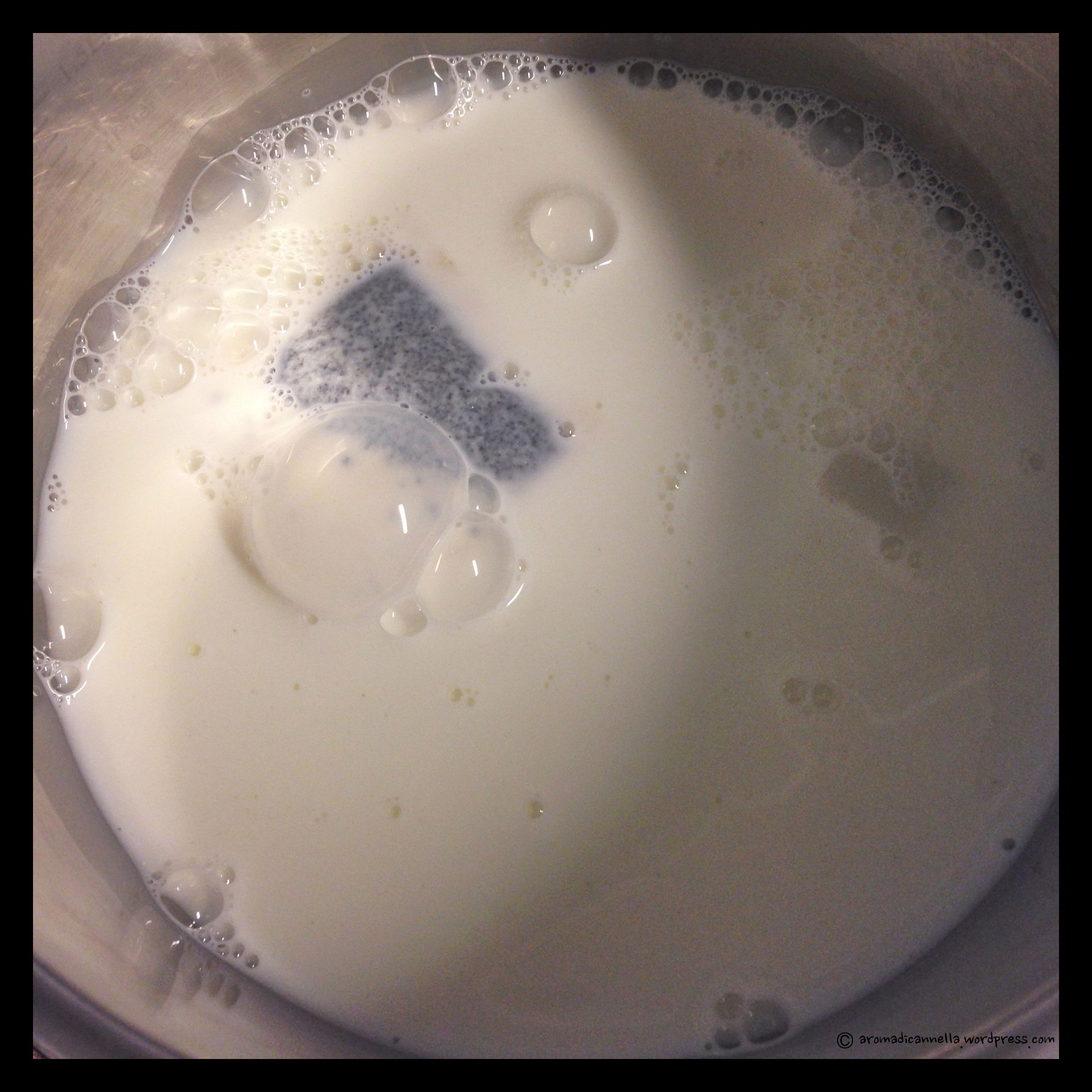 In un pentolino ponete lo zucchero e la bustina di tè, versate il latte e lasciate in infusione a fiamma moderata.