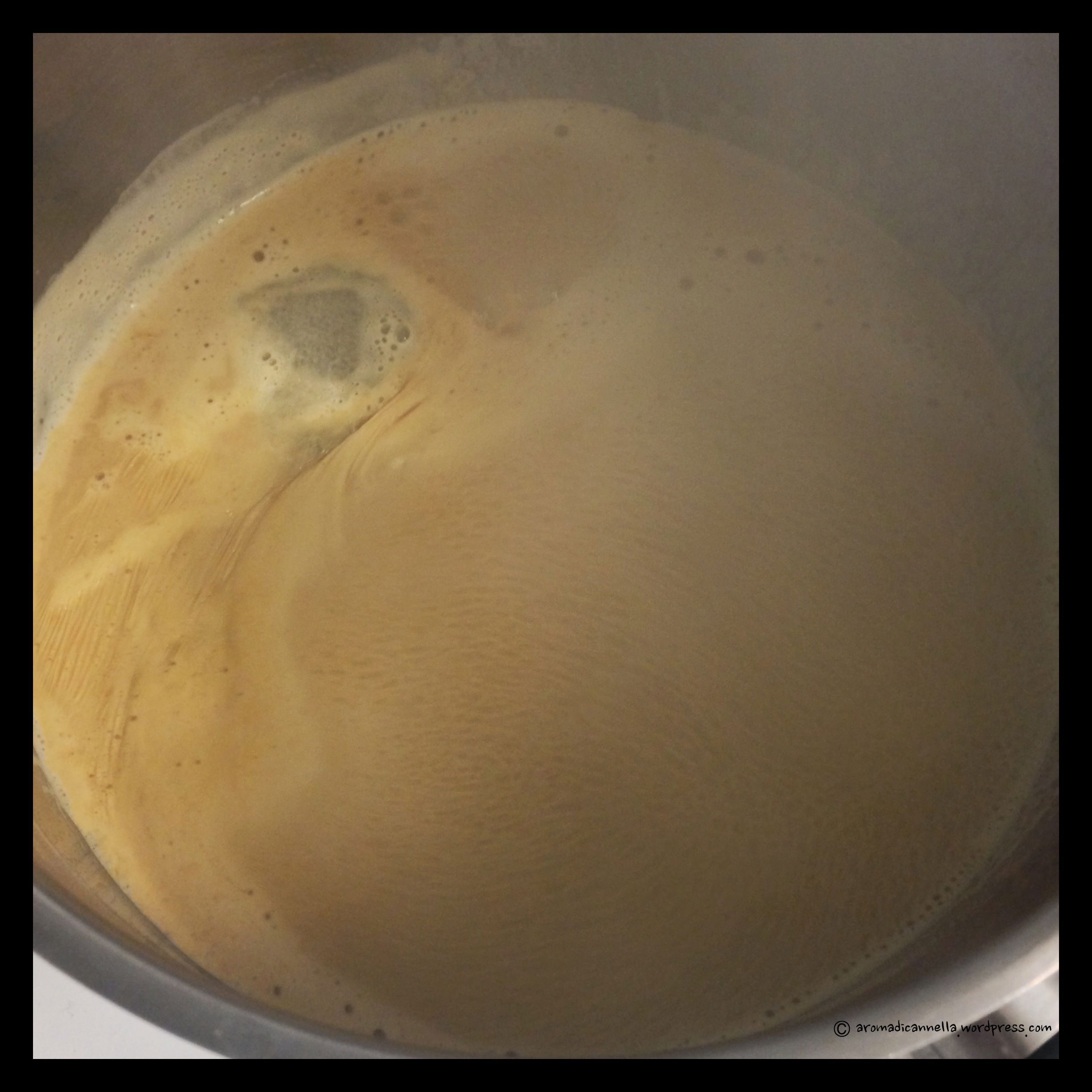 Il latte non deve bollire né formare la “pellicina”. Mescolate di tanto in tanto fino a quando il latte non si sia ben fuso con il tè, acquisendo il tipico colore marroncino.