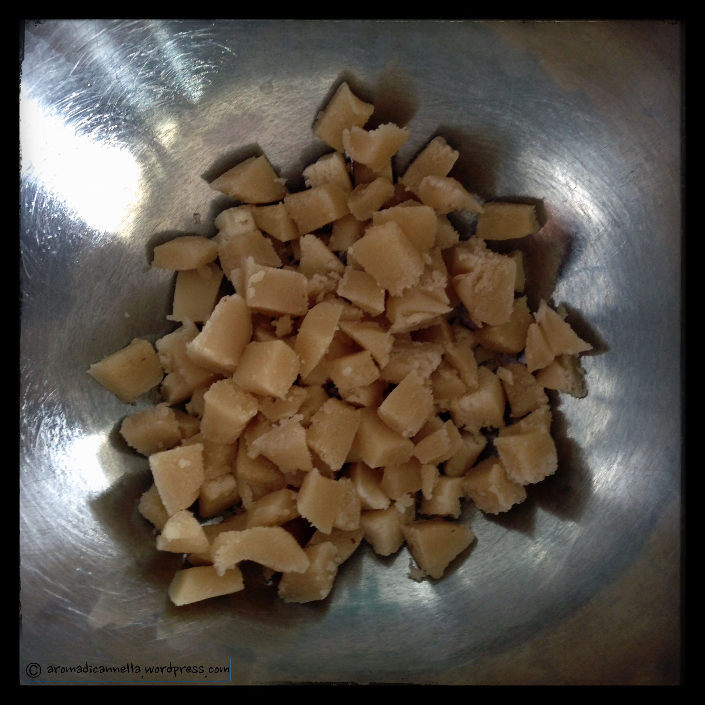 Cominciate tagliando a cubetti il marzapane e la pasta di mandorle e aggiungete il cioccolato tagliato grossolanamente.