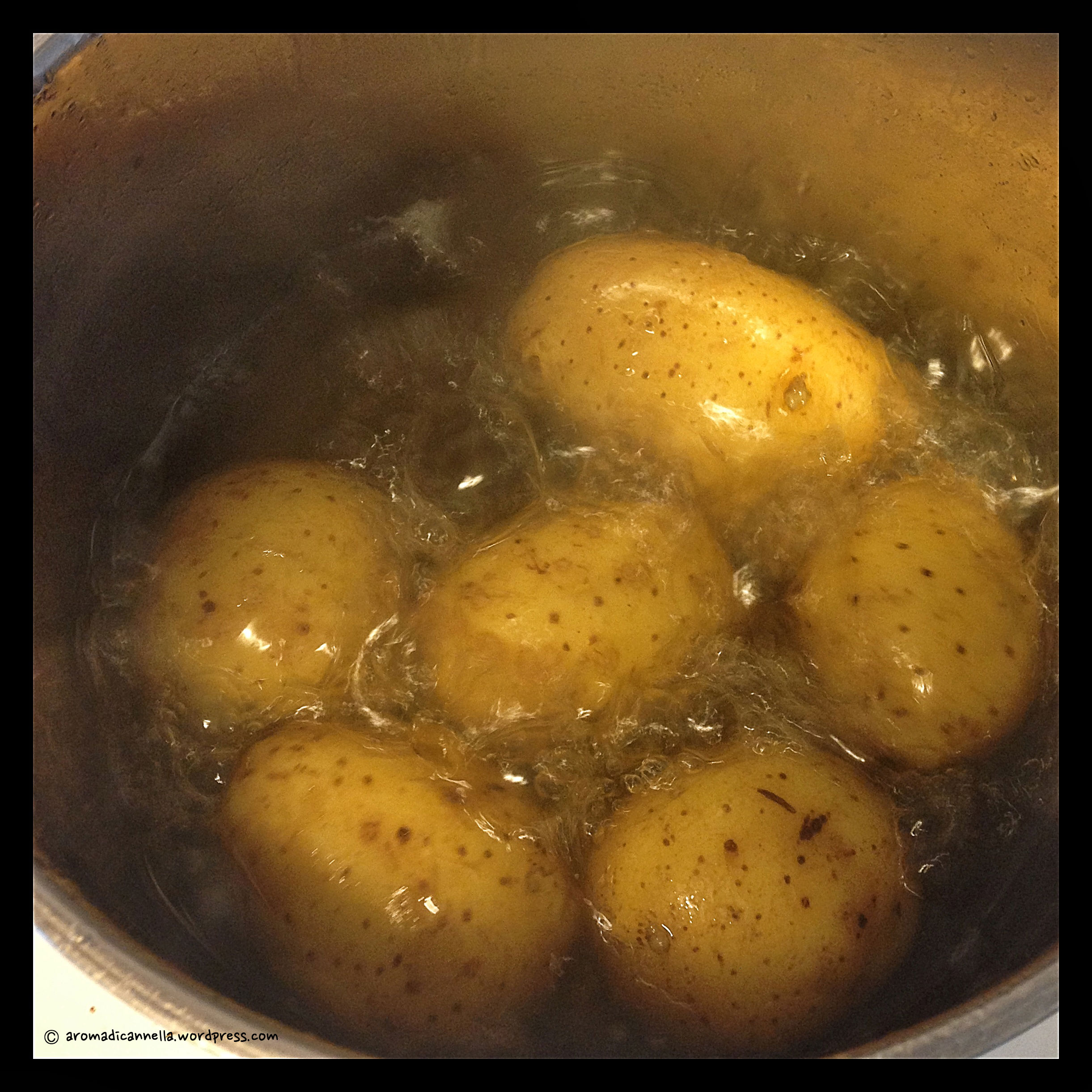 Lessate le patate in abbondante acqua salata per circa 40 minuti fino a quando non saranno morbide (fate la prova con una forchetta). Ancora calde, sbucciatele e tagliatele a cubetti.