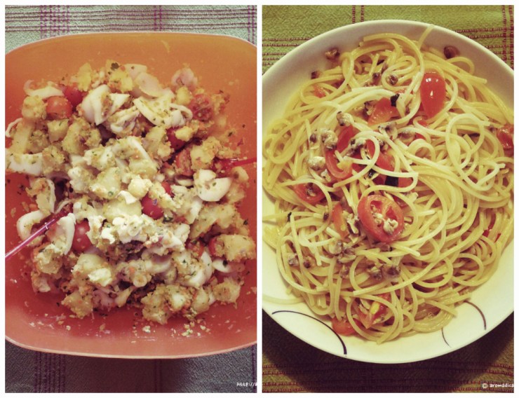 Da lunedì mi sono messa seriamente all’opera con la tesi. Nonostante sia ormai passato più di un mese da quando son tornata in Italia, il tempo serio da dedicare al più grosso impegno accademico dei prossimi mesi è sempre stato poco. Sicché, dopo essere stata in Spagna qualche giorno con le mie due canadesi a trovare le amiche spagnole (uno delle quali era quella della pizza tagliata con le forbici), ho deciso di dedicare (quasi) tutte le mie energie sulla tesi, che si sta dimostrando un lavoraccio non da poco. Ma chi mi conosce sa che se sono sotto pressione con l’università o generalmente stressata, cucinare è un modo per distendere i nervi e ricaricare le pile. Sicché ieri, dopo aver fatto un bel rifornimento di cose buone al supermercato con la mami, è stata la giornata pesce. Quindi per voi oggi ben due ricette: insalata di seppie e patate e il gran classico degli spaghetti alle vongole. Noi li abbiamo mangiati uno per pranzo e uno per cena, ma se volete fare una bella cena di pesce con gli amici vi posso proporre l’abbinamento. Molto semplice, facile e veloce, ma di grande efficacia!