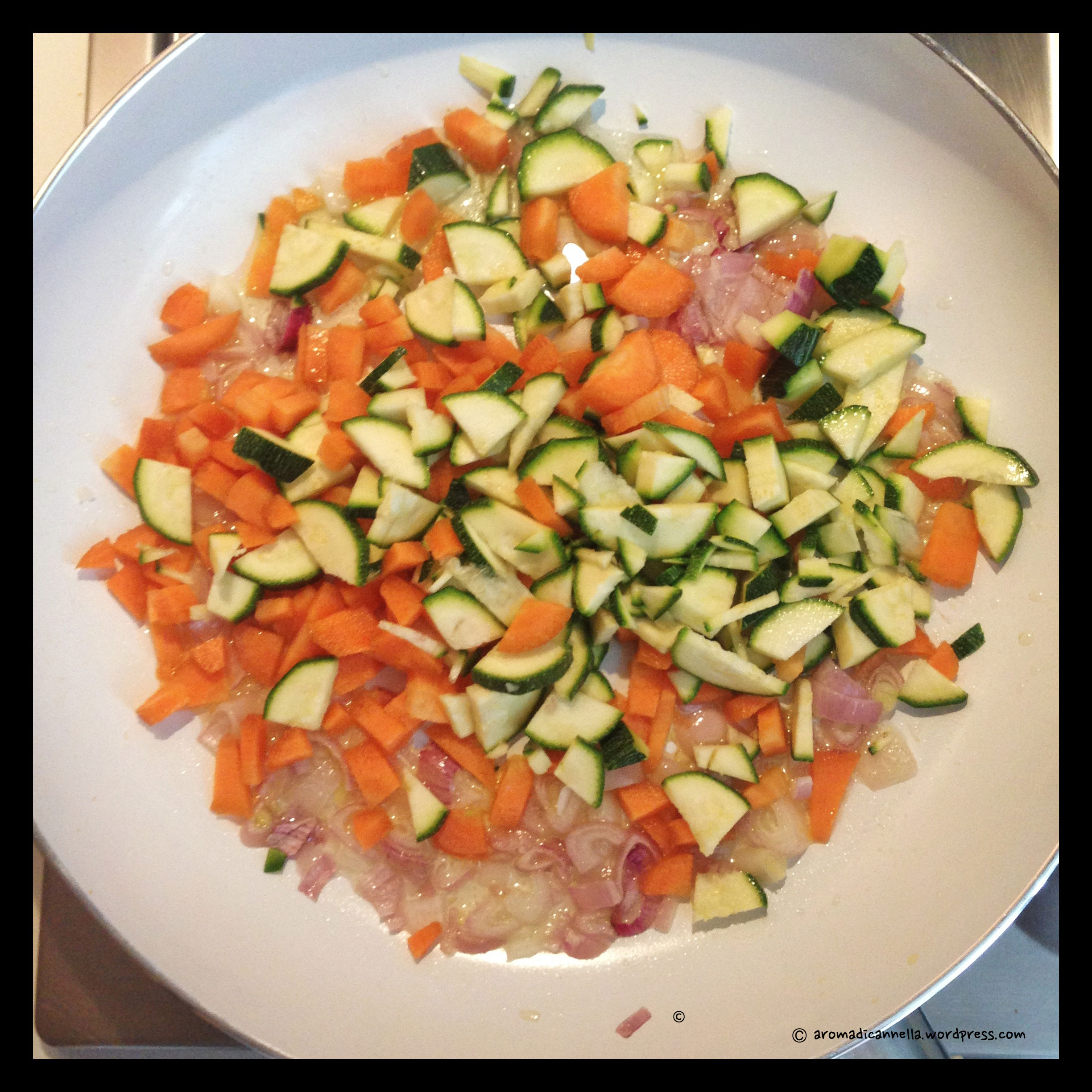 In una padella antiaderente rosolate con qualche cucchiaio d’olio e a fuoco vivace lo scalogno, la zucchina e la carota tagliati fini.