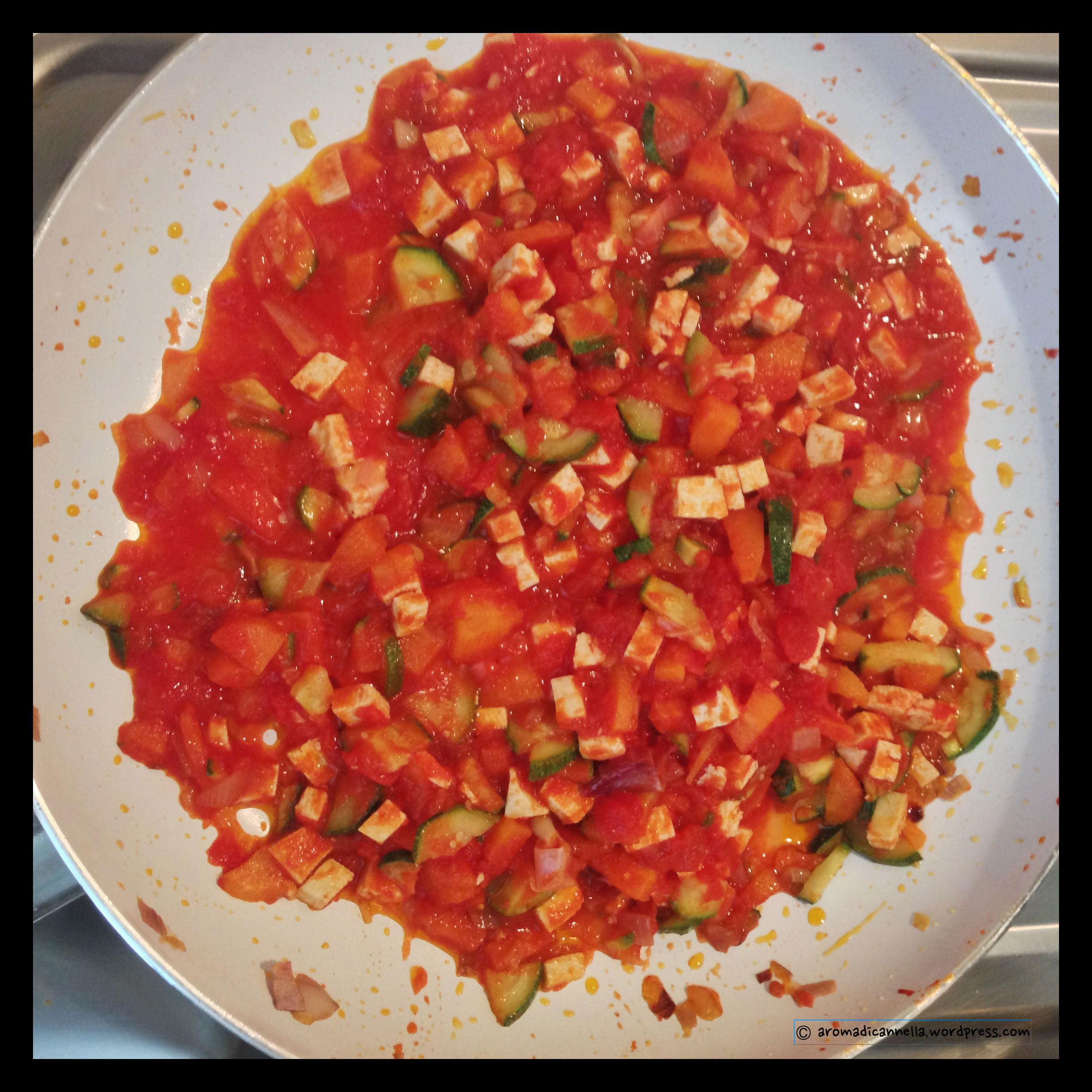 Salate e aggiungete il tofu tagliato a cubetti, rosolate per qualche minuto e poi aggiungete la passata di pomodoro. Salate e aggiungete un cucchiaino di zucchero (questa è nuova una strategia che da oggi adotterò, confidata da LZZ ; lo zucchero toglierebbe l’acidità del pomodoro, buono a sapersi!). Abbassate il fuoco e fate cuocere coperto.