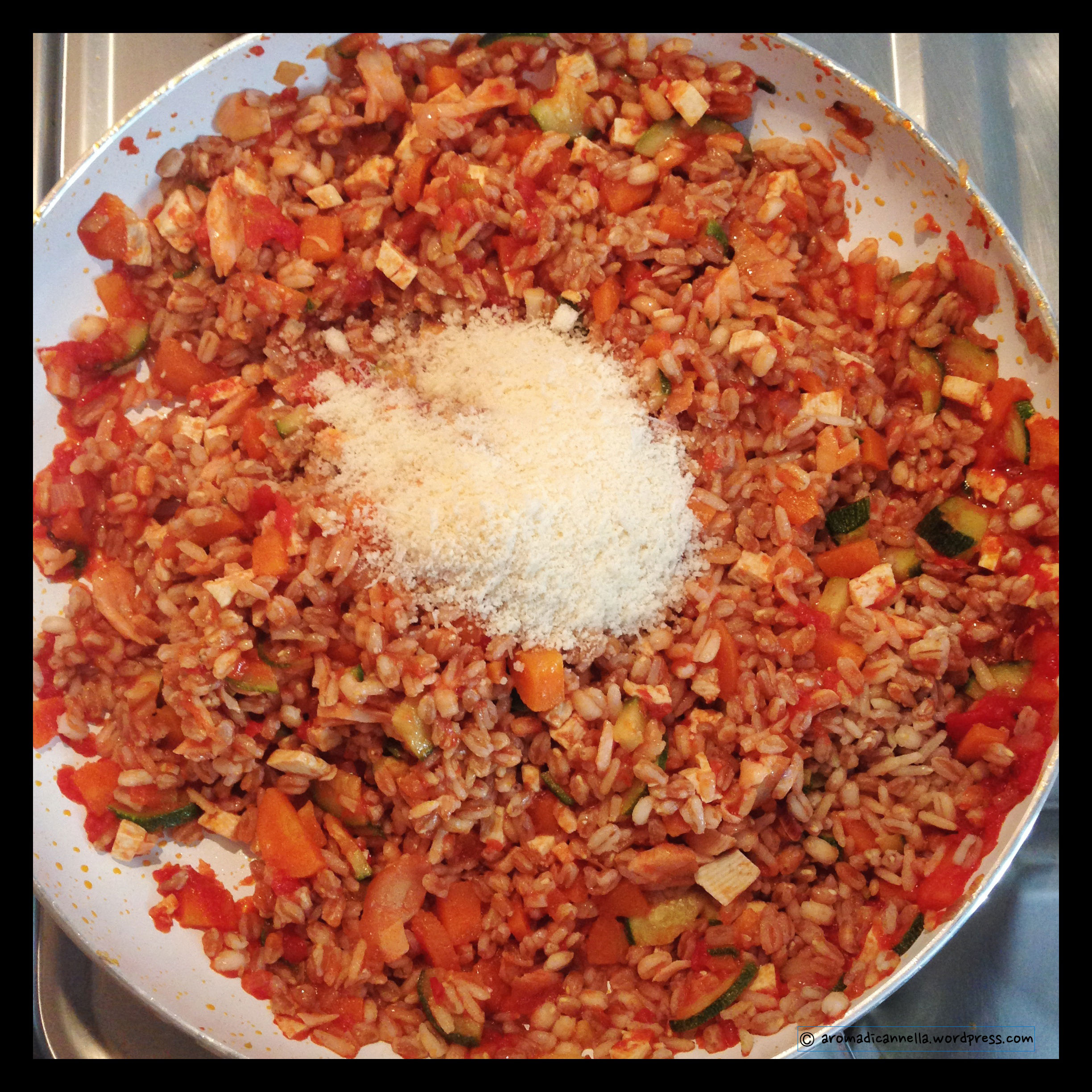 Quando le verdure sono quasi cotte (e anche il vostro farro, se vi siete ricordati di buttarlo in acqua), aggiungete il salmone tagliato a listarelle. Unite il farro scolato e poi se volete un paio di cucchiai di parmigiano grattugiato per rendere un po’ più cremoso il sugo (ma qui va a piacere, io di solito non aggiungo il formaggio con il salmone, ma il suggerimento di LZZ ha comunque portato ad un ottimo risultato).