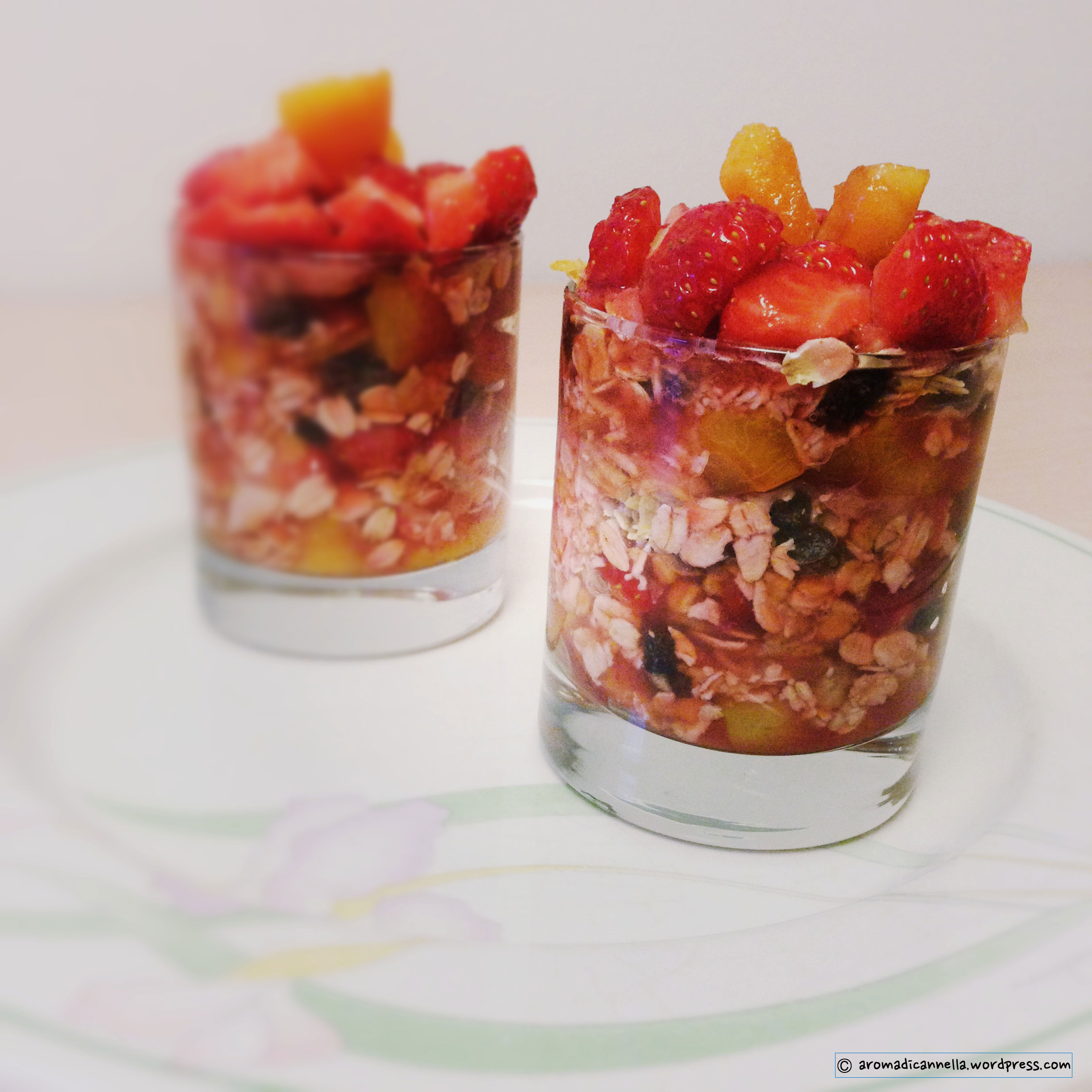 Noi abbiamo fatto così: albicocche, salsa, muesli, salsa, fragole, muesli, salsa, albicocche, salsa, muesli, salsa, fragole e albicocche.
