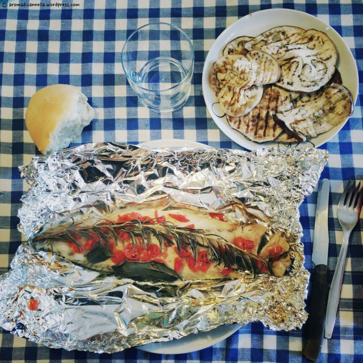 Et voilà! Ombrina al cartoccio con melanzane grigliate preparate con amore e pazienza dalla sorellina.