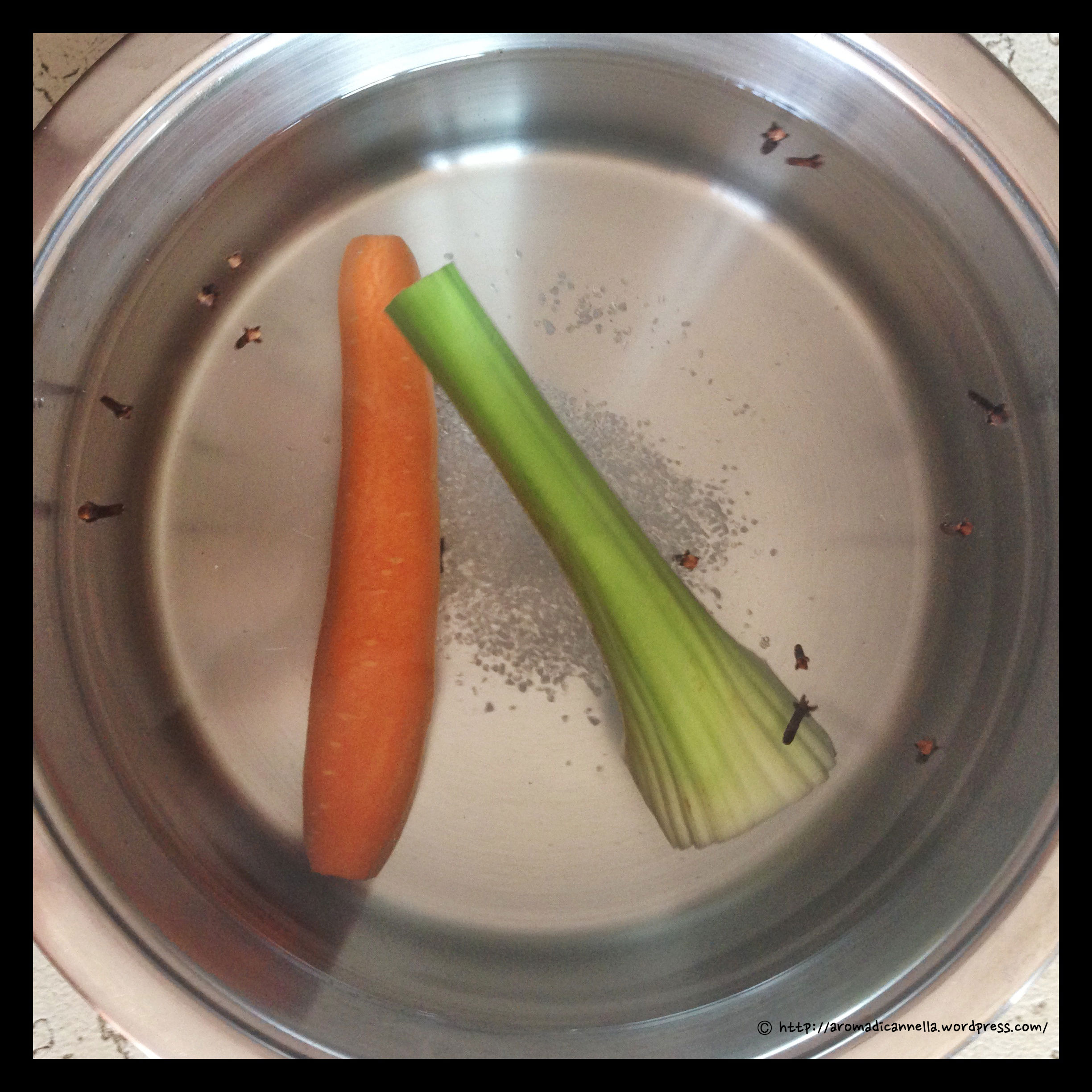 Riempite una pentola capiente con dell’acqua e immergetevi la carota sbucciata, il sedano, il sale grosso e qualche chiodo di garofano. Portate ad ebollizione e immergete i polipetti. Cucinate a fuoco basso per 20-25 minuti.