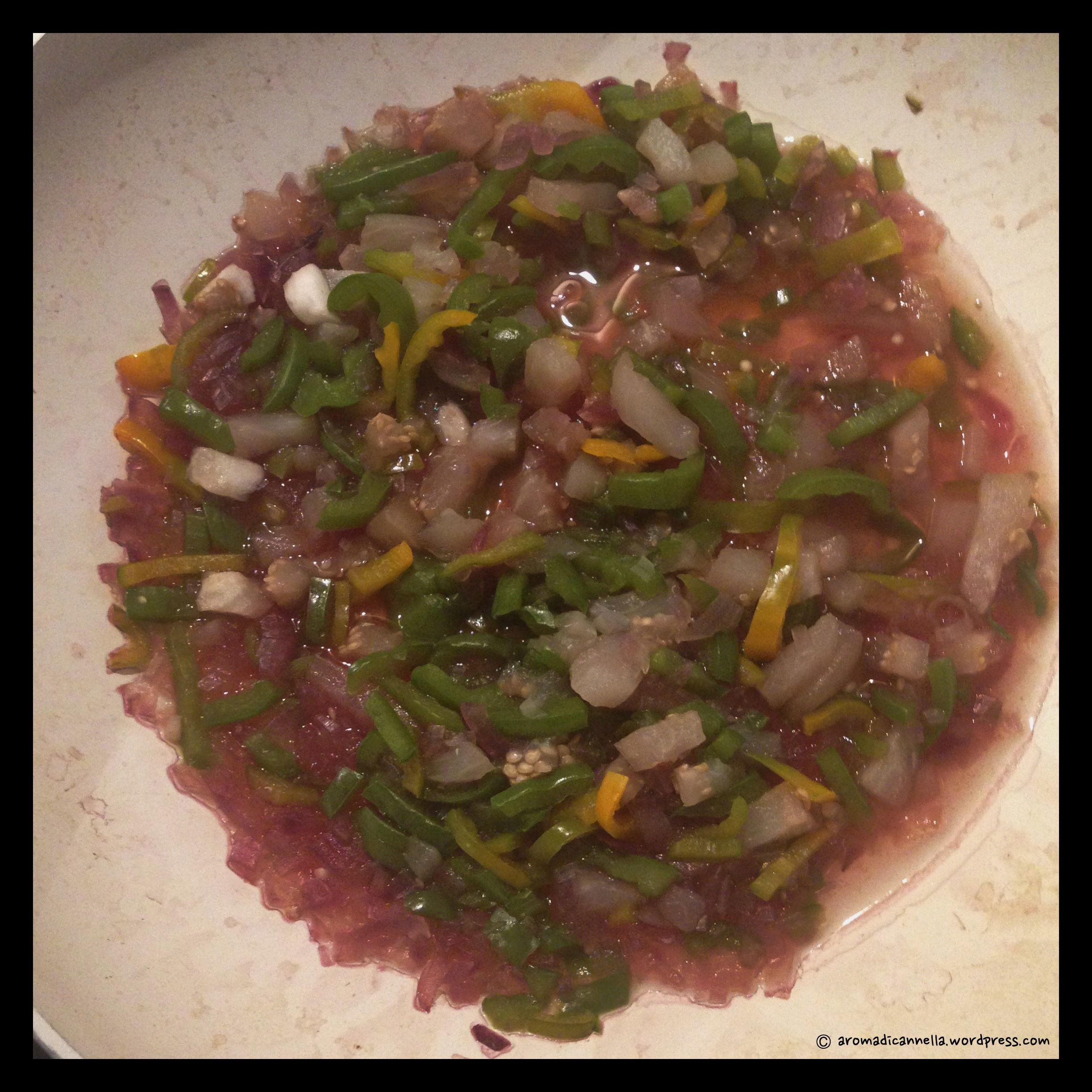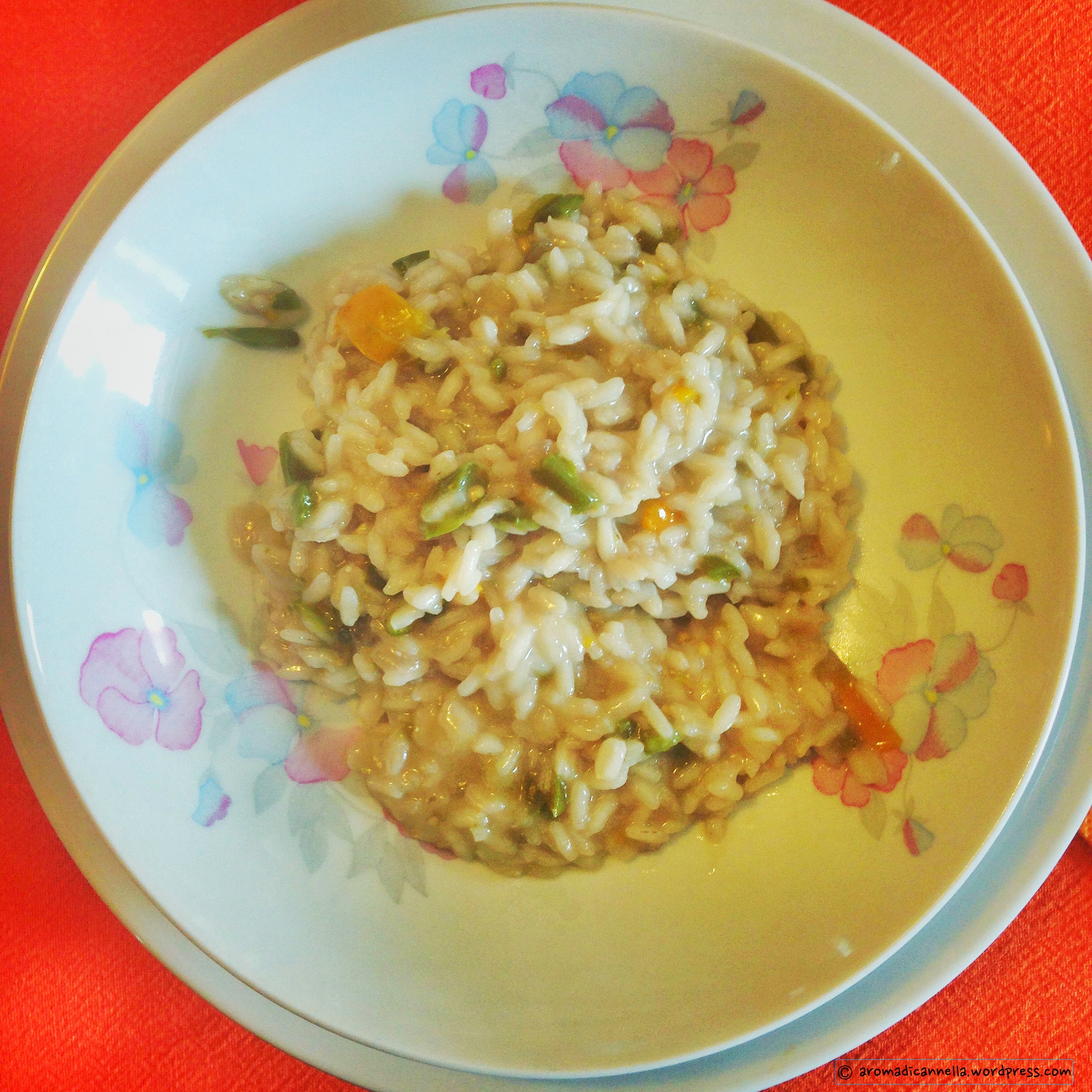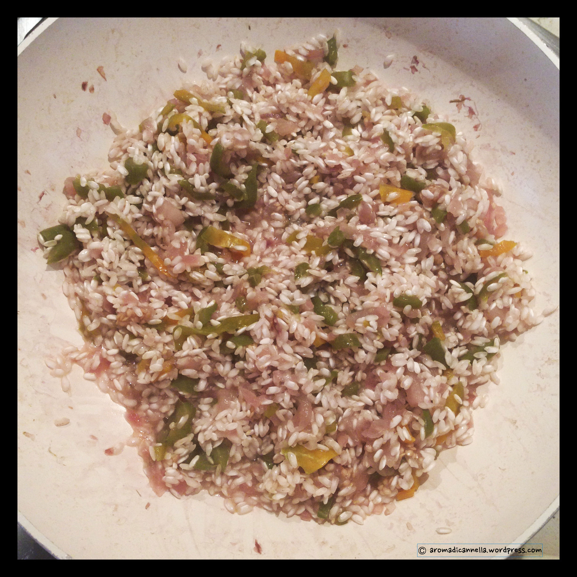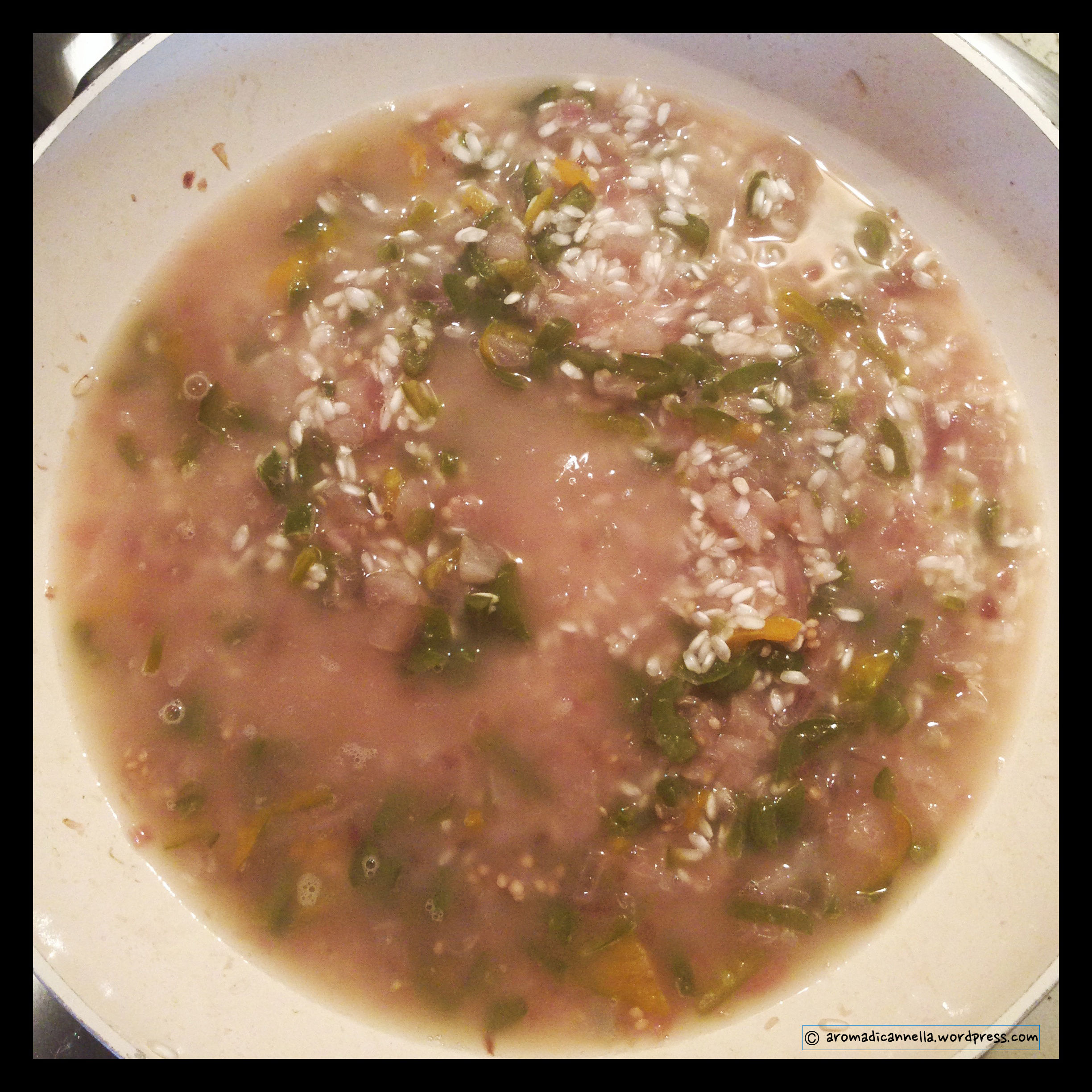 Naturalmente al papi è toccato il primo: un buon risottino vegetariano con peperoni verdi, melanzane e cipolle di Tropea.