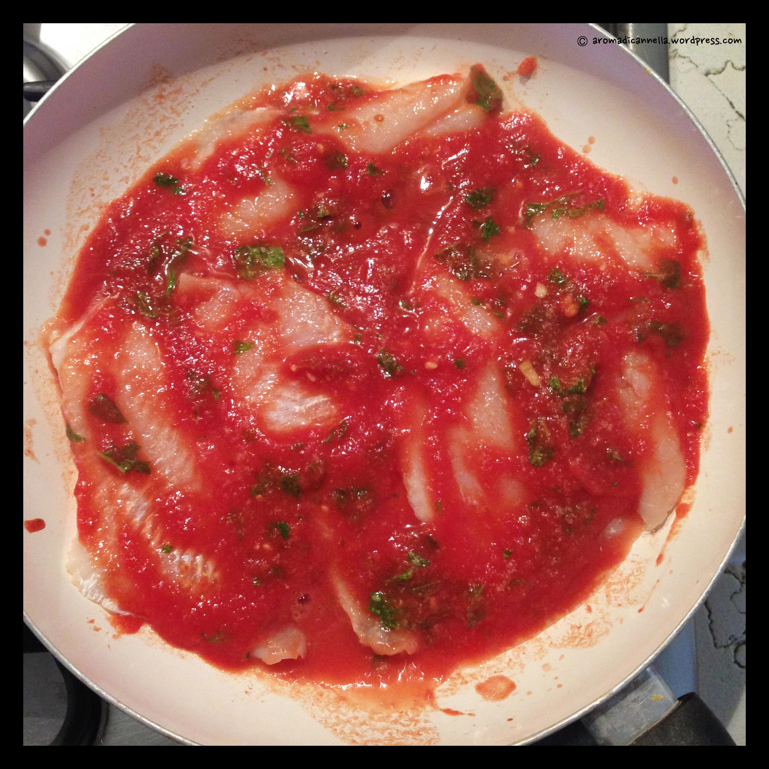 Lavate i filetti di scorfano e asciugateli bene. Sporcate una padella antiaderente con un po’ di pesto per evitare che il pesce si attacchi in cottura – non dovrebbe essendo la pentola antiaderente, ma io lo faccio sempre per precauzione, il pesce è terribile!