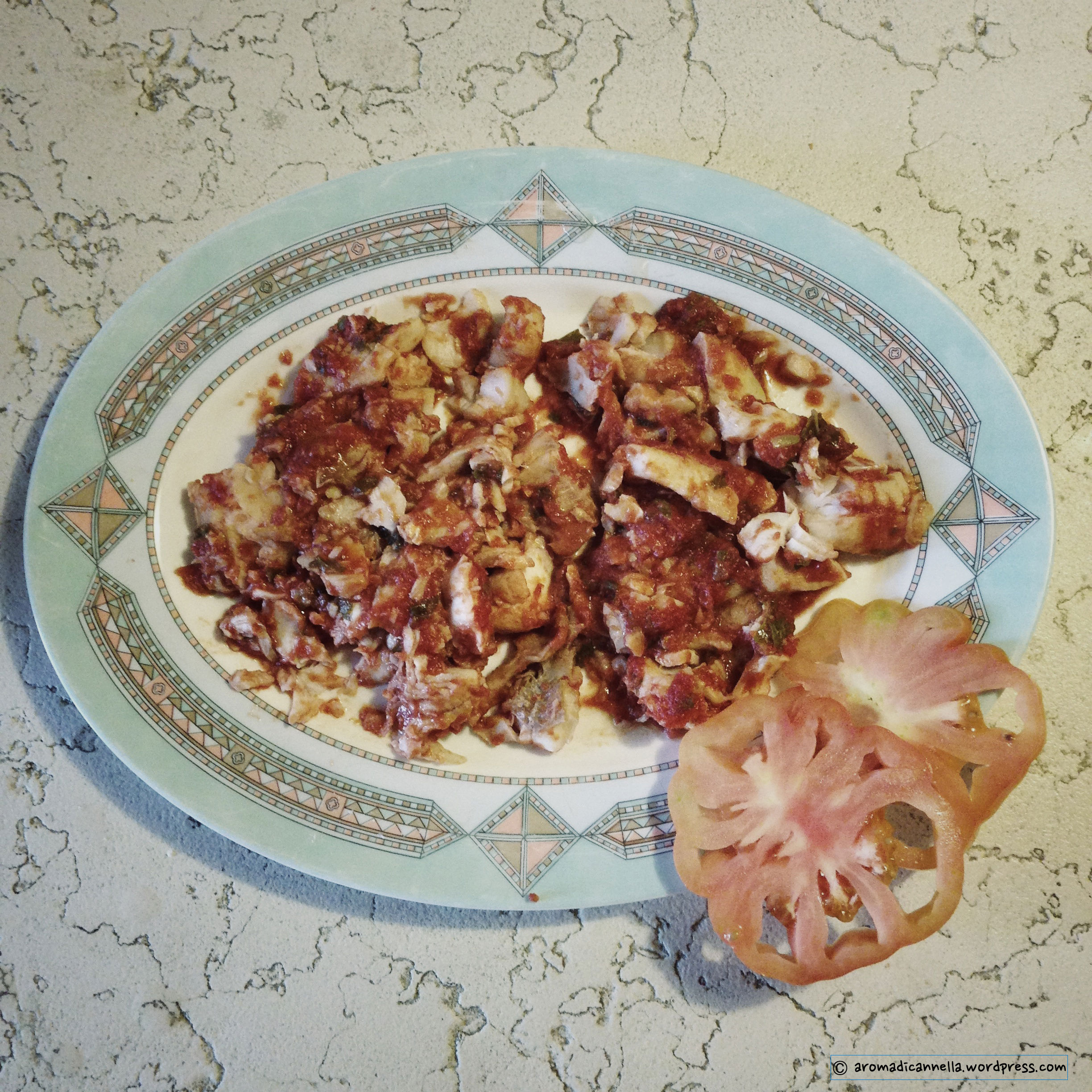 Procedete ad una cottura vivace per dieci minuti, rigirando il pesce. Così verrà fuori lo spezzatino, perché lo scorfano è talmente morbido che si ridurrà in pezzetti quando lo girerete.