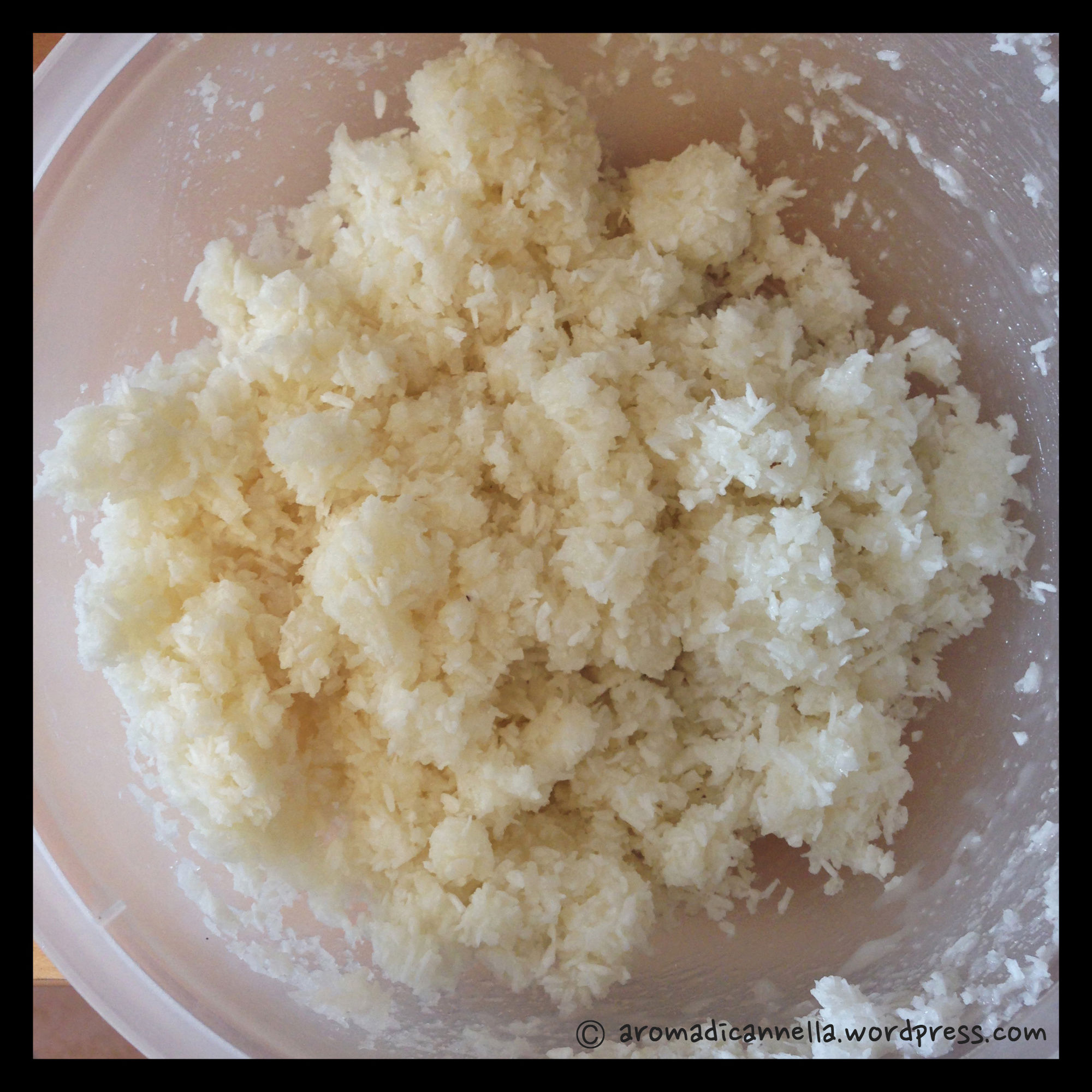 Passate alla preparazione del ripieno di cocco. In una ciotola mescolate il cocco grattuggiato, lo zucchero, la fecola e il latte, fino ad ottenere un impasto compatto e lavorabile.