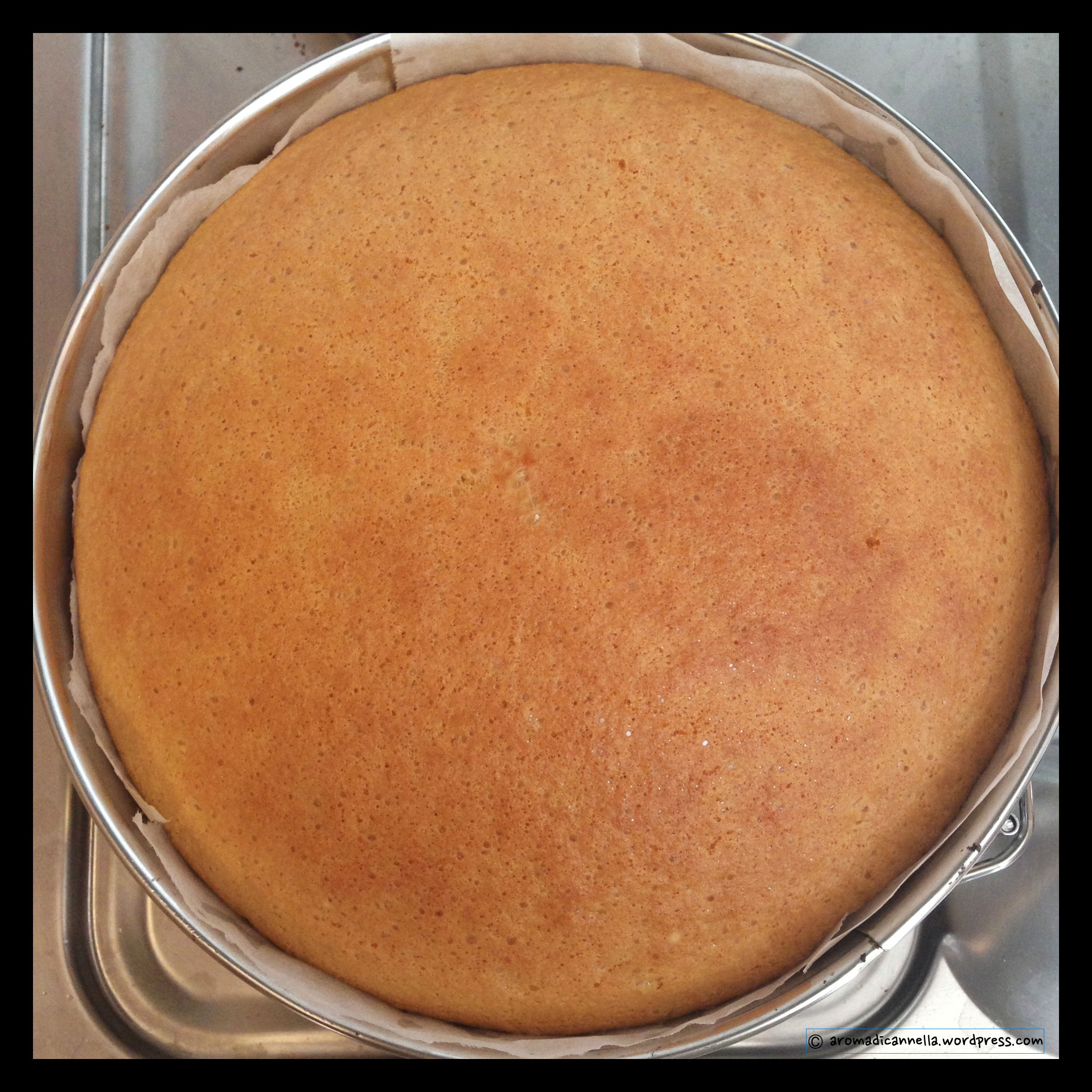 Versate il composto in una tortiera con gancio rivestita di carta da forno e infornate per 30/40 minuti in forno già caldo a 175°. Tenete d’occhio che il Pan di Spagna non si bruci in superficie; se dovesse cominciare a scurirsi, coprite con un foglio di carta d’alluminio e controllate sempre la cottura – A. mi diceva che con il suo forno ci vogliono 40 minuti, con il mio ne sono bastati poco più di 30.