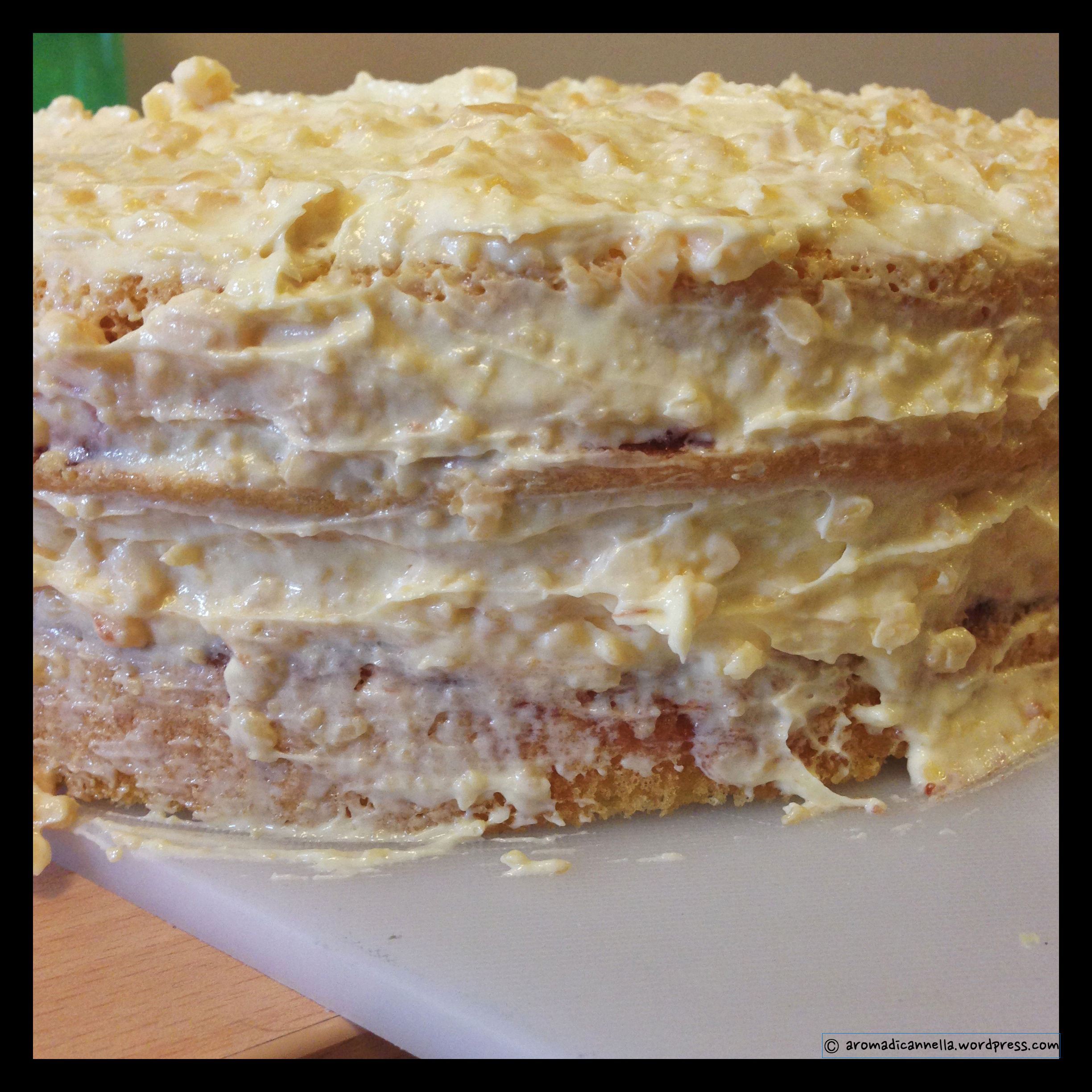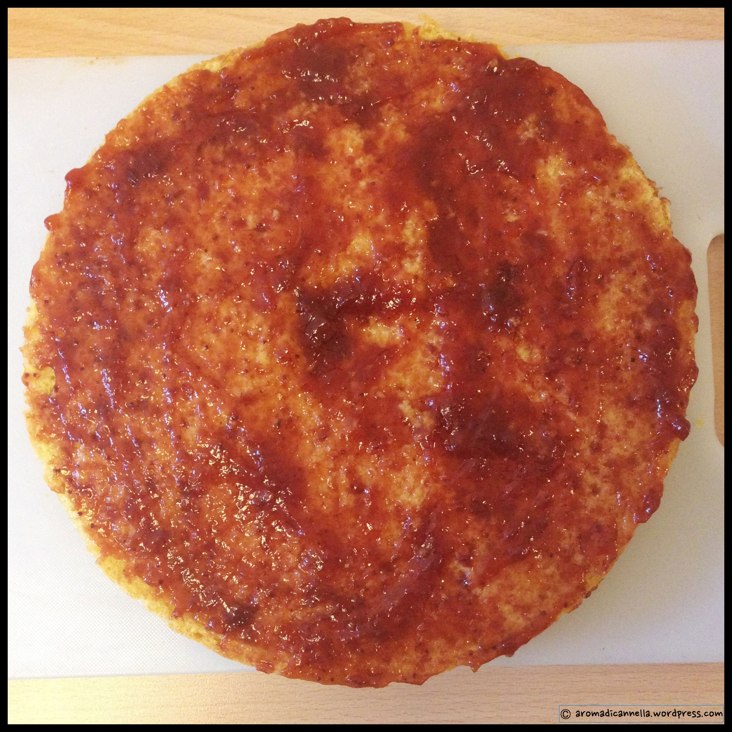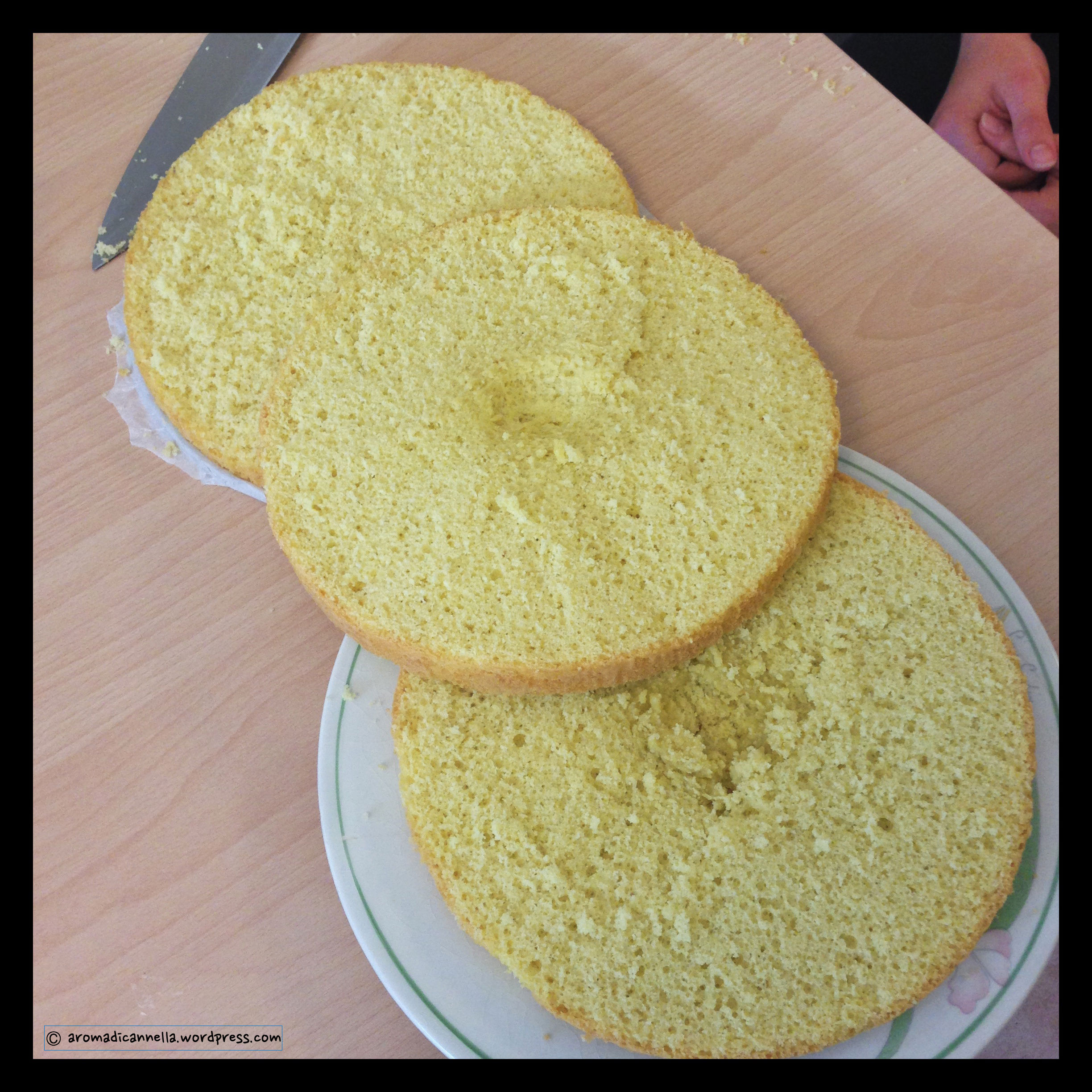 Tagliate il Pan di Spagna in tre parti – io ho lasciato l’onere ad A. perché sono pessima in queste cose.