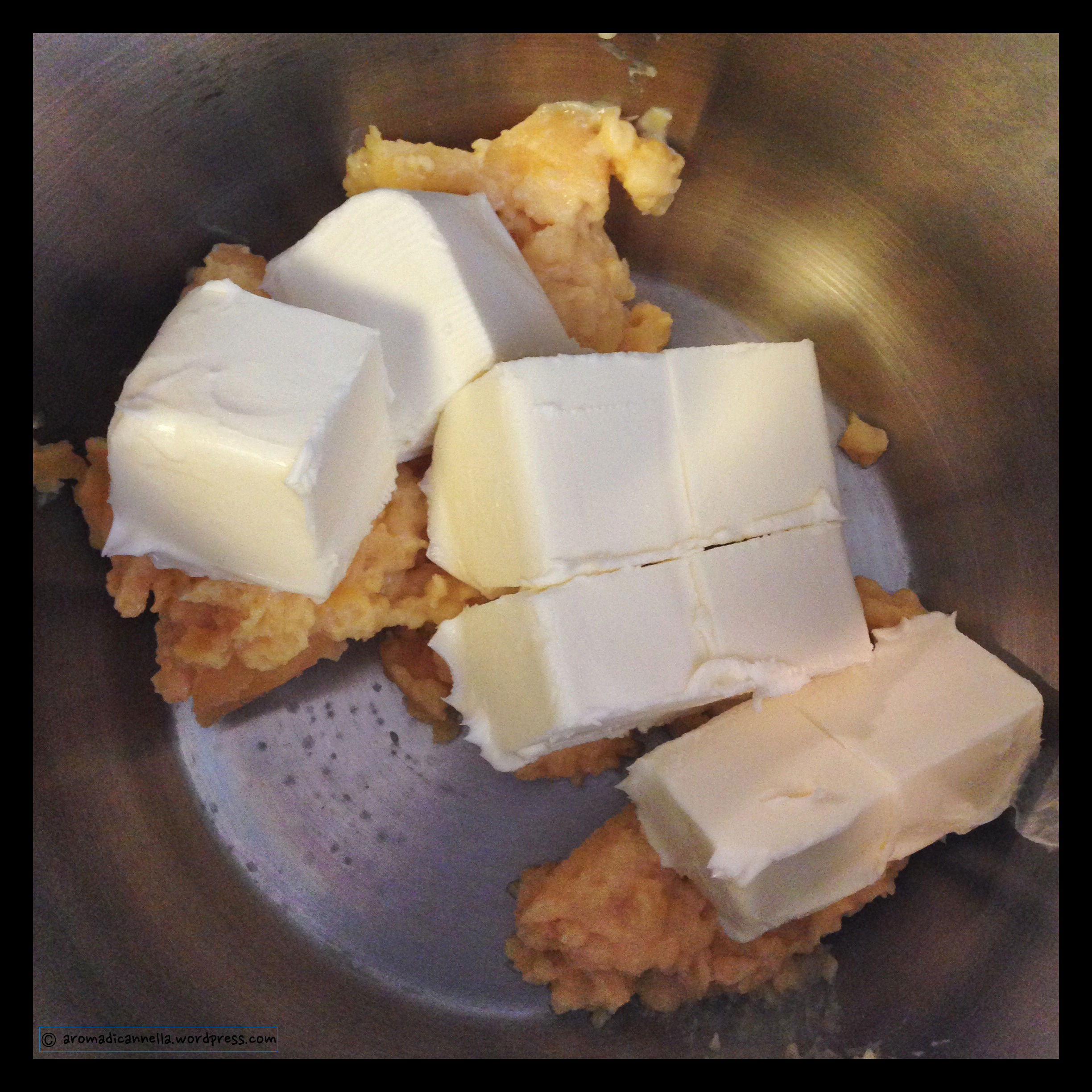 Dopo aver fatto intiepidire, ponete il budino in una ciotola e aggiungete il burro (noi, tanto burro). Sbattete nuovamente fino ad ottenere un composto piuttosto omogeneo. Ponete in frigo per 15 di minuti.