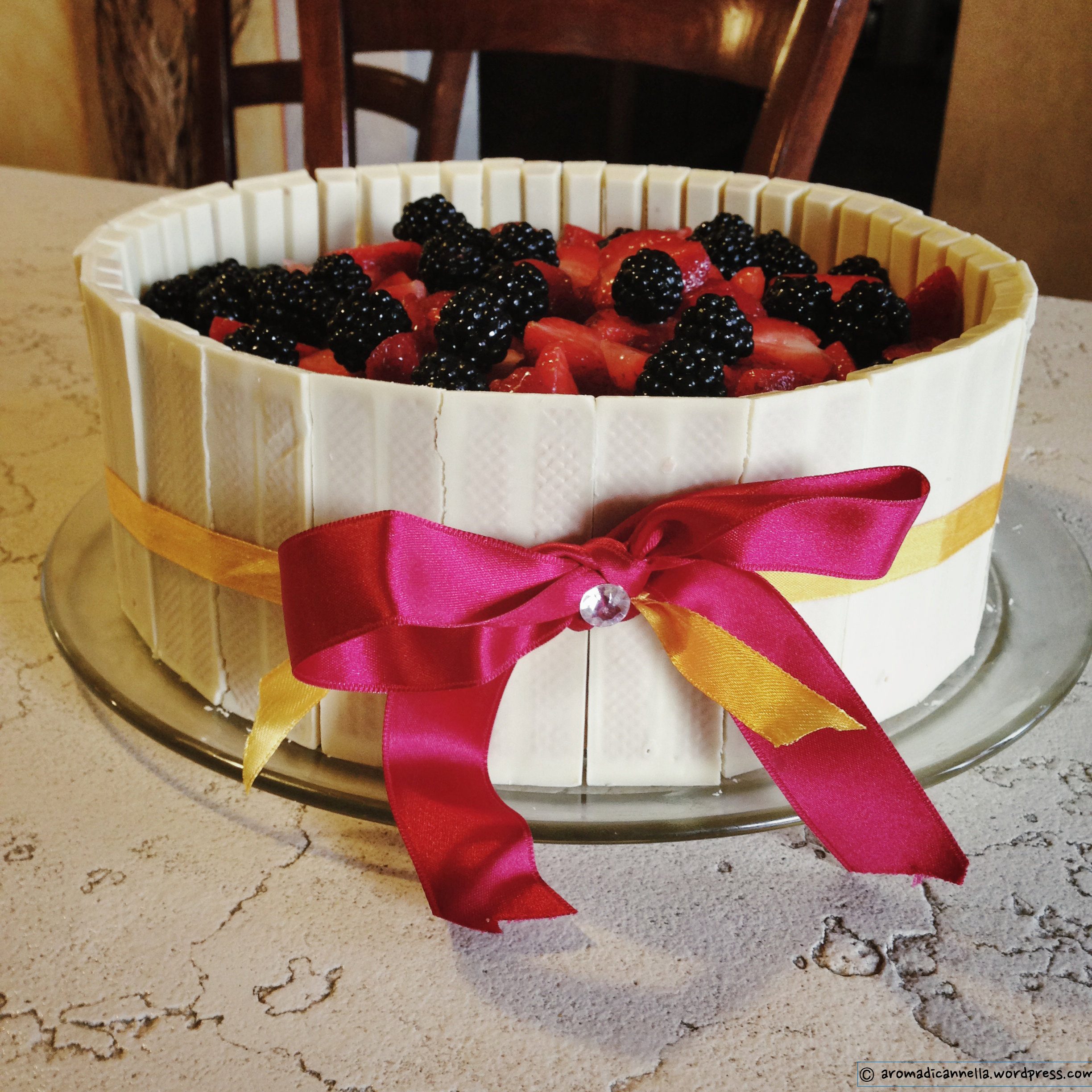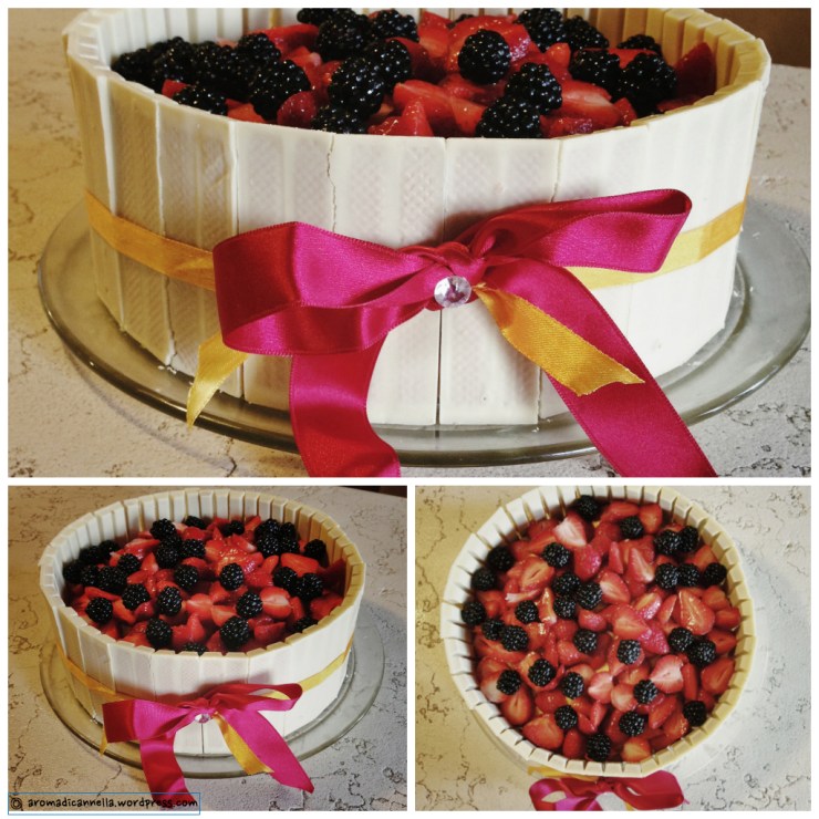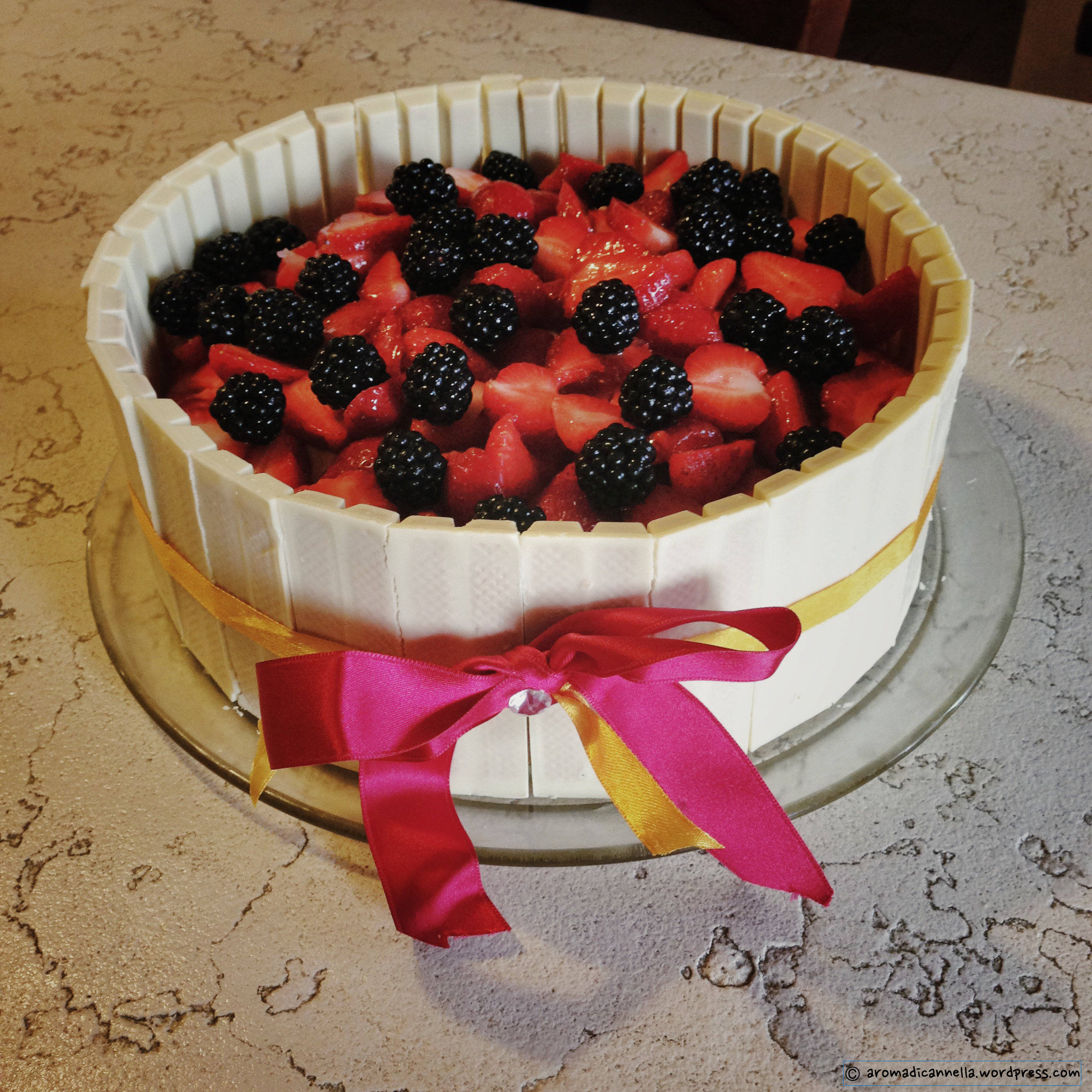 Torta Matilde richiama un cestino di frutta (fragole e more). E’ un dolce fatto di Pan Di Spagna e farcito con crema pasticcera al limone. L’ingrediente per i più golosi è il kitkat al cioccolato bianco, soluzione a cui ho dovuto ripiegare non potendo trovare gli appositi – e più carini – bastoncini arricciati di cioccolato – che, ahimé, qui si trovano solo nei negozi specializzati di pasticceria.