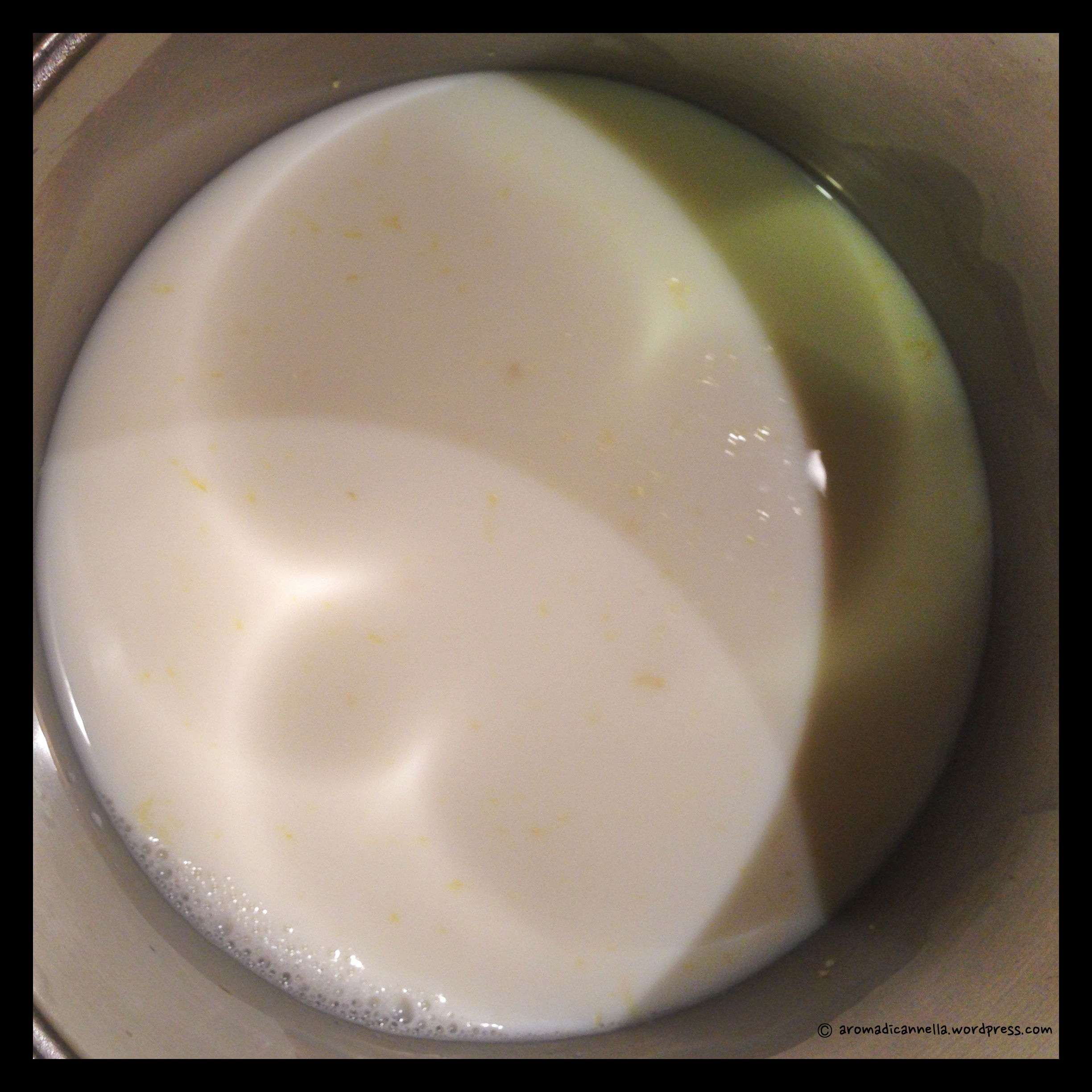 In un pentolino capiente ponete il latte con la scorza grattuggiata del limone e accendete un fuoco dolce. Quando il latte sfiorerà il bollore, spegnete e filtratelo con un colino.