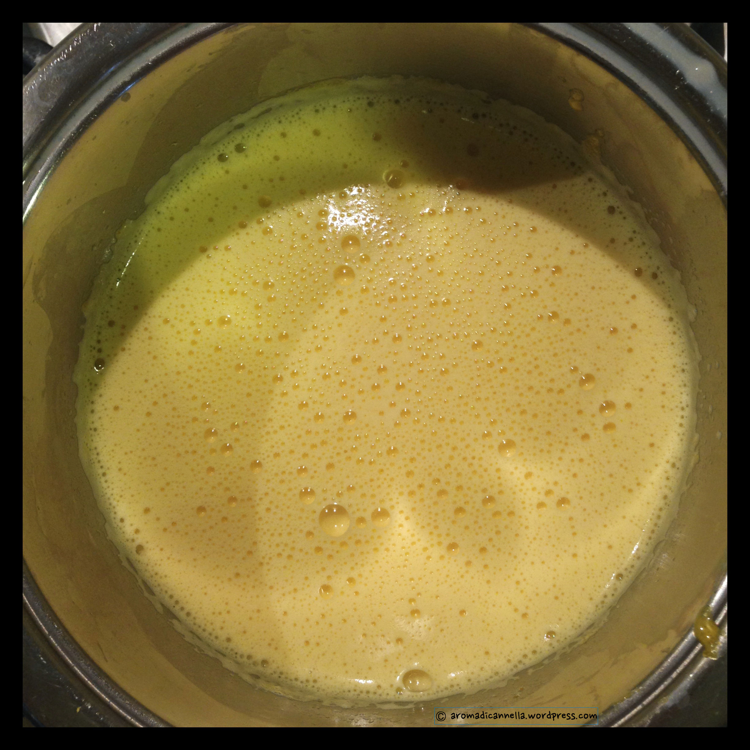 Unite il composto al latte aromatizzato al limone e accendete nuovamente il fuoco dolce, mescolando continuamente con una frusta per addensare.
