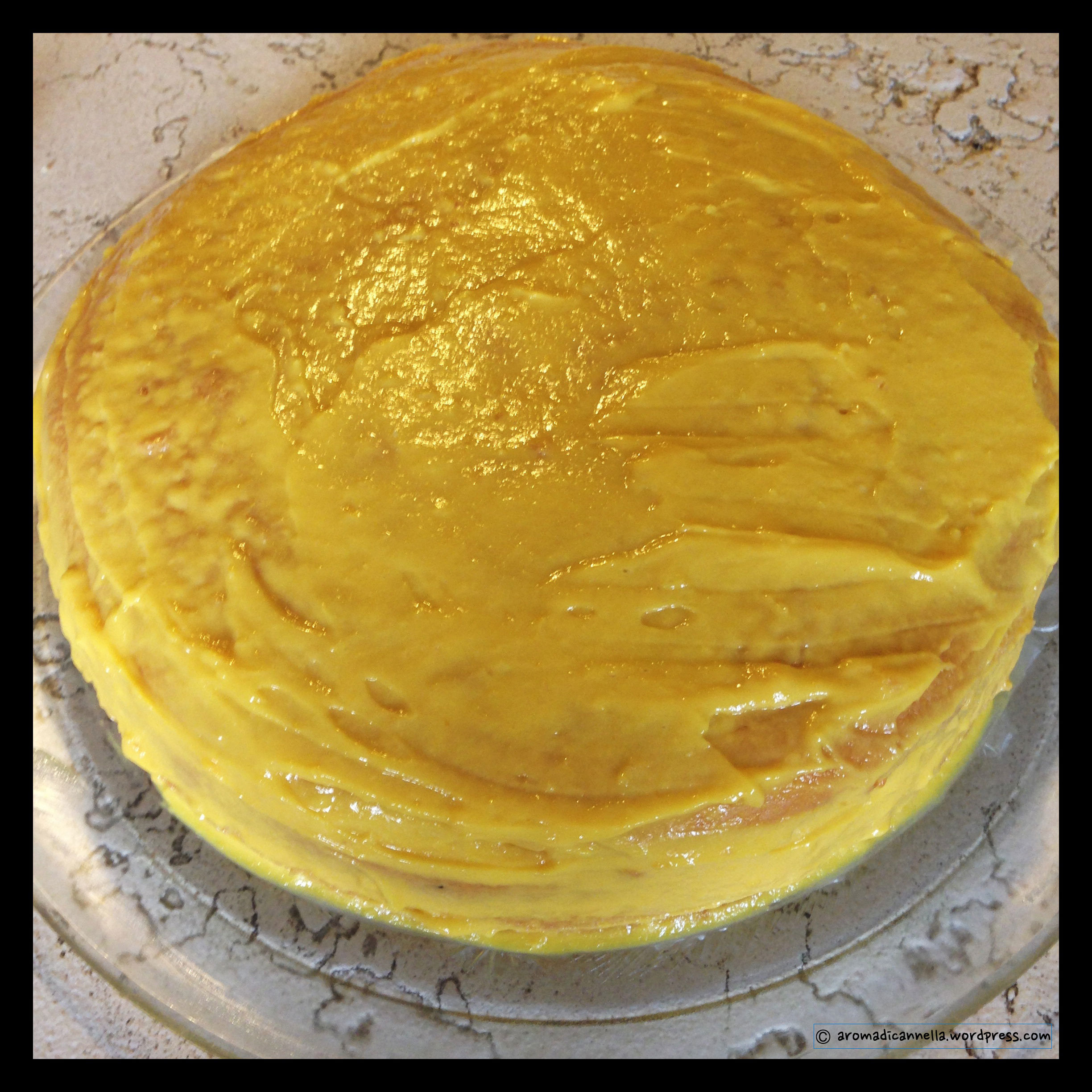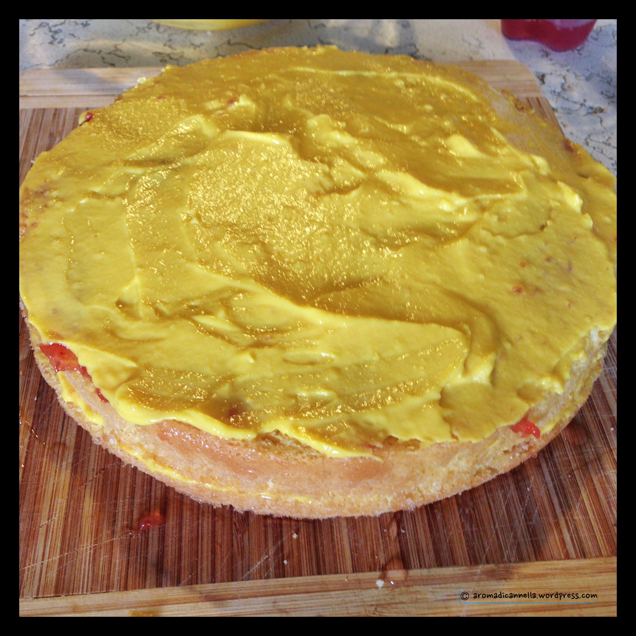 Dopo aver tagliato il Pan di Spagna in tre parti, passatelo con la bagna e farcite con un velo di marmellata di fragole prima e con la crema pasticcera poi, ricordandovi di tenerne da parte un po’ per ricoprire la torta.