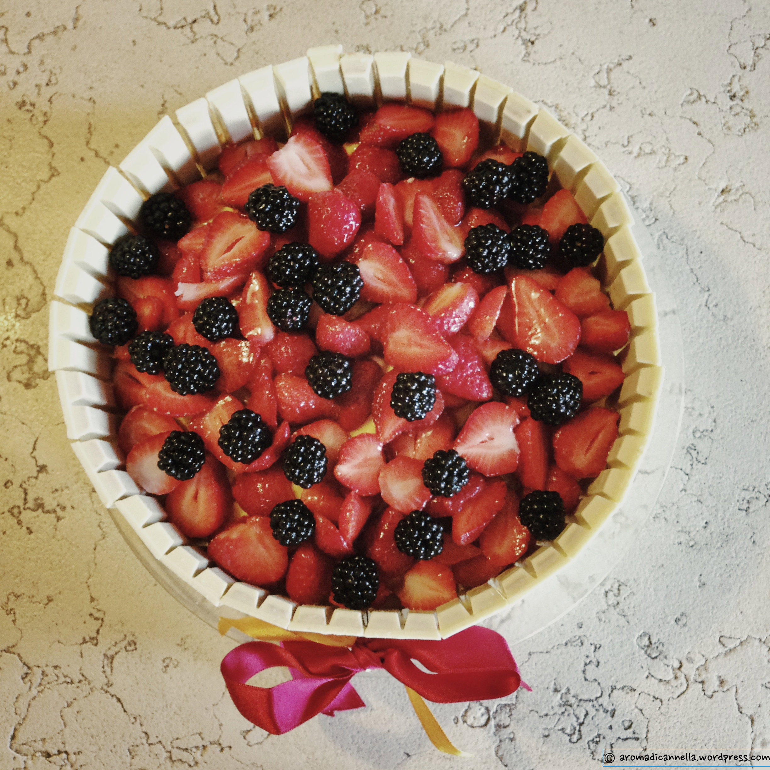 Ponete le fragole tagliate dapprima in modo da coprire completamente la superficie, poi in secondo strato assieme alle more.