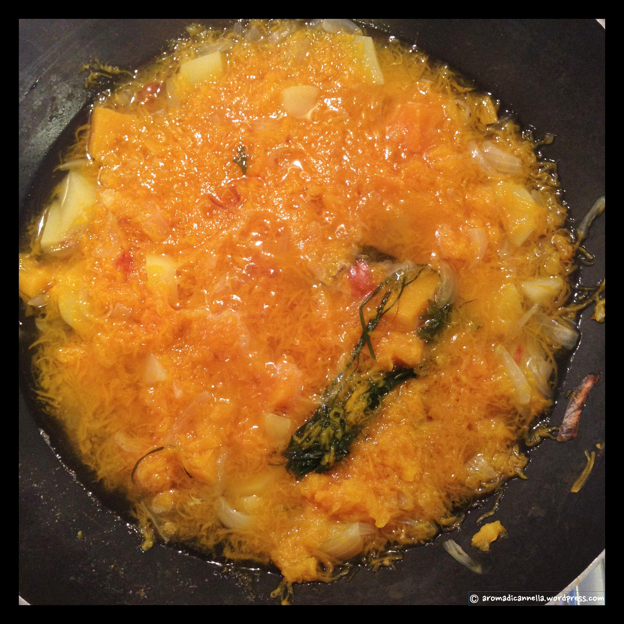 In una padella capiente fate appassire la cipolla tagliata fine con un goccio d’acqua e un pizzico di sale. Aggiungete poi le patate e la zucca tagliate a quadrotti e rosolate per qualche minuto a fuoco vivace.