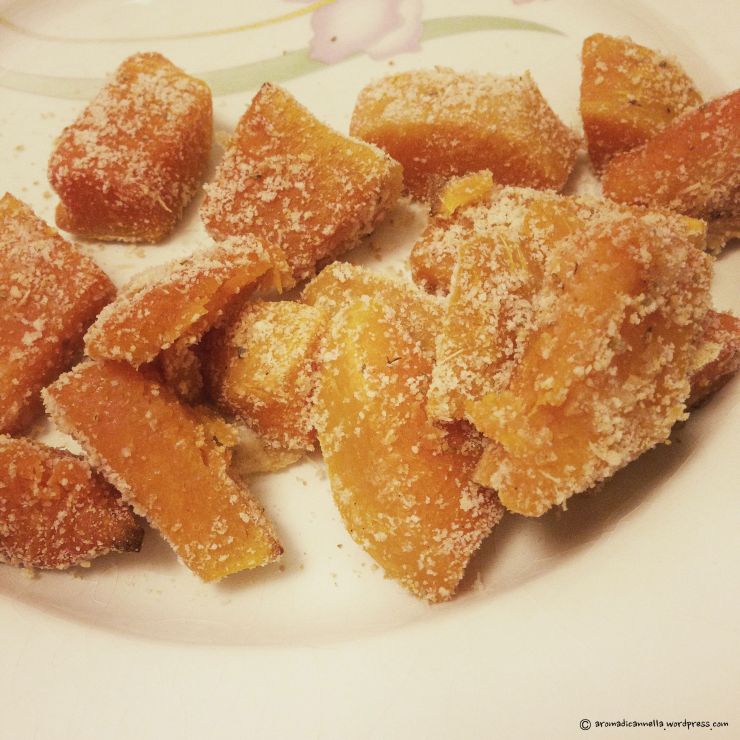 In un piatto ponete il pan grattato, il parmigiano, il sale e l’origano e sporcateci per bene la zucca, che metterete poi in una teglia di vetro.