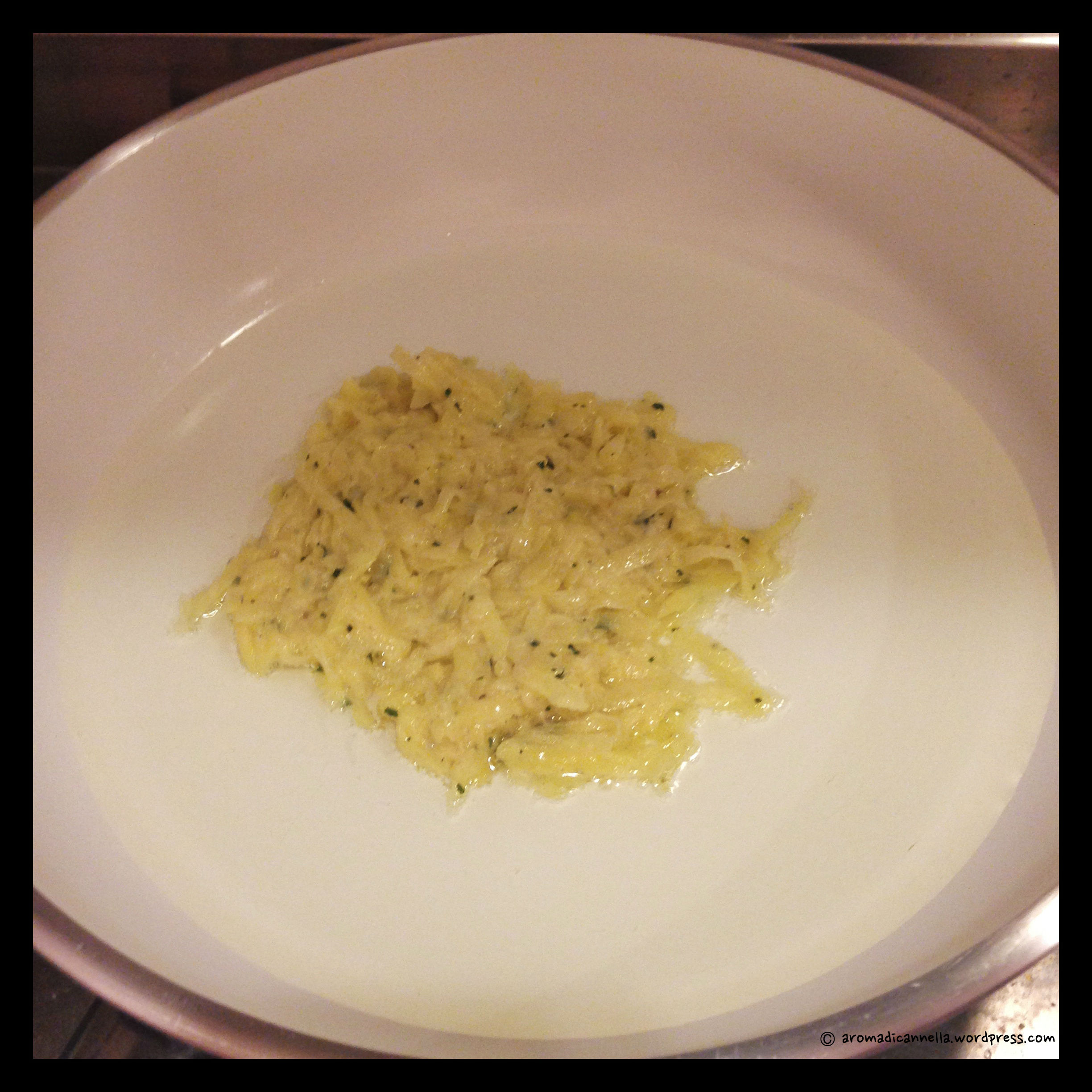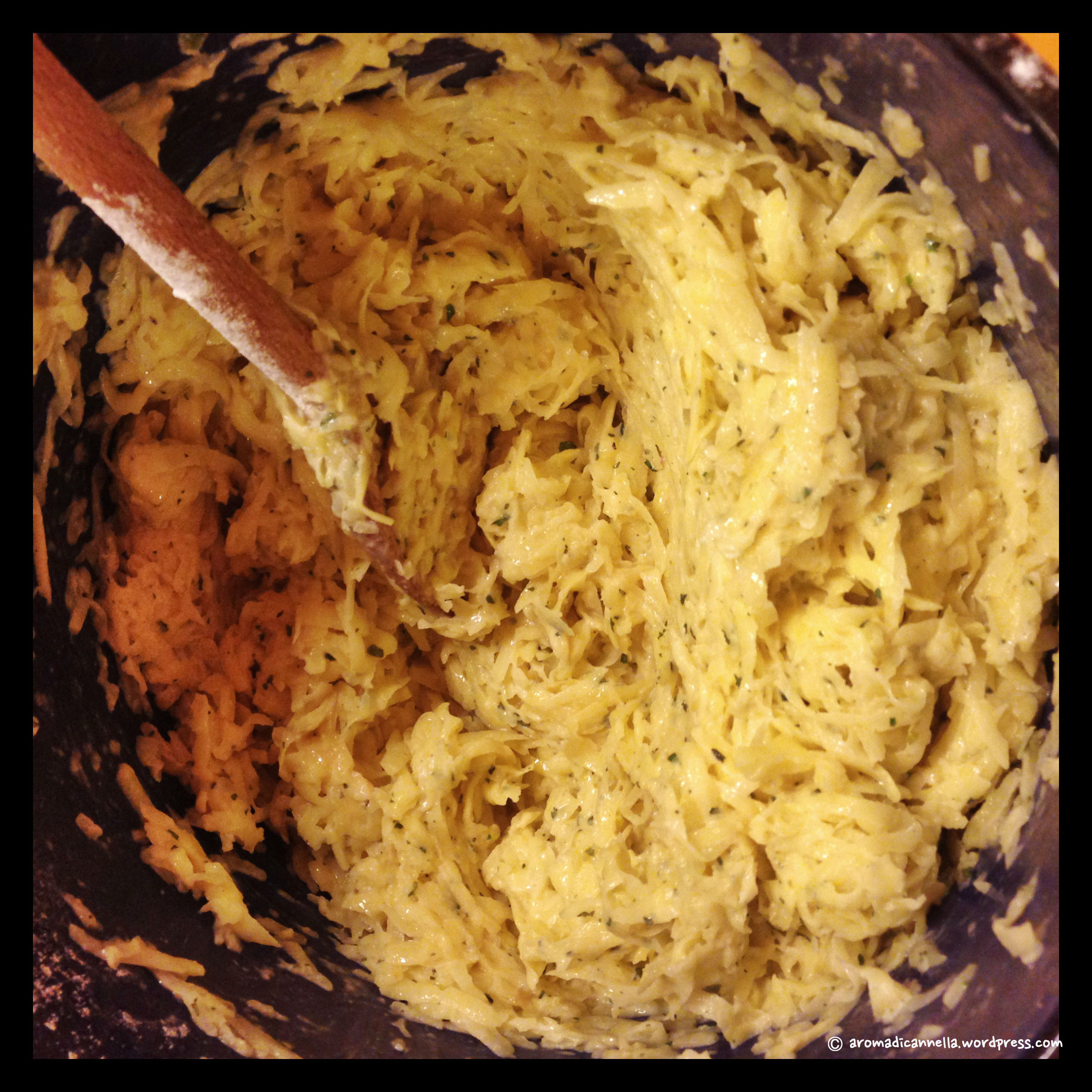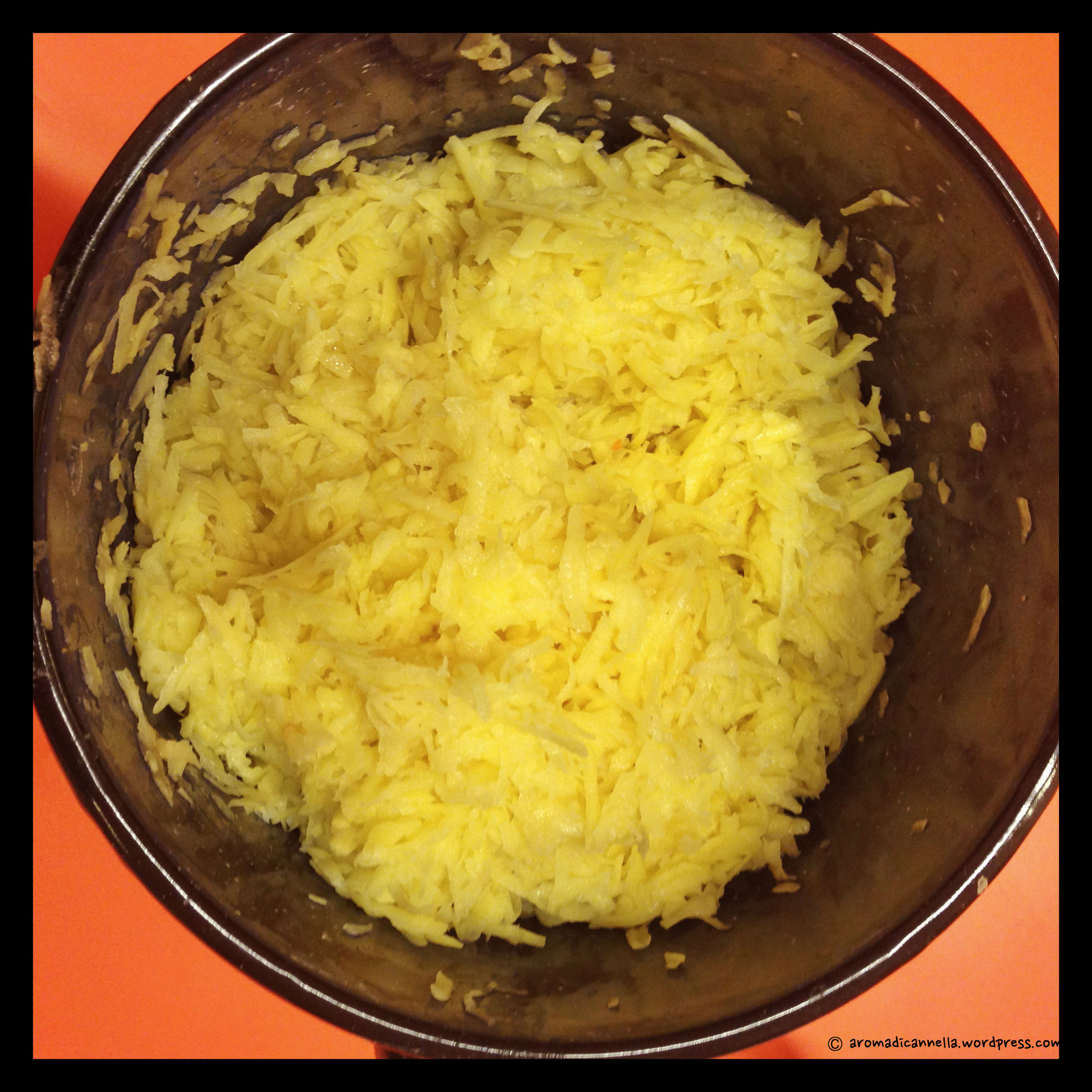 Sbucciate le patate, lavatele bene sotto acqua fresca e con l’aiuto di una grattugia grattuggiatele dentro una terrina (noi abbiamo usato la pentola per la pasta, si sa, le stoviglie dello studente non sono mai troppe, giusto le essenziali). Grattuggiate anche l’aglio (occhio alle dita, ma ovviamente voi avrete lo schiaccia-aglio) e affettate finemente la cipolla.