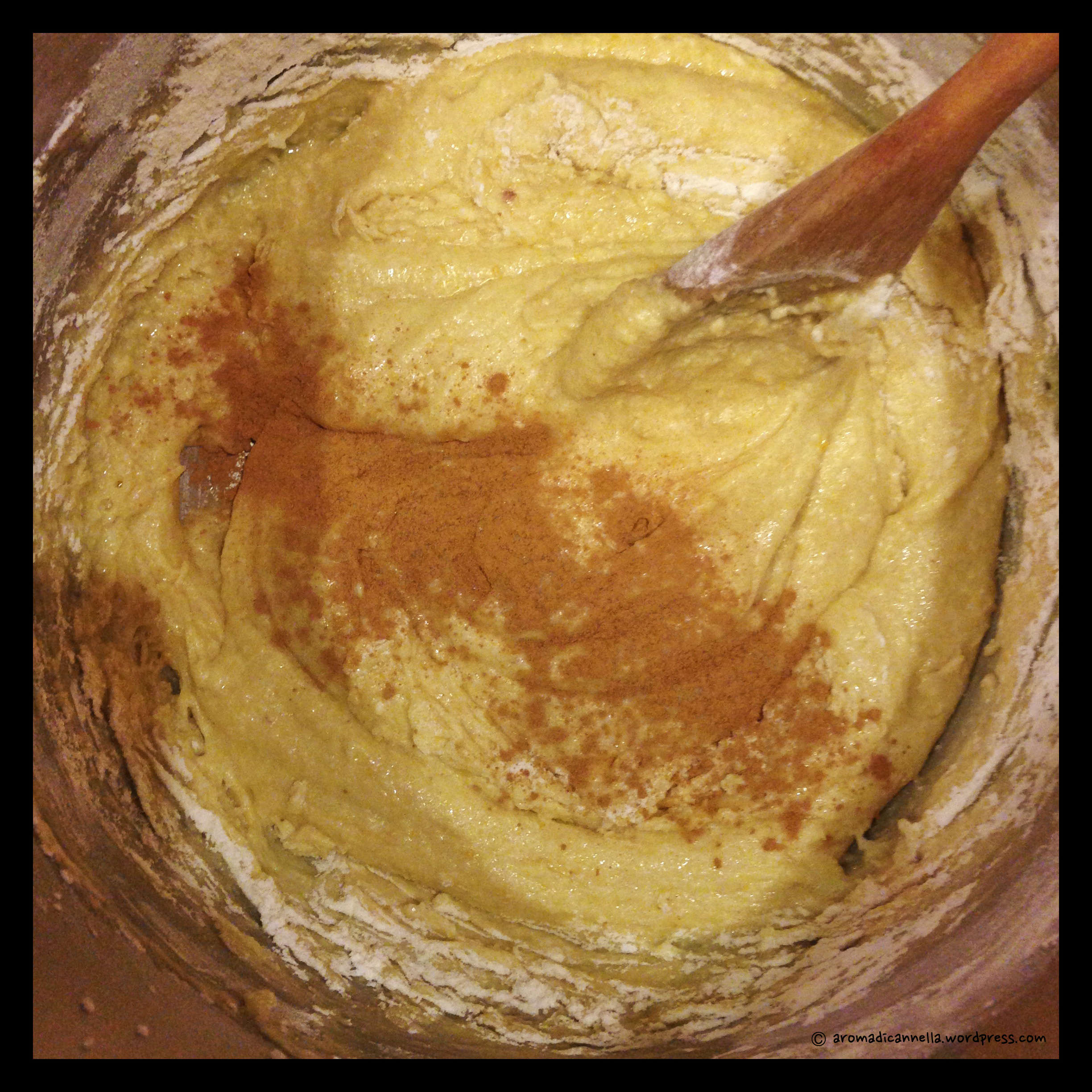Setacciate la farina con la fecola e il lievito, e aggiungete le polveri un po’ alla volta all’impasto, mescolando con un cucchiaio di legno, fino ad ottenere un impasto morbido e omogeneo. Non dimenticate la cannella.