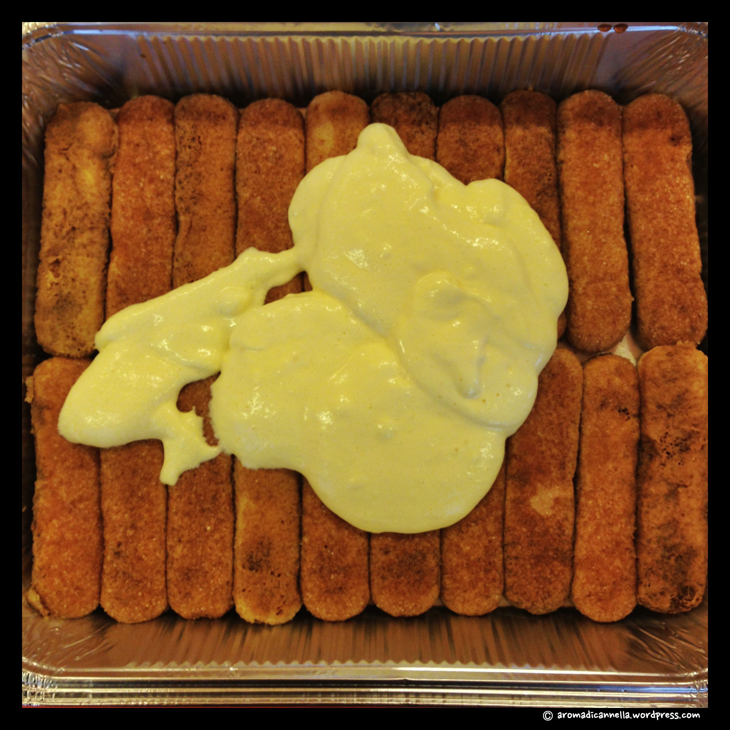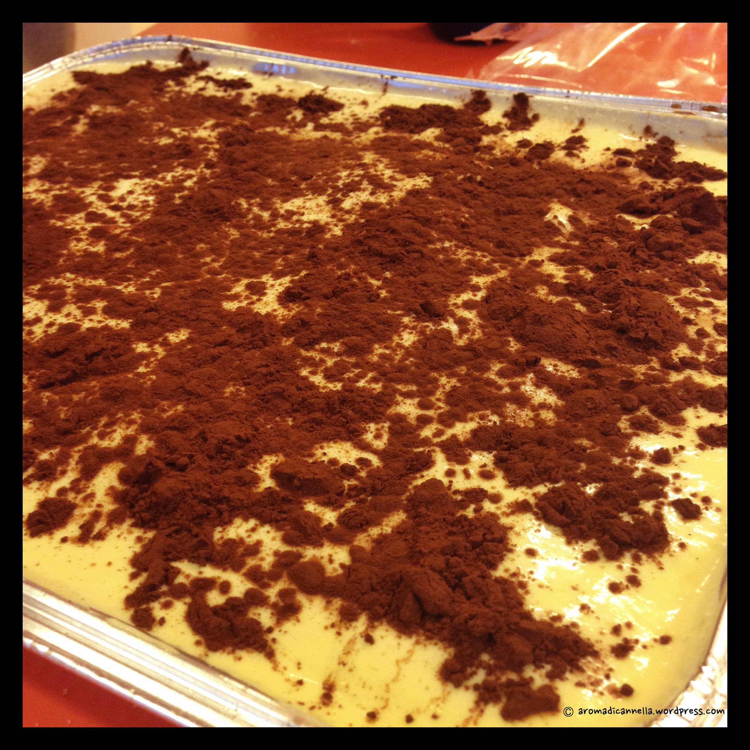 E ora si procede a strati, come per il pasticcio o le lasagne. Inzuppate i savoiardi nel caffè e disponeteli in una teglia (noi per comodità abbiamo usato una di quelle in alluminio usa e getta). Coprite con uno strato di crema e spolverate con il cacao in polvere.