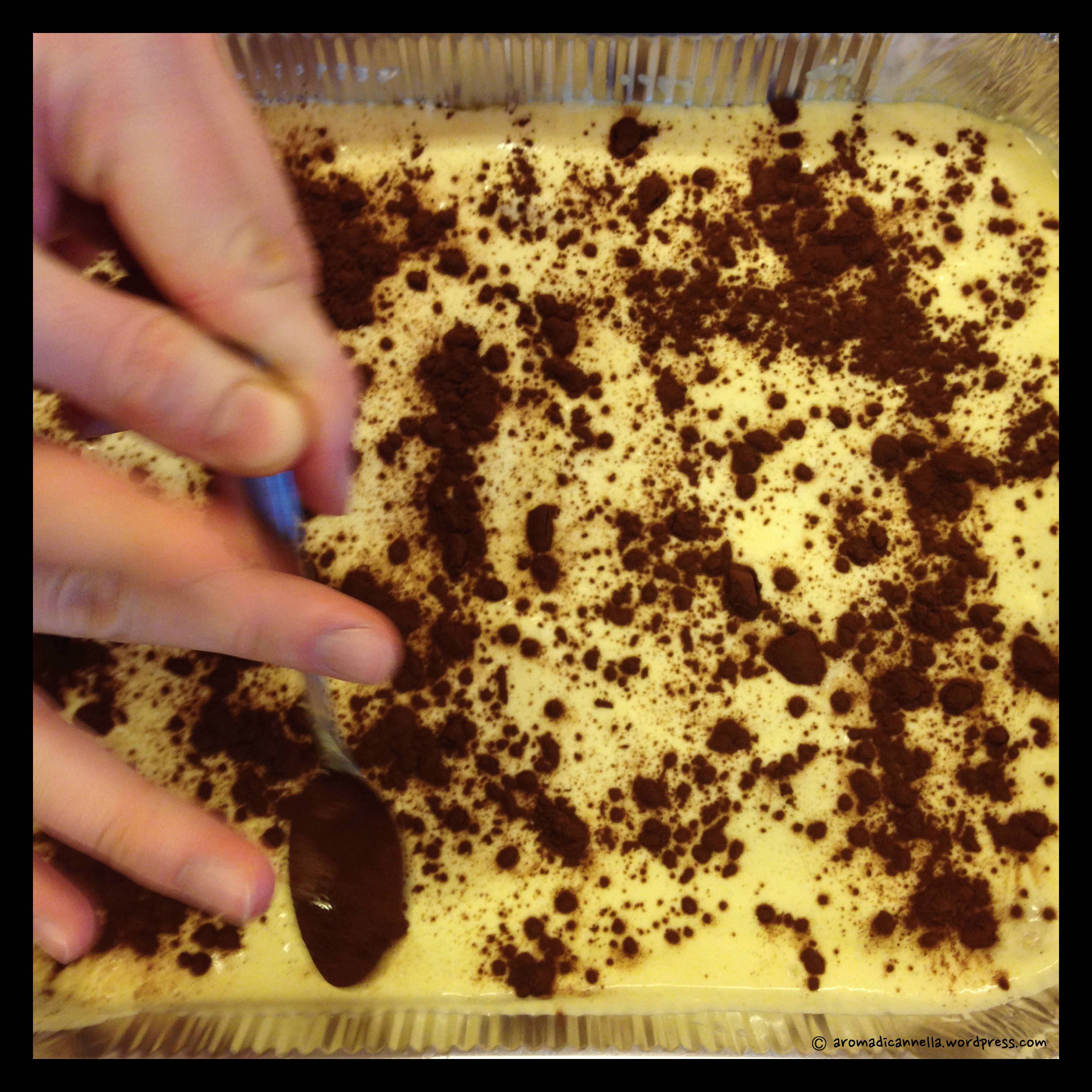 E continuate così fino all’ultimo strato, ultimando con una bella spolverata di cacao – noi, non avendo l’apposito colino, siamo andati giù pesante con il cucchiaino da caffè.