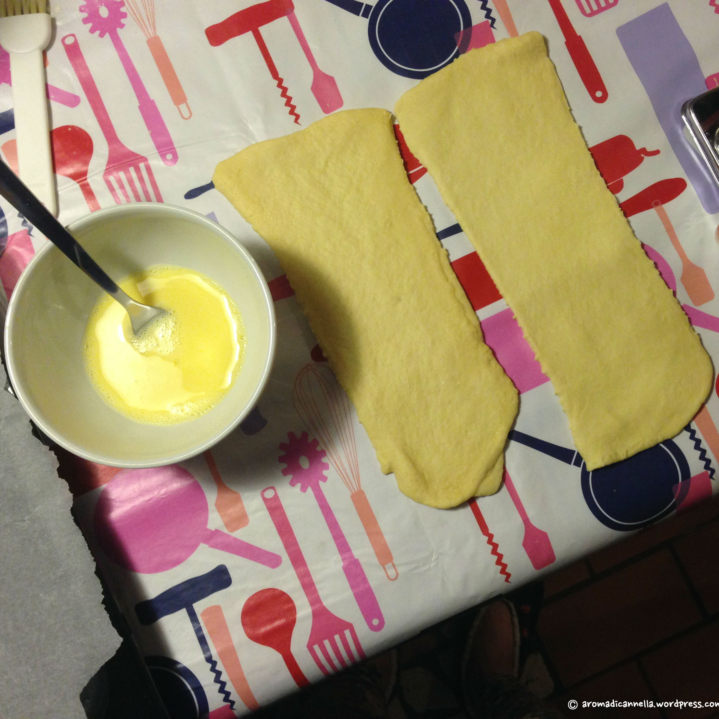 Tagliate in quadrotti e incidete nel mezzo. Spennellate con l’uovo sbattuto con poco latte.