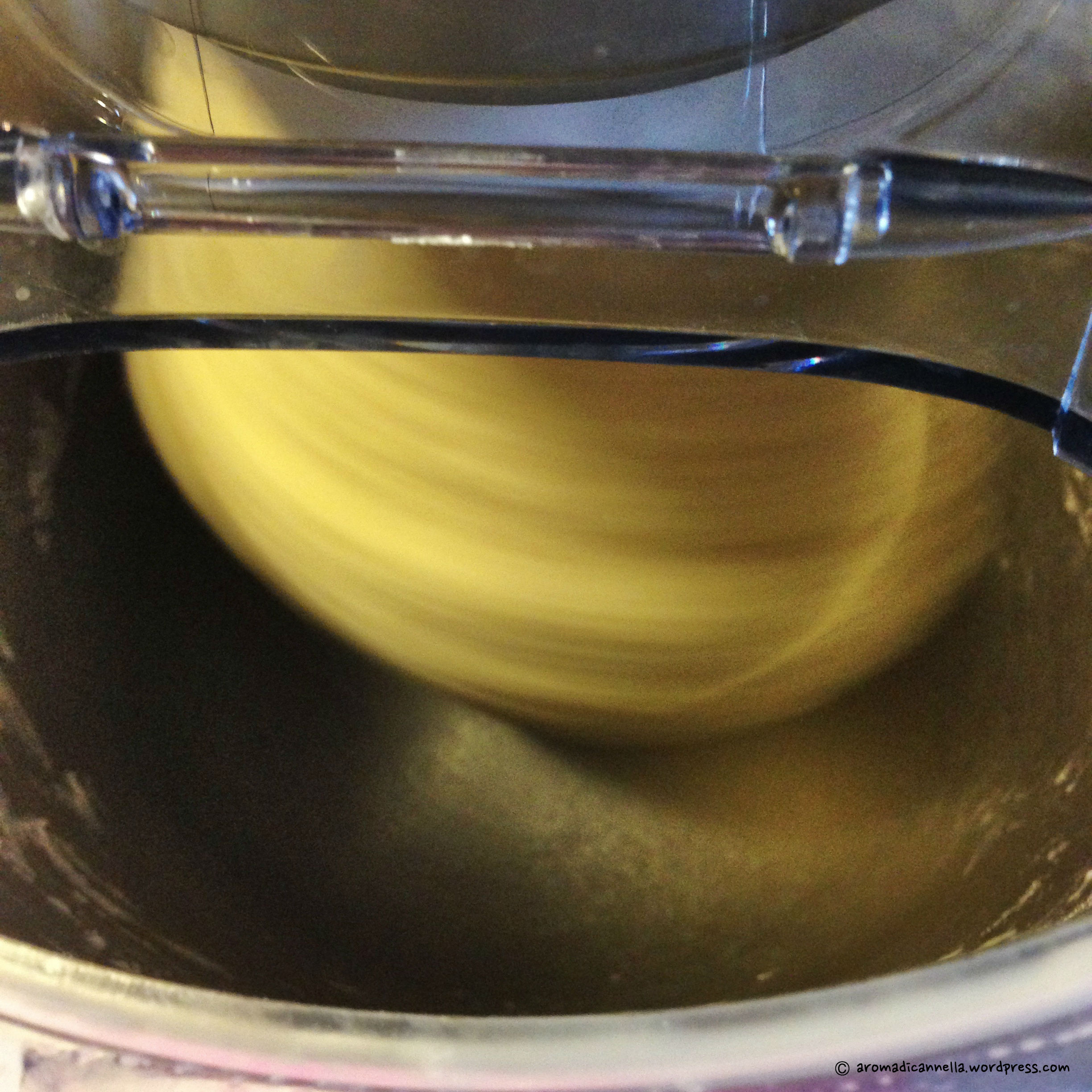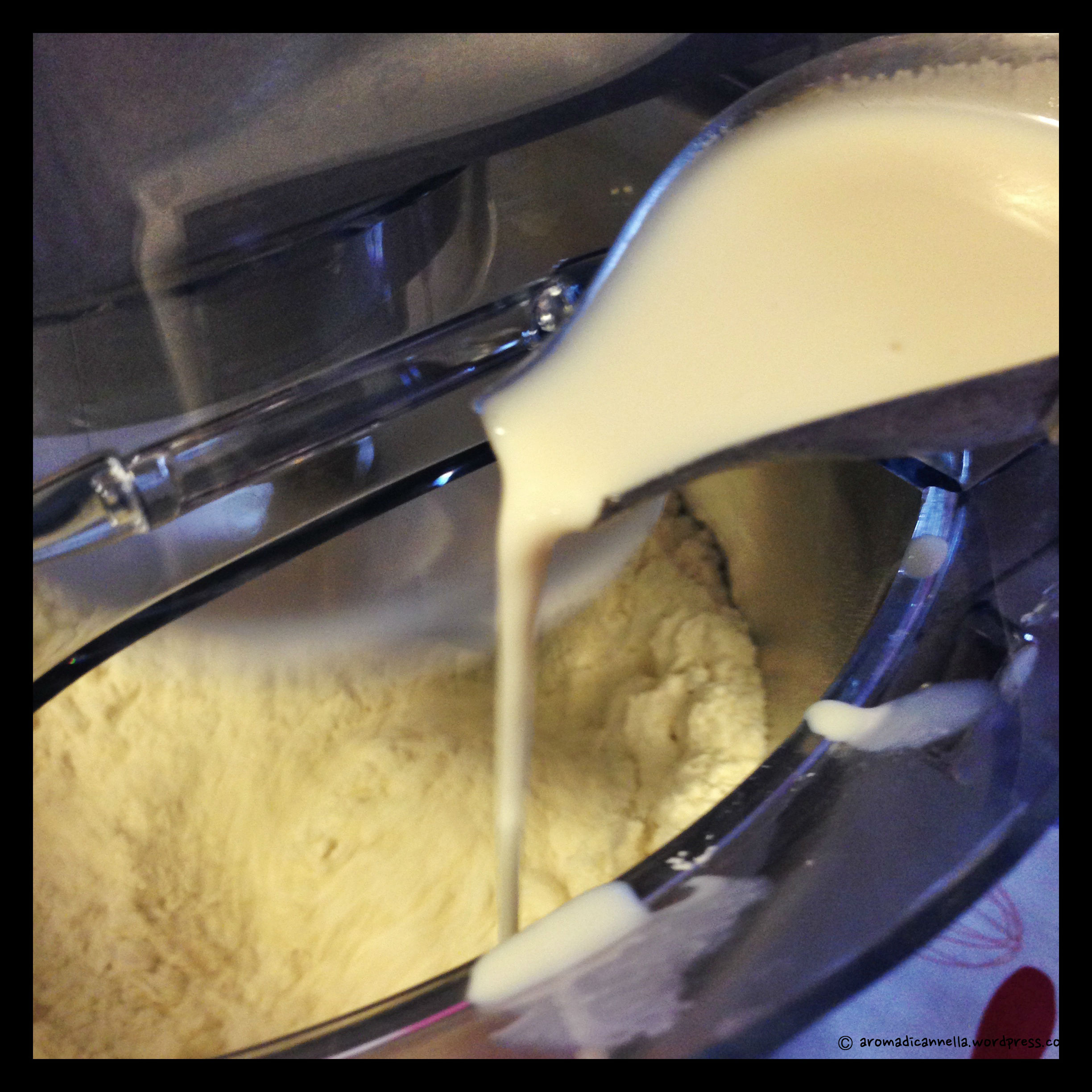 Nella planetaria ponete la farina e versate il latte un po’ alla volta con la macchina in funzione a velocità 1.