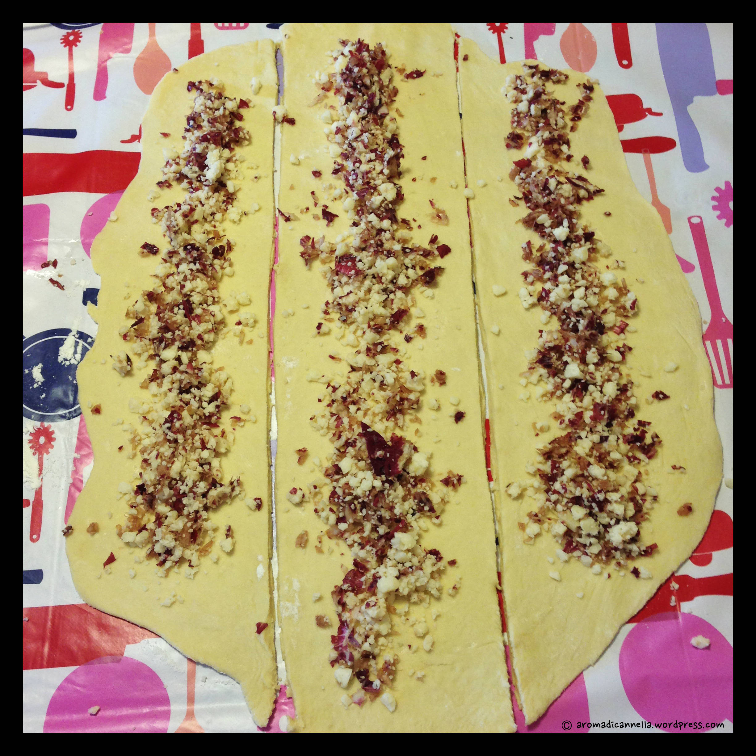 Stendete ora l’impasto con l’aiuto di un mattarello (non sarà necessaria ulteriore farina), dando una forma rettangolare. Tagliate tre strisce di pasta e farcite con il radicchio e il Montasio tritati a pezzettini.