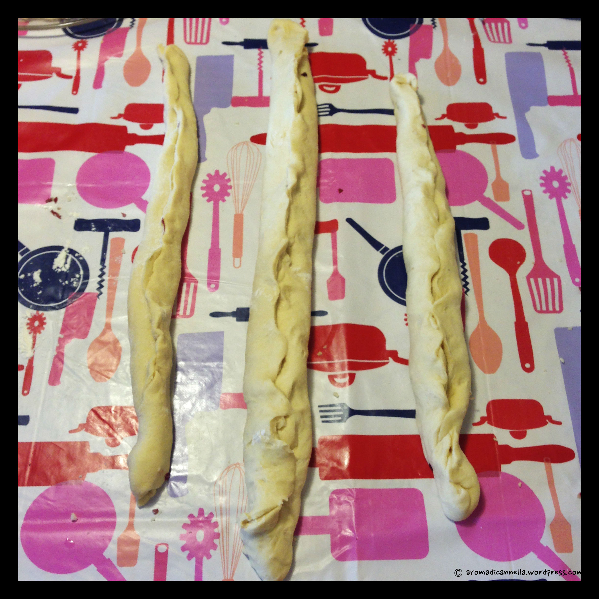 Chiudete bene schiacciando con le dita e formate i tre serpentelli, che poi andrete ad intrecciate. Spennellate la superficie con del latte.