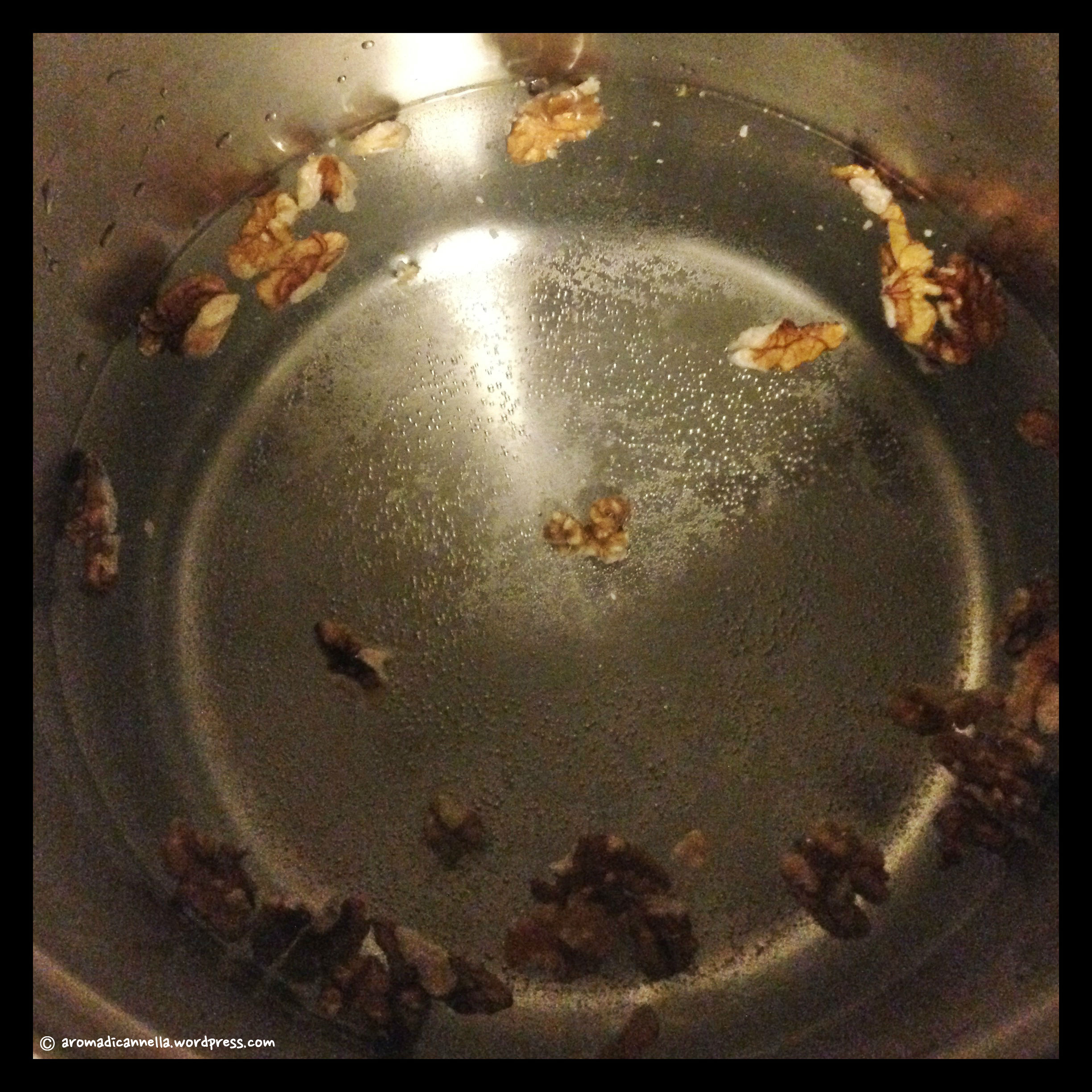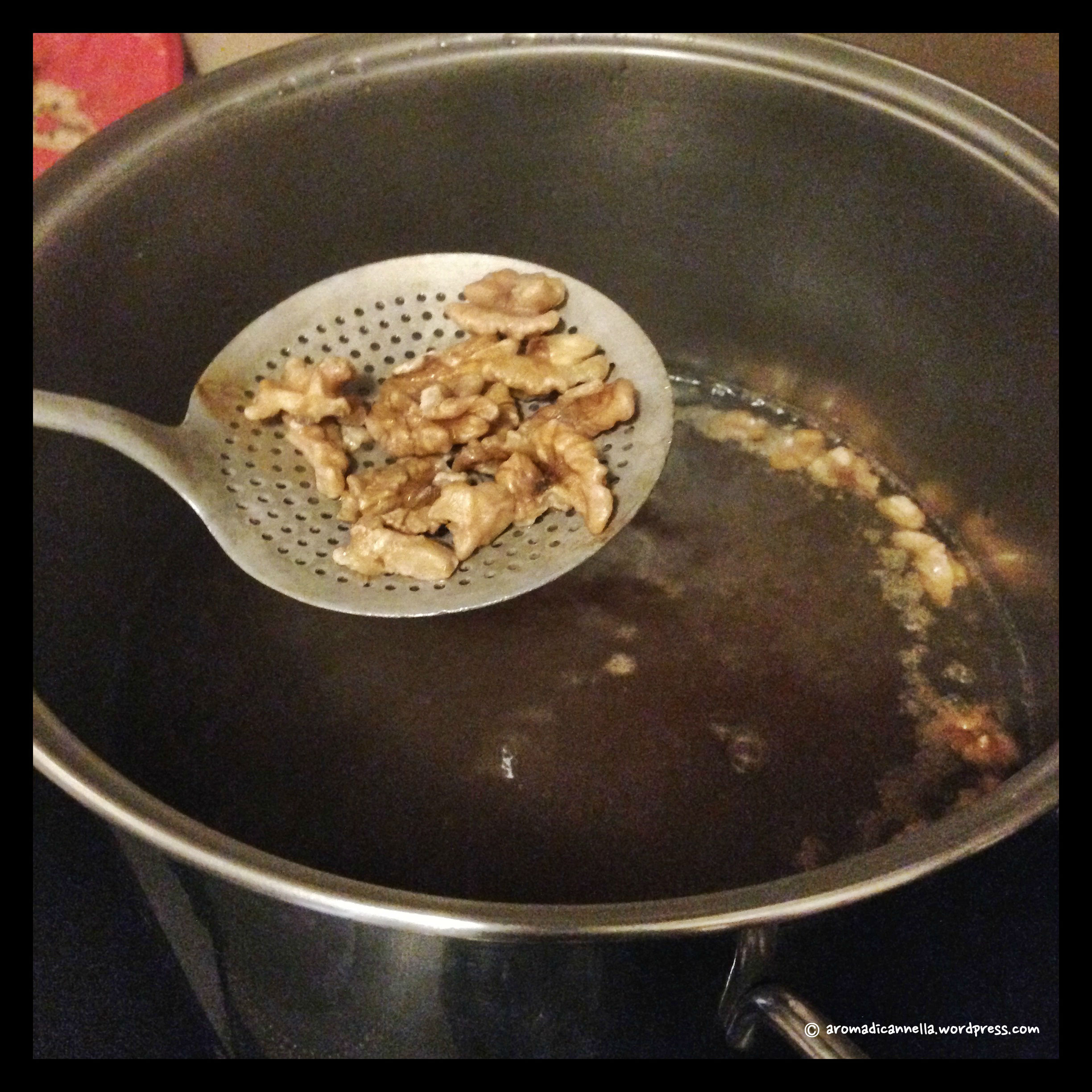 Cominciate mettendo a scaldare l’acqua con i gherigli di noci, lasciandone a parte qualcuno per la decorazione.
