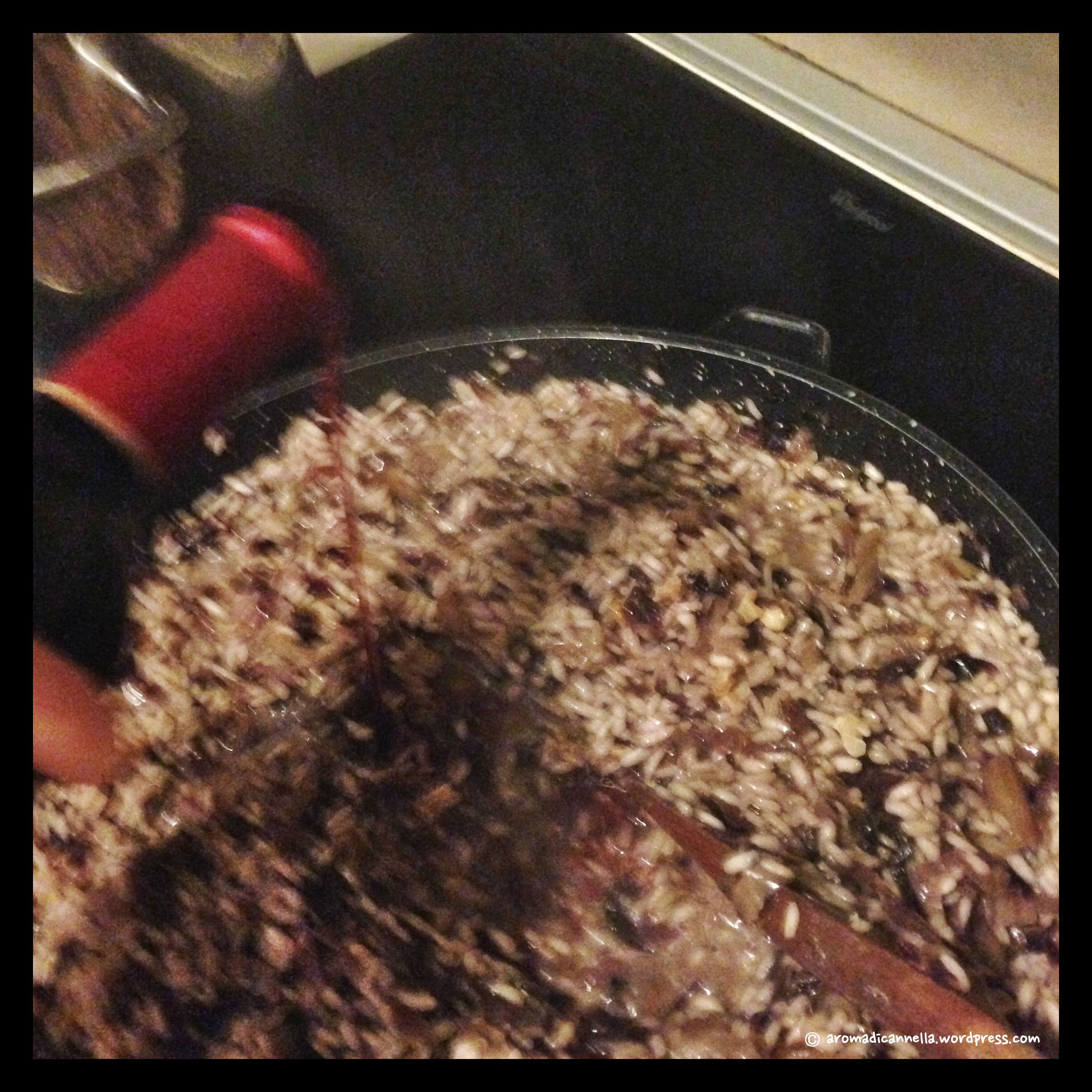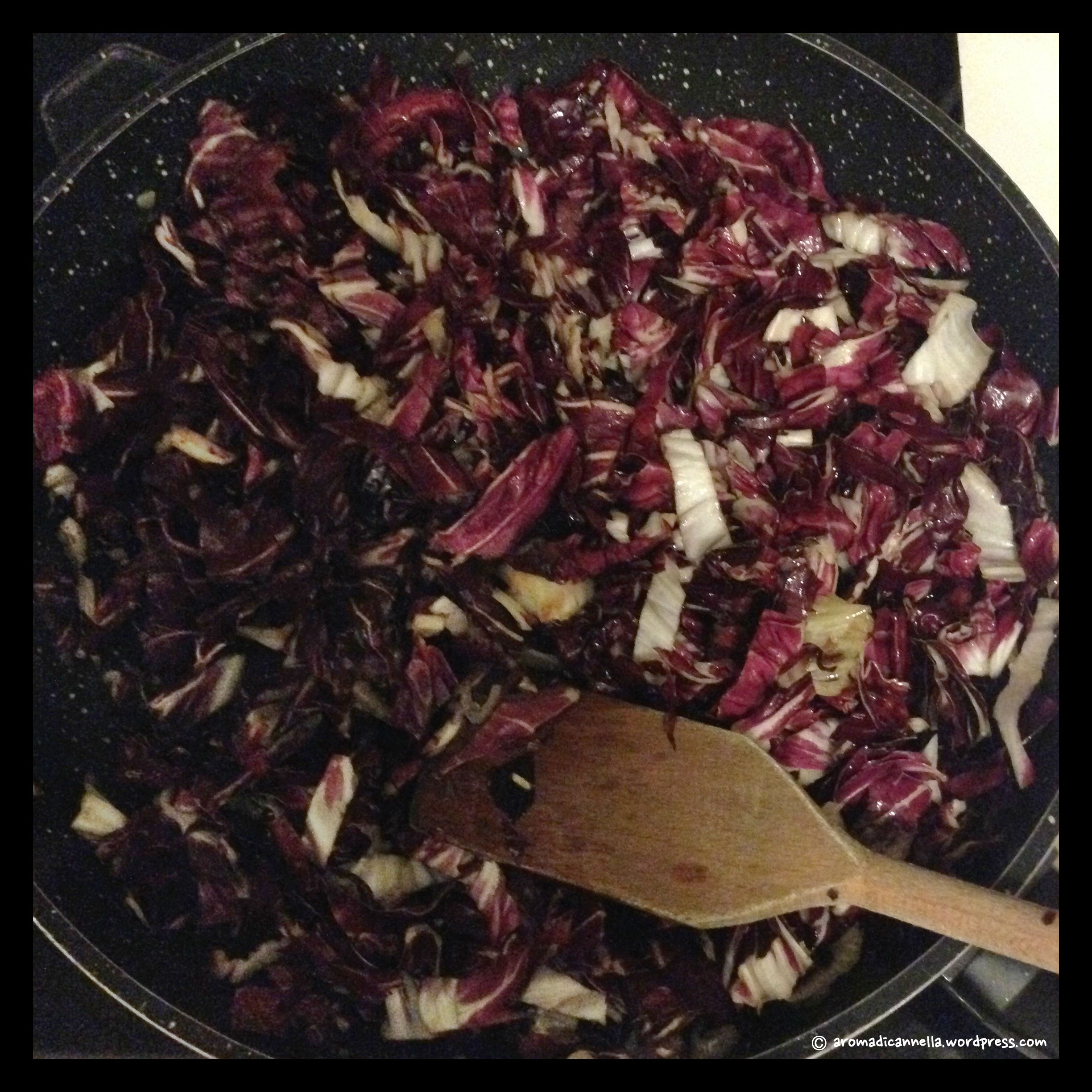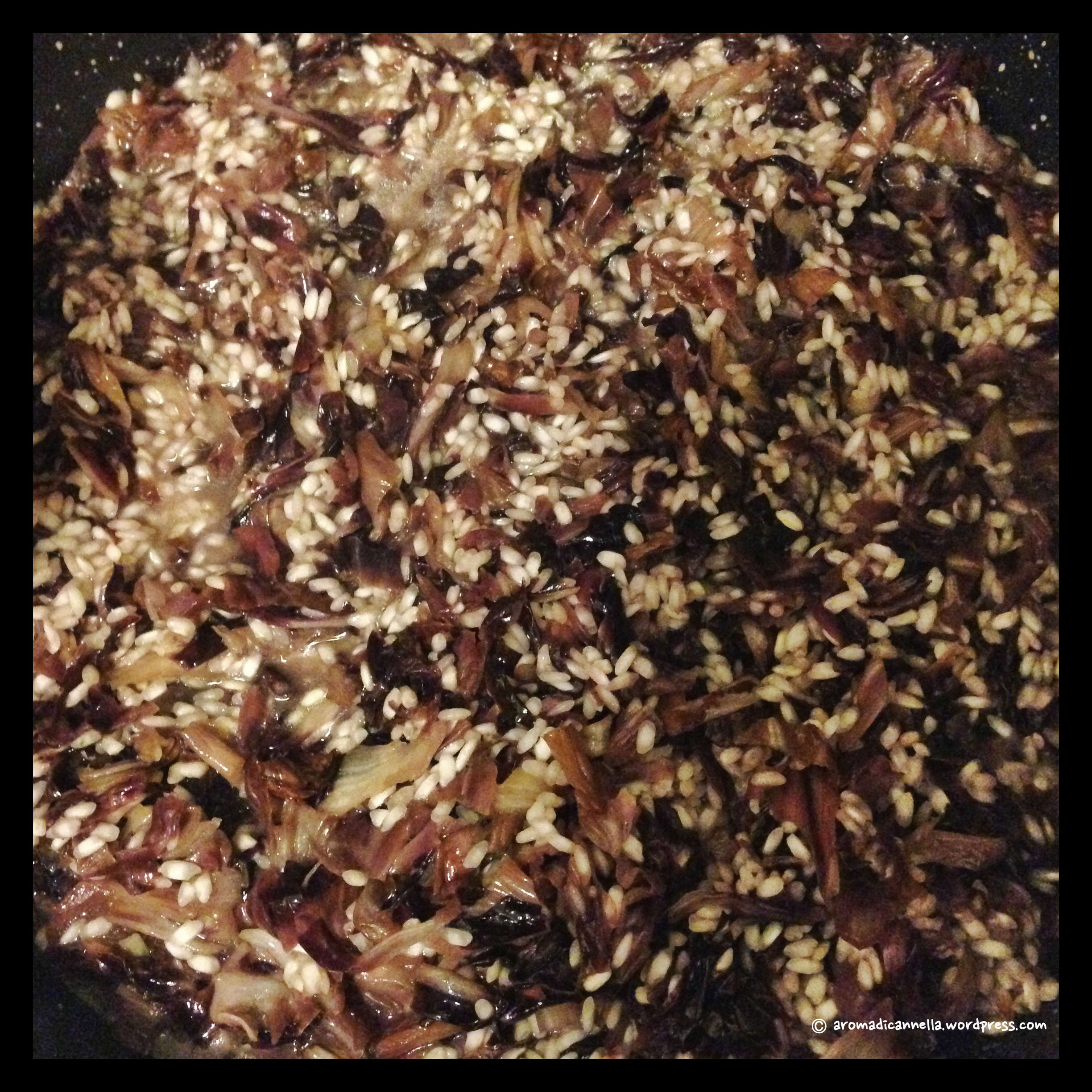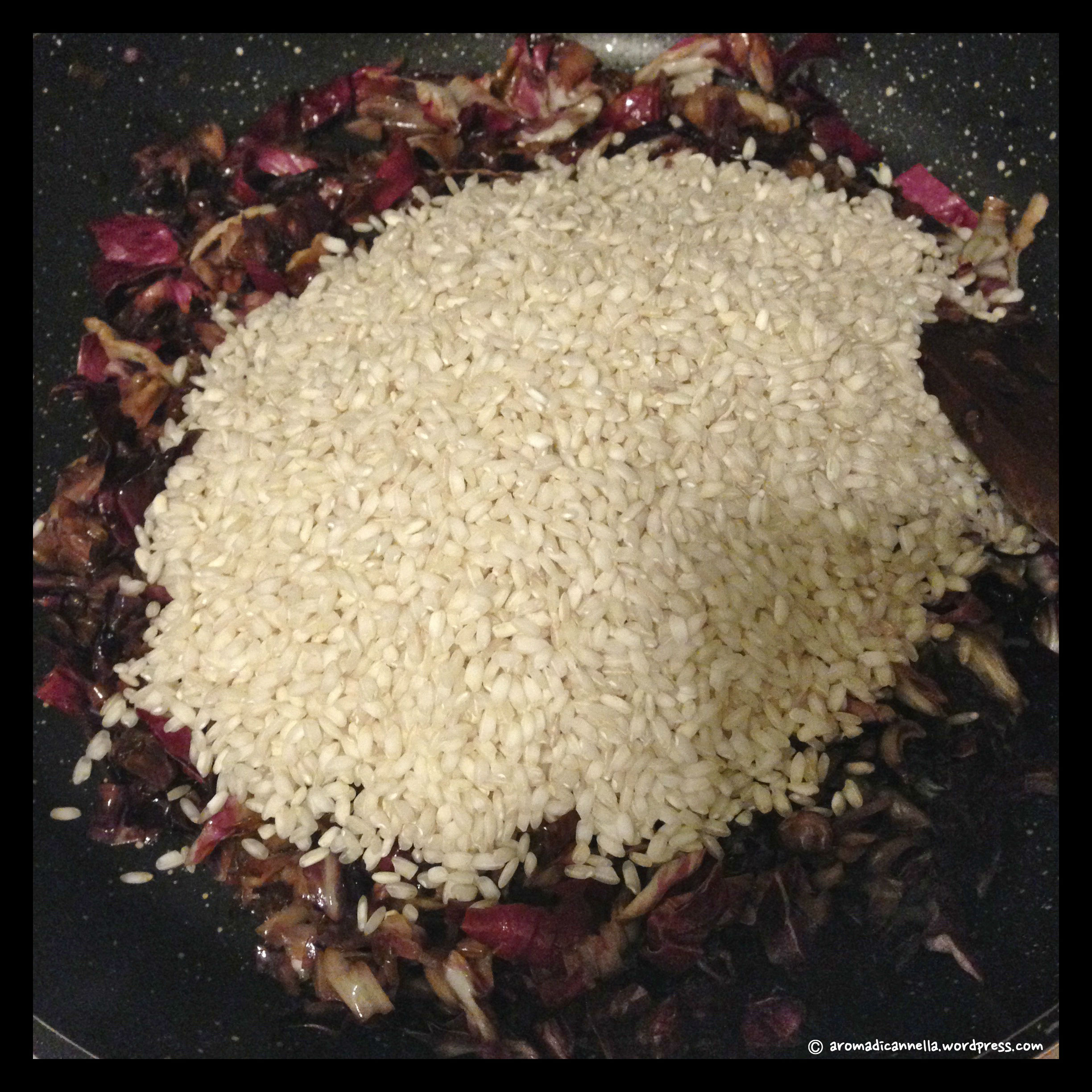 Unite poi il radicchio e fate appassire bene. Aggiungete poi il riso e tostatelo per qualche minuto.