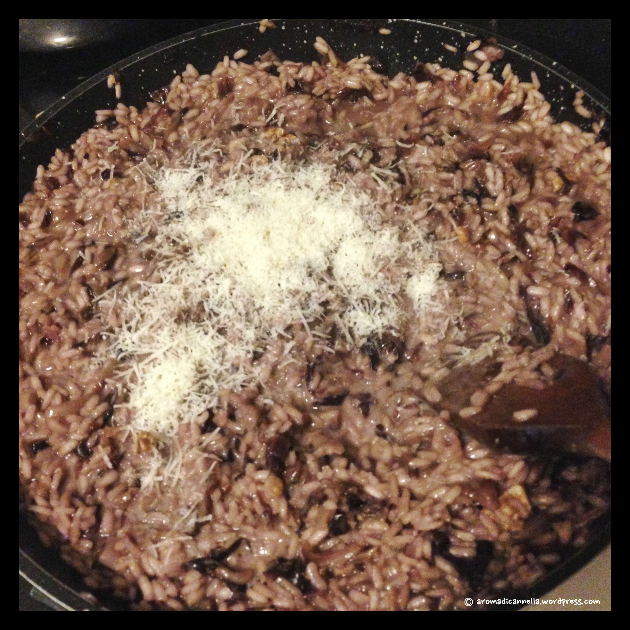 Quando il riso è quasi pronto,  aggiungete le noci ammollate nel brodo e sfumate con il vino rosso. Unite infine il taleggio tagliato a dadini e il parmigiano, e mescolate fino a quando i formaggi saranno ben incorporati.