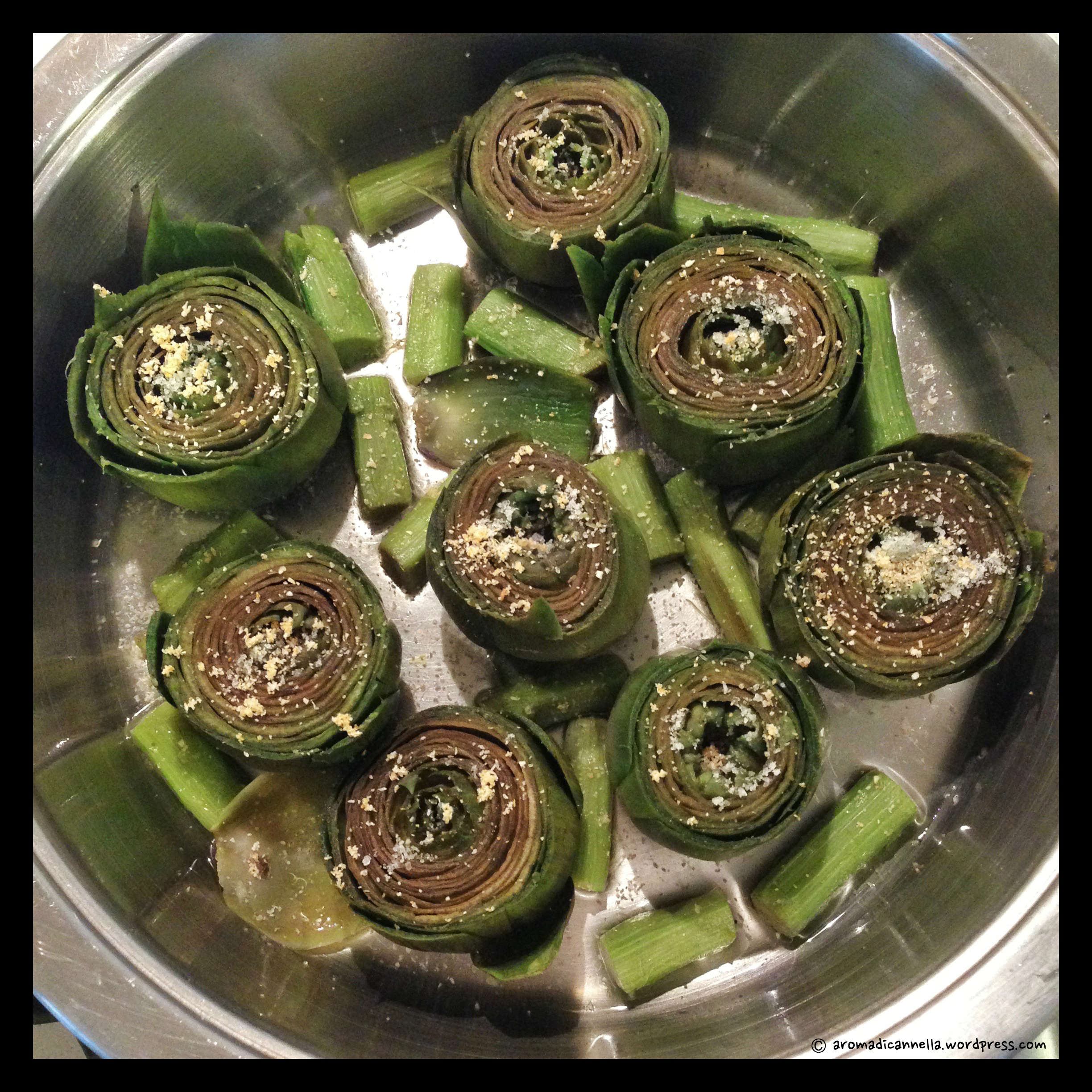 Dopodichè, scolateli per bene e trasferiteli in una pentola bassa dove avrete messo un po’ d’acqua sul fondo, sale, pepe, aglio e cipolla per insaporire. Condite con le spezie anche il cuore dei carciofi.