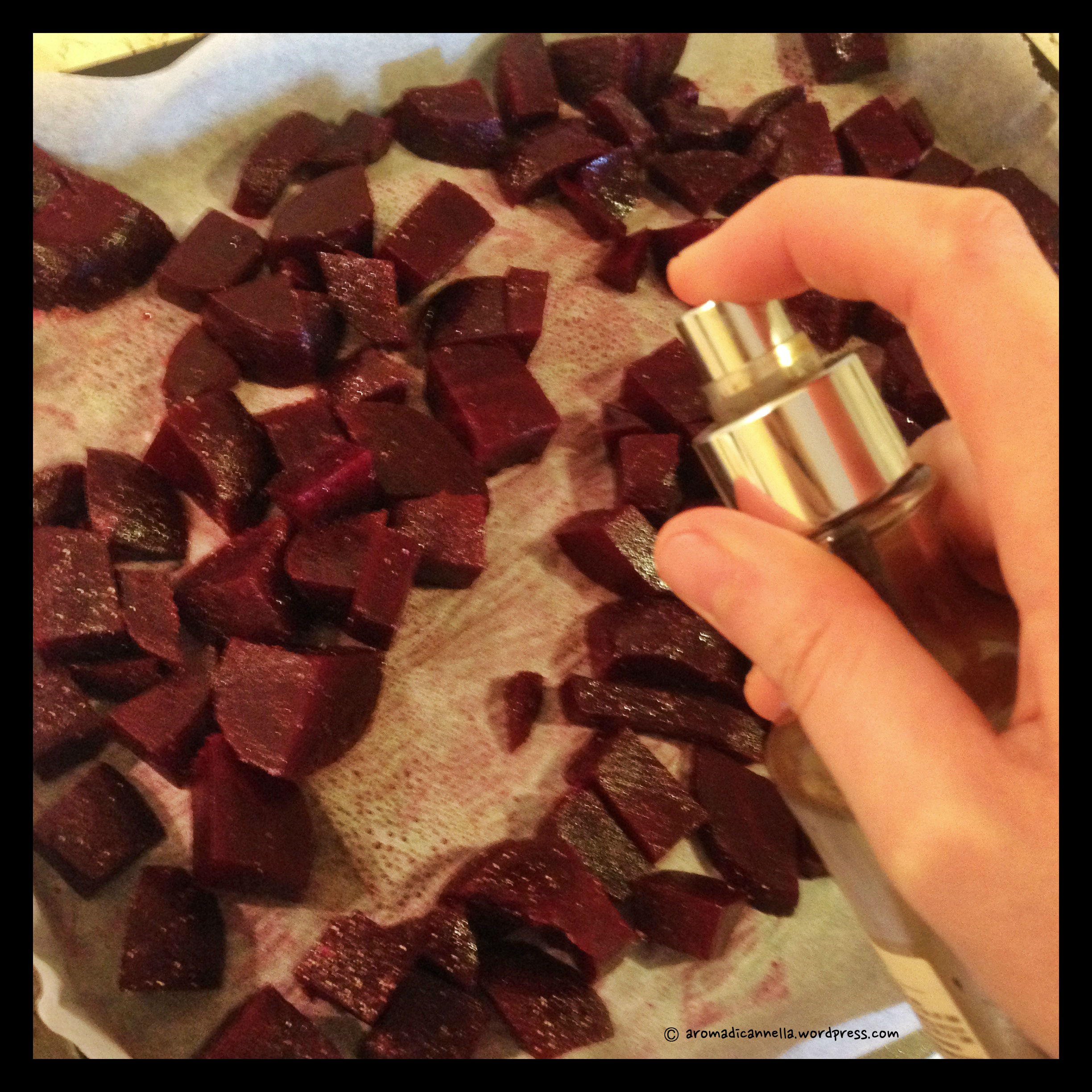Infornate per 10 minuti e poi cuocete per altri 10 in modalità grill (se partite con barbabietole crude, dopo averle pulite, lavate e tagliate, dovrete cucinarle per 30 minuti a 200° e poi finire la cottura per altri 30 minuti a 160°. Così infatti aveva fatto B. quando le avevamo preparate per la salsina al nostro compleanno).
