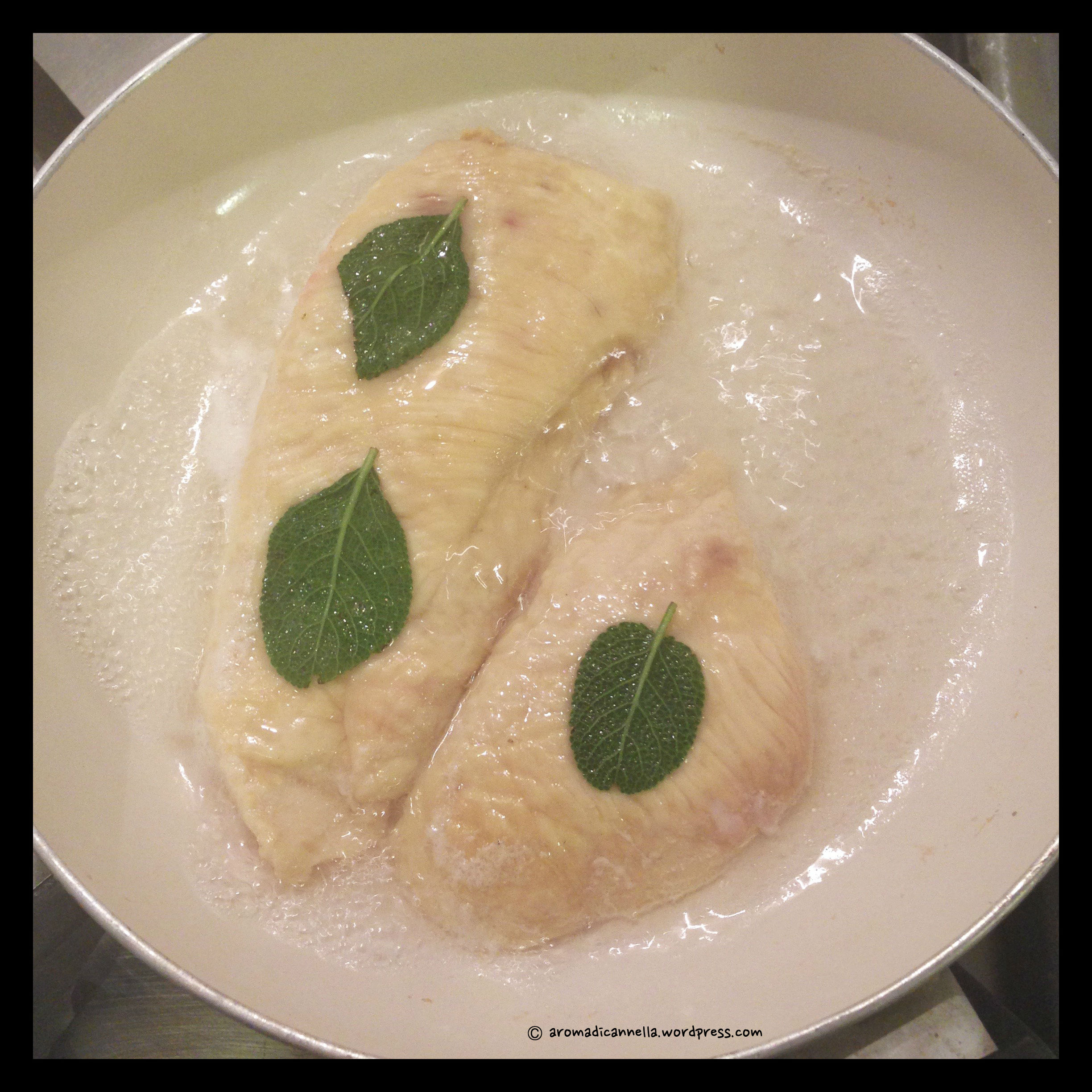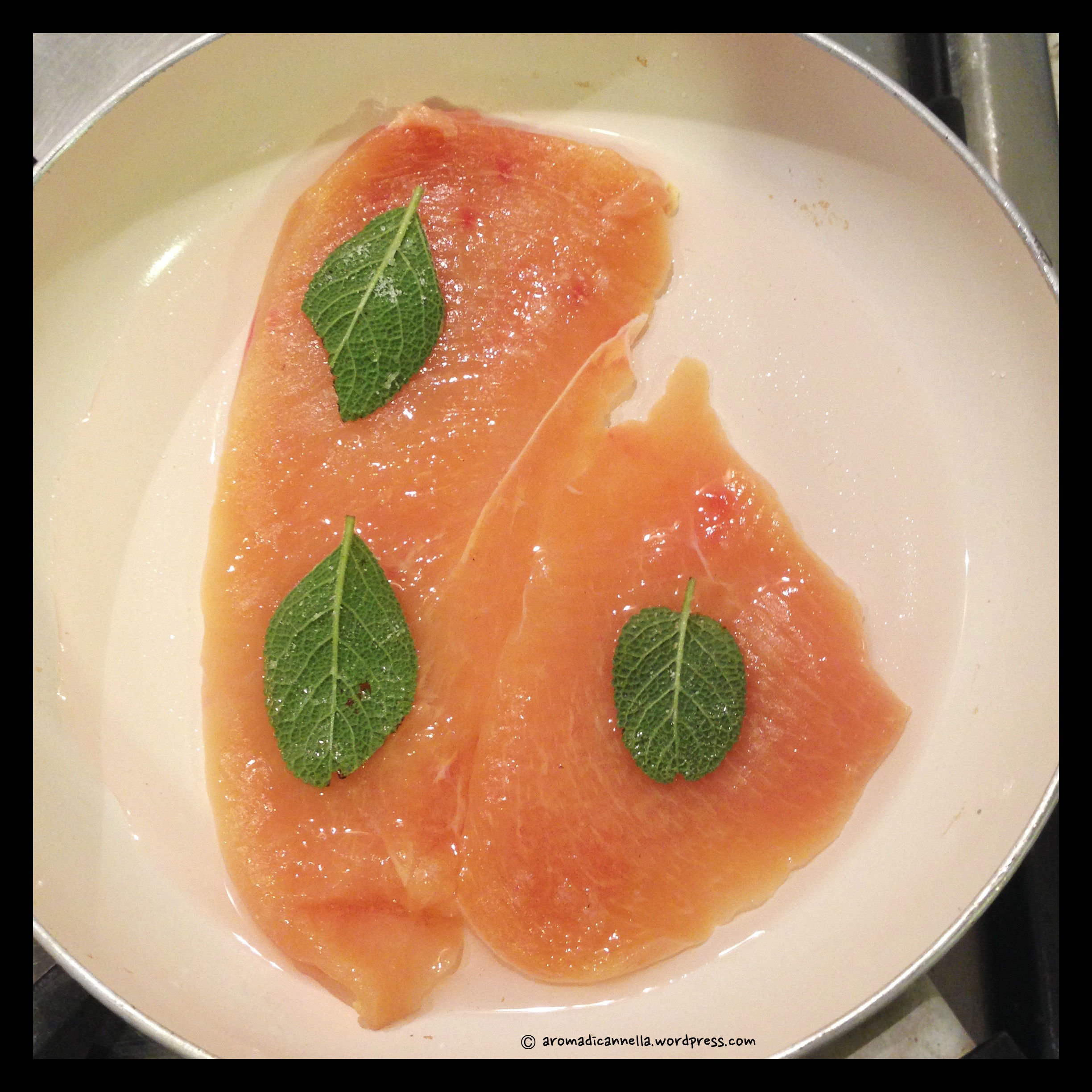 Dopo aver lavato per bene i petti di pollo, disponeteli in padella con dell’acqua. Salate e condite con le spezie, ponendo sopra le foglie di salvia.