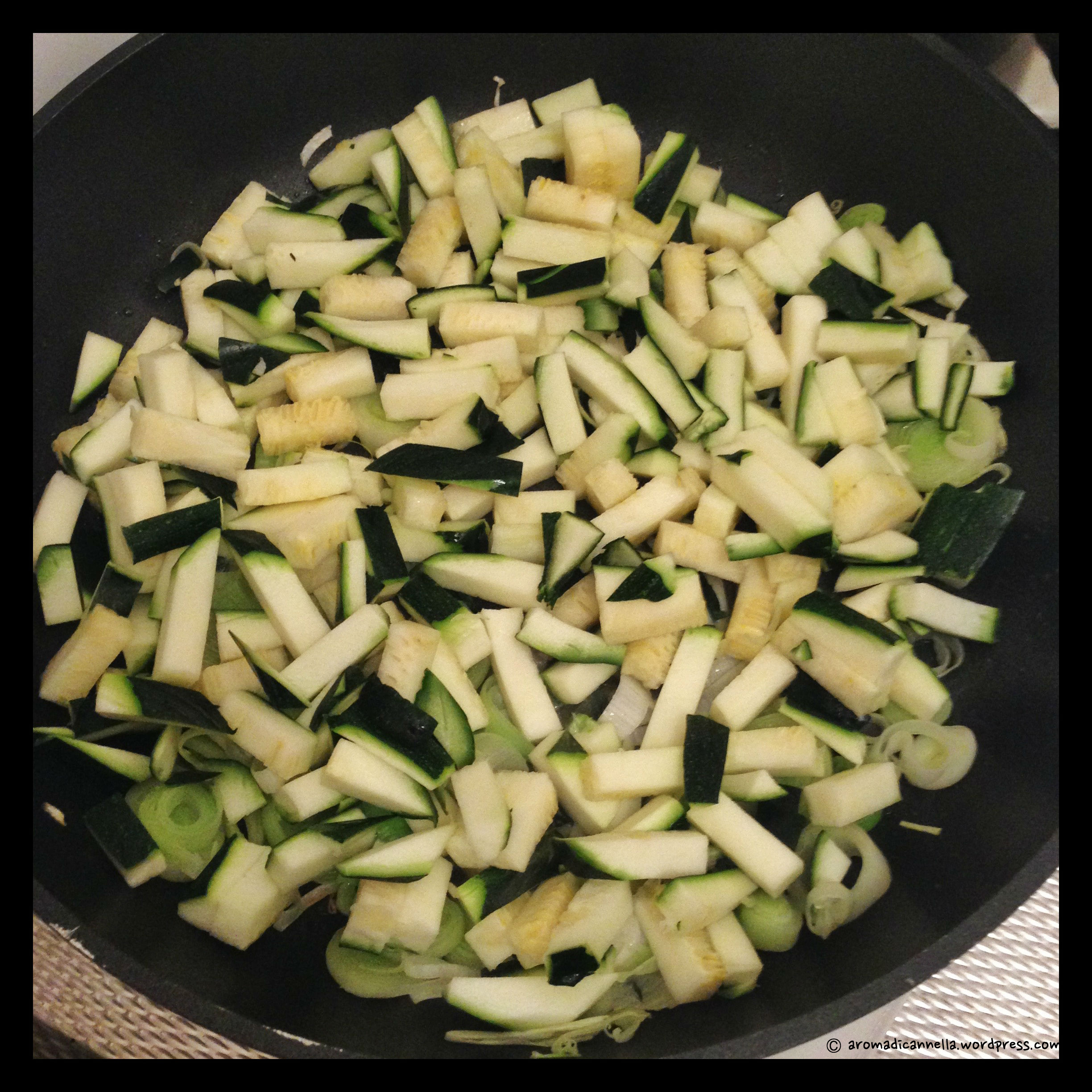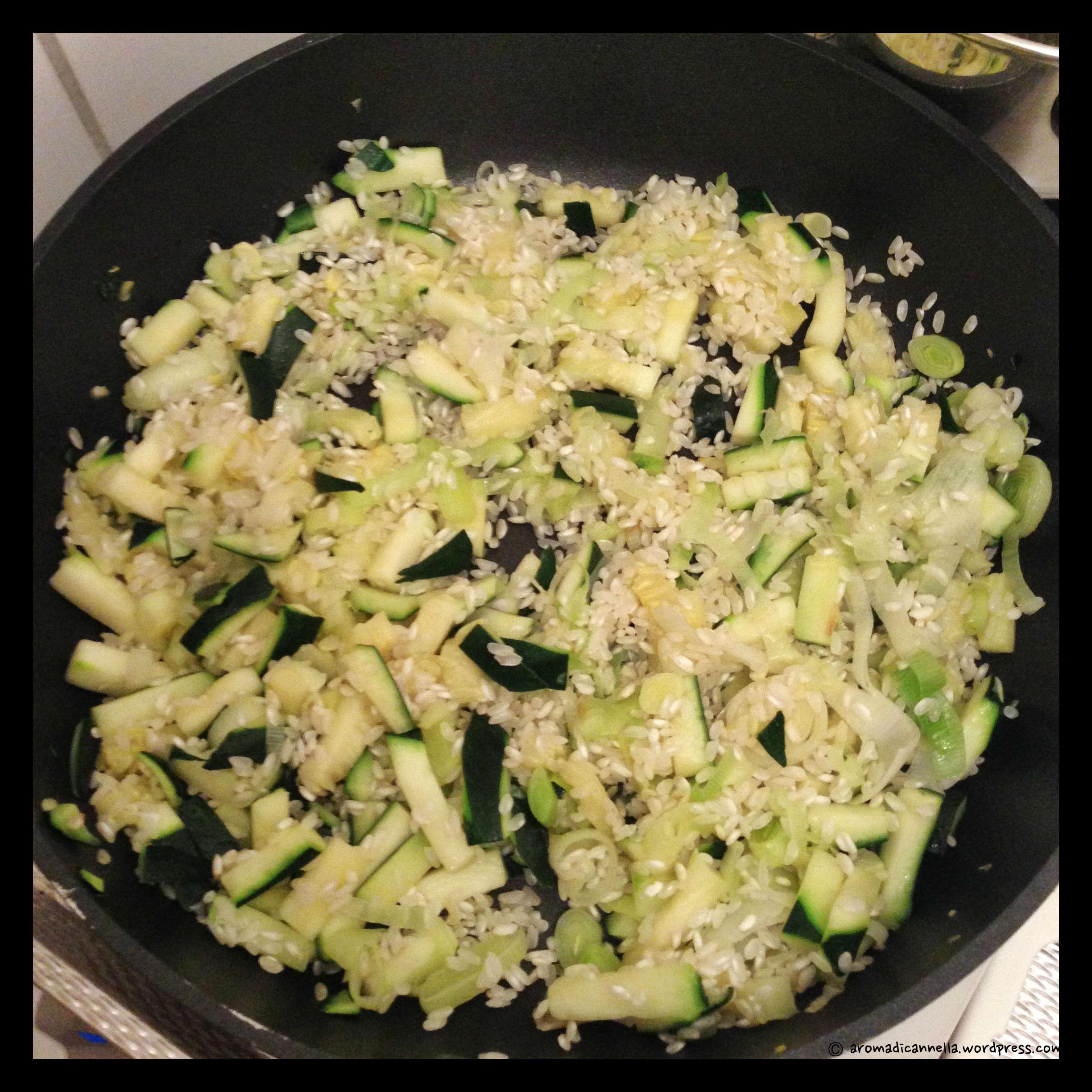 In una padella antiaderente soffriggete il porro tagliato fine e poi aggiungete la zucchina tagliata a dadini. Unite il riso e tostate per qualche minuto.