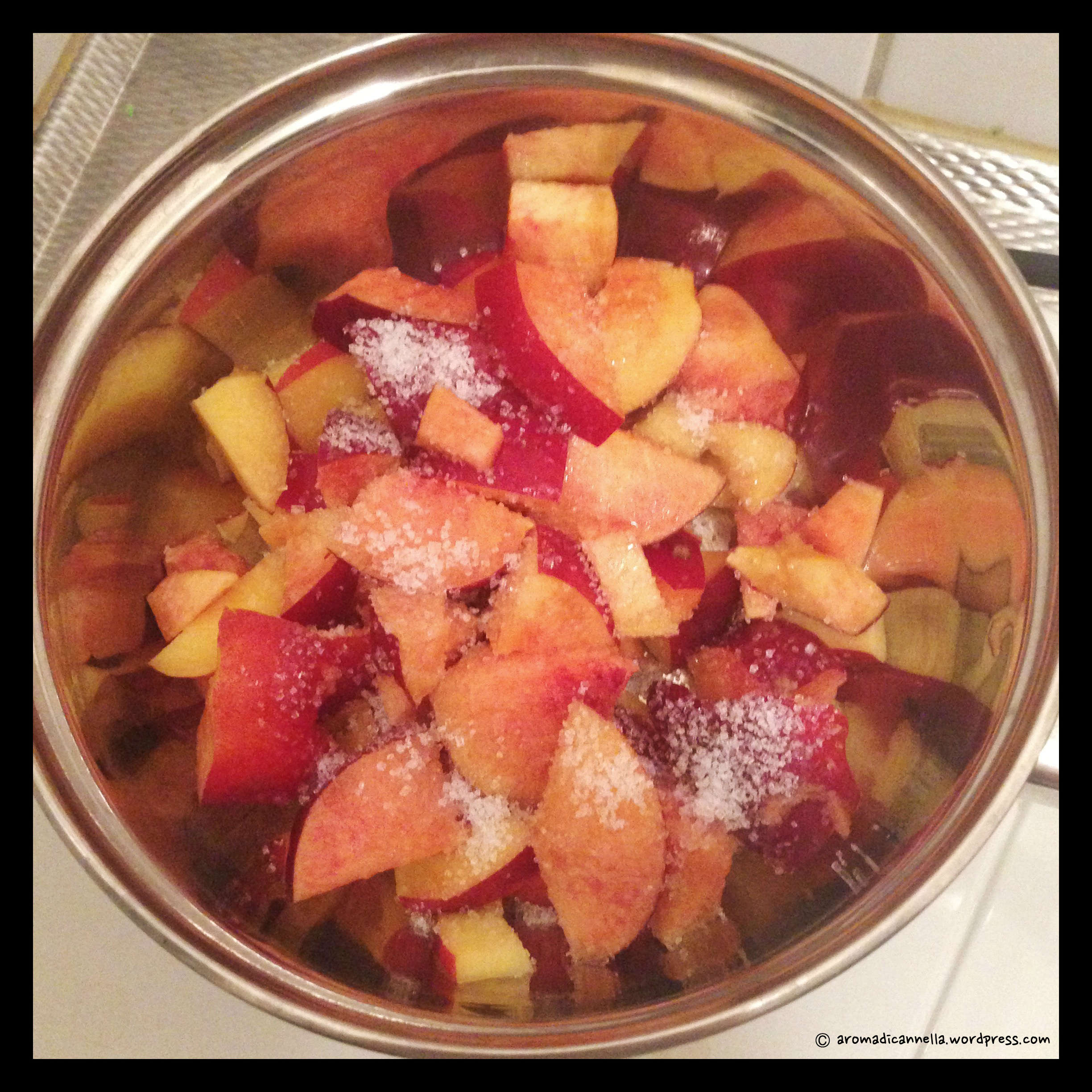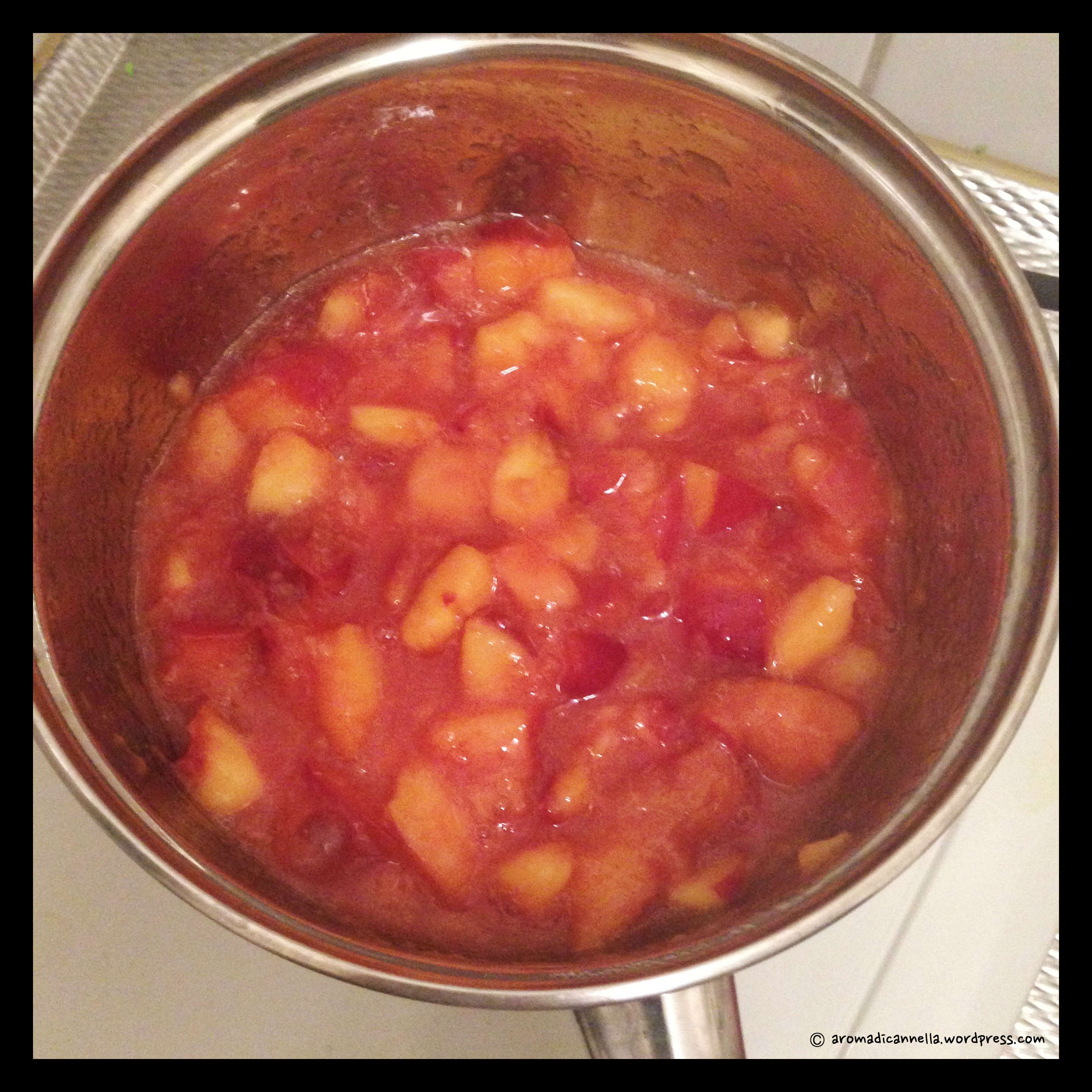 In un pentolino ponete le pesche tagliate a cubetti con due cucchiai di zucchero e cuocete a fuoco lento, tenendo mescolato. Dovrete ottenere una salsa, se ci sono dei pezzettini di frutta meglio. Lasciate raffreddare.