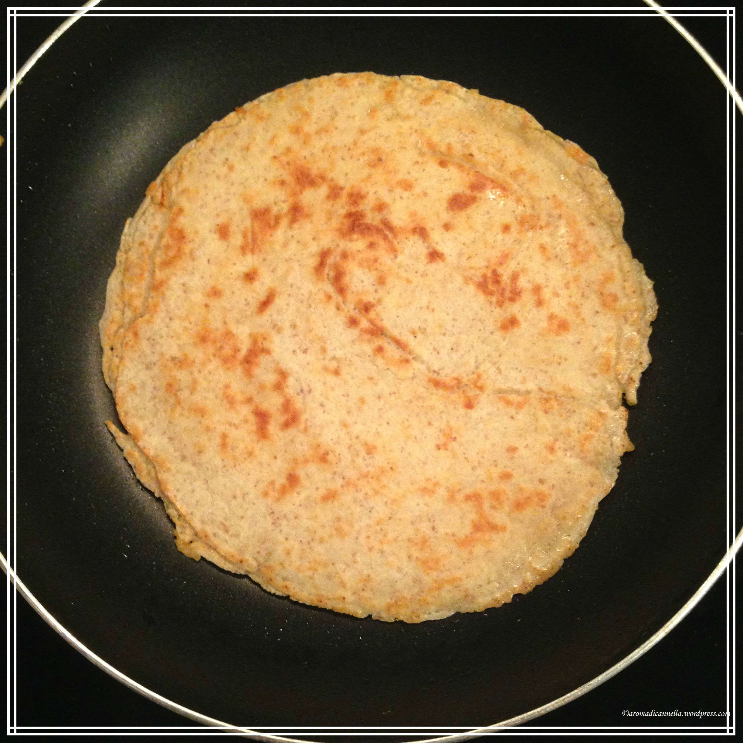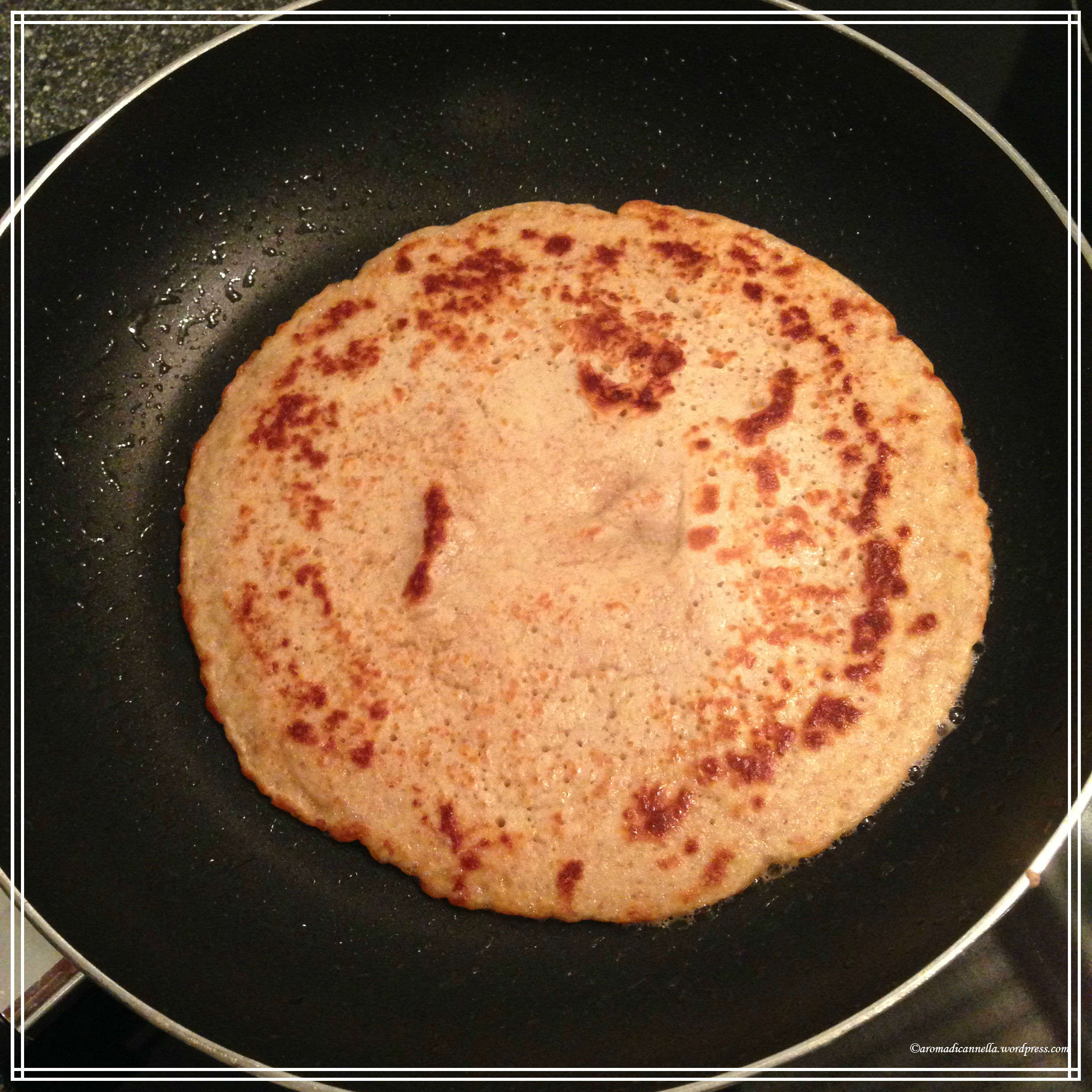 Dopodichè versate un cucchiaio da zuppa d’impasto e cospargete bene sulla padella. Dopo pochissimo, il pancake comincerà a cucinarsi e automaticamente si staccherà. Per facilitare il procedimento ed evitare di bruciare tutto, muovete la padella di tanto in tanto. Abbassate poi la temperatura fino alla fine della cottura (noi abbiamo a messo a 5).