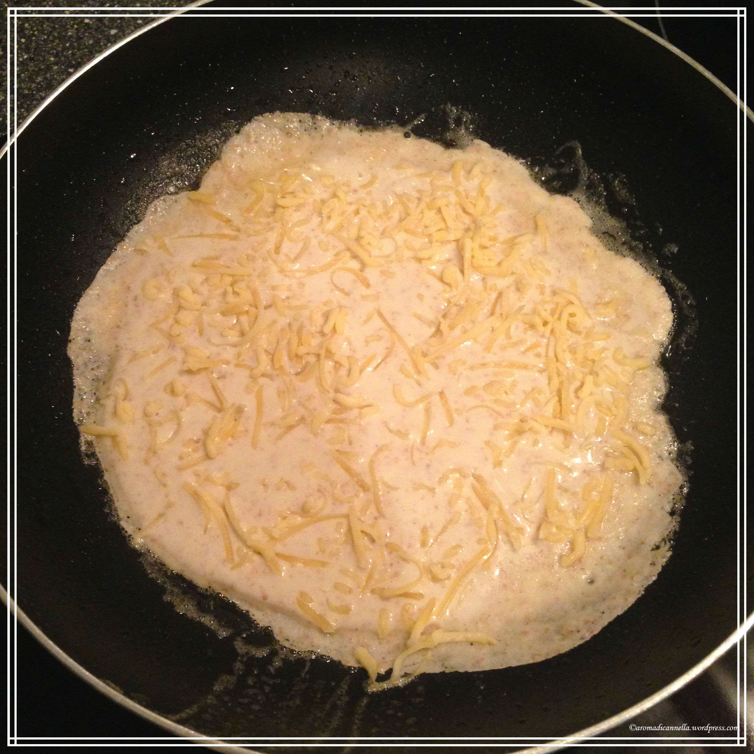 Pancake al formaggio: sciogliete il burro (questa volta ce ne vuole meno perchè la padella è gia calda e ci sarà il formaggio), poi versate l’impasto e aggiungete a pioggia il gouda – o quello che avete – sminuzzato (come potete vedere nella foto). Procedete poi con la cottura da entrambi i lati, come spiegato sopra.