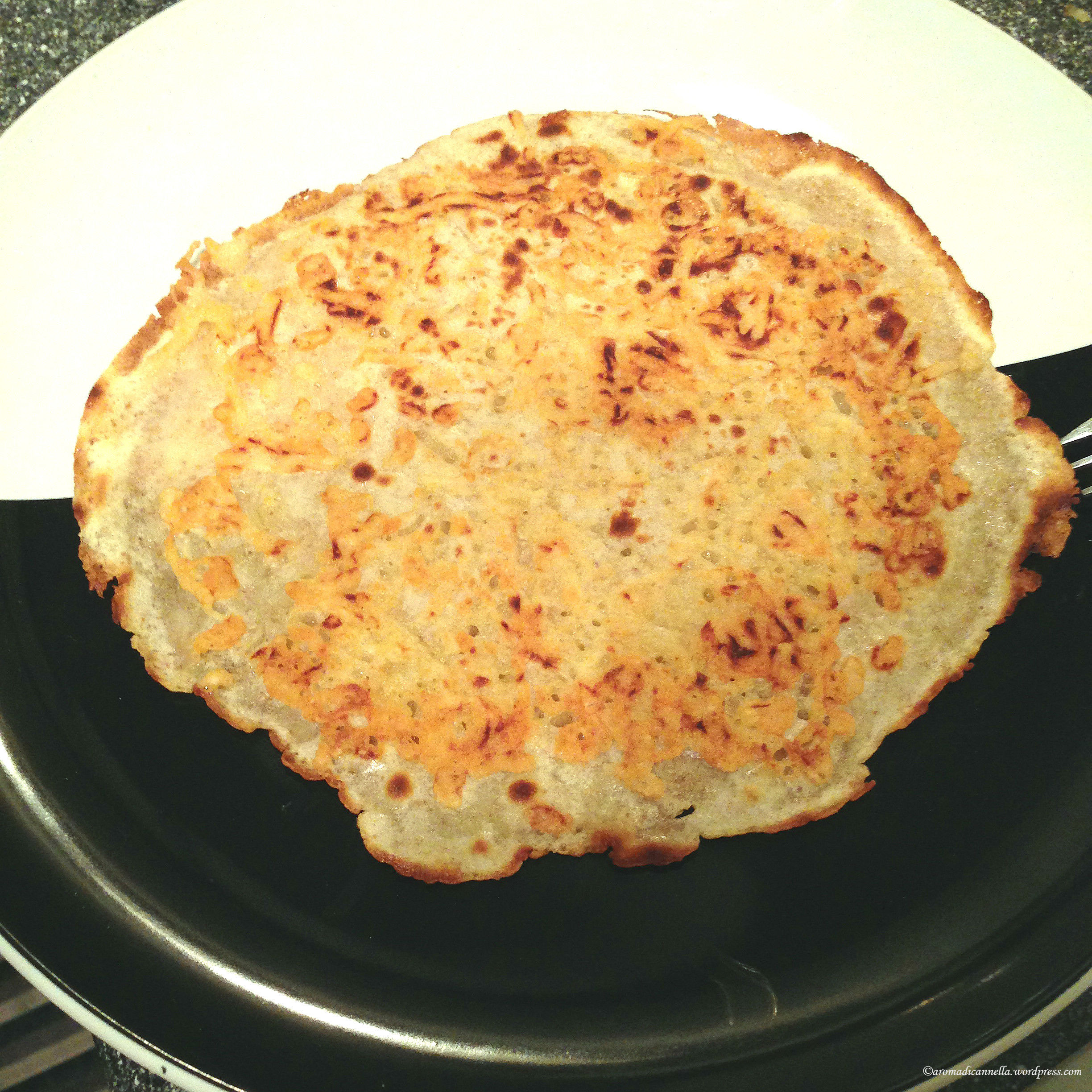 Quando la parte sotto del pancake si imbrunisce (portate pazienza se il primo pancake verrà piuttosto scuro, come dicevo è banco di prova, vi rifarete con gli altri), è il momento di rigiralo. Ciak del King.
