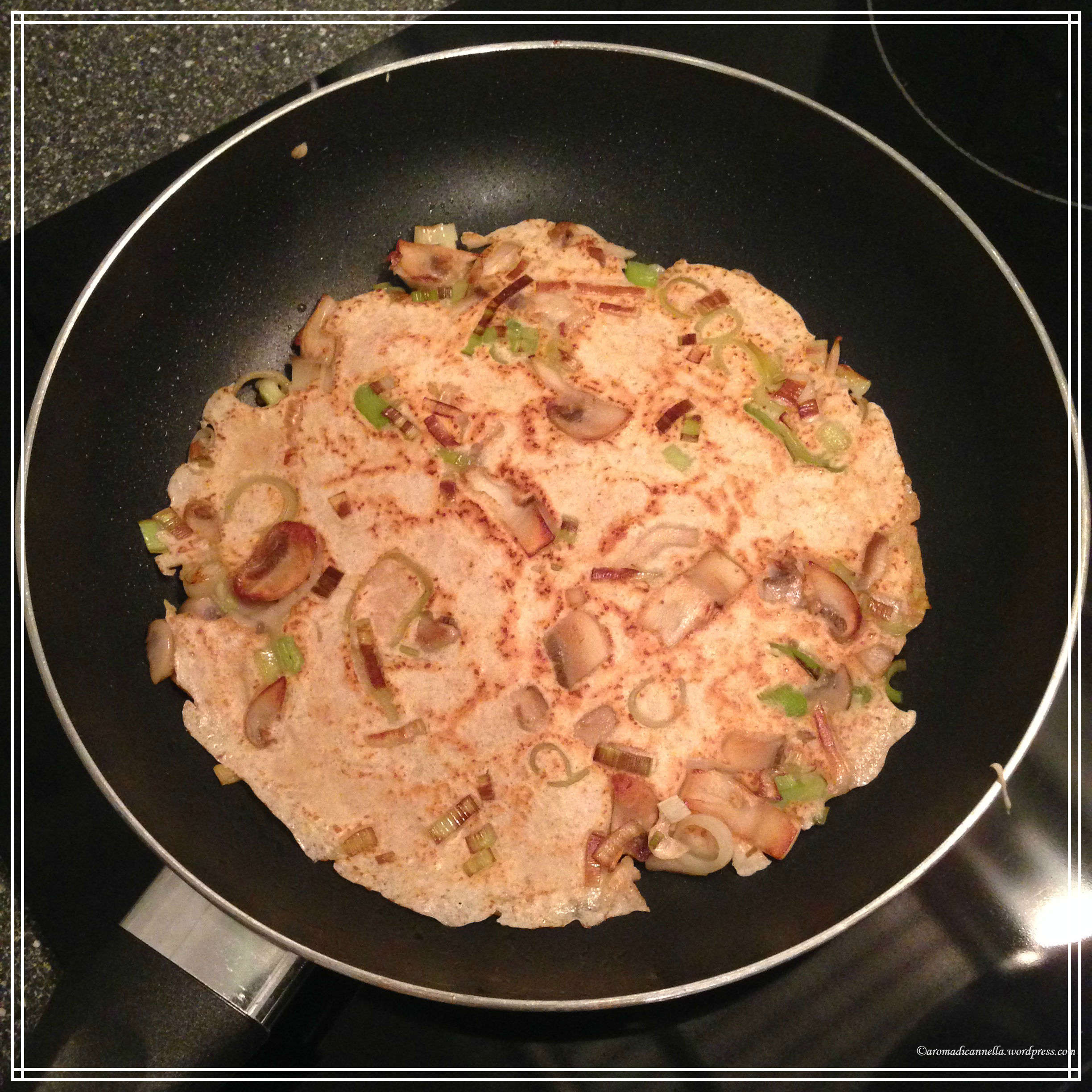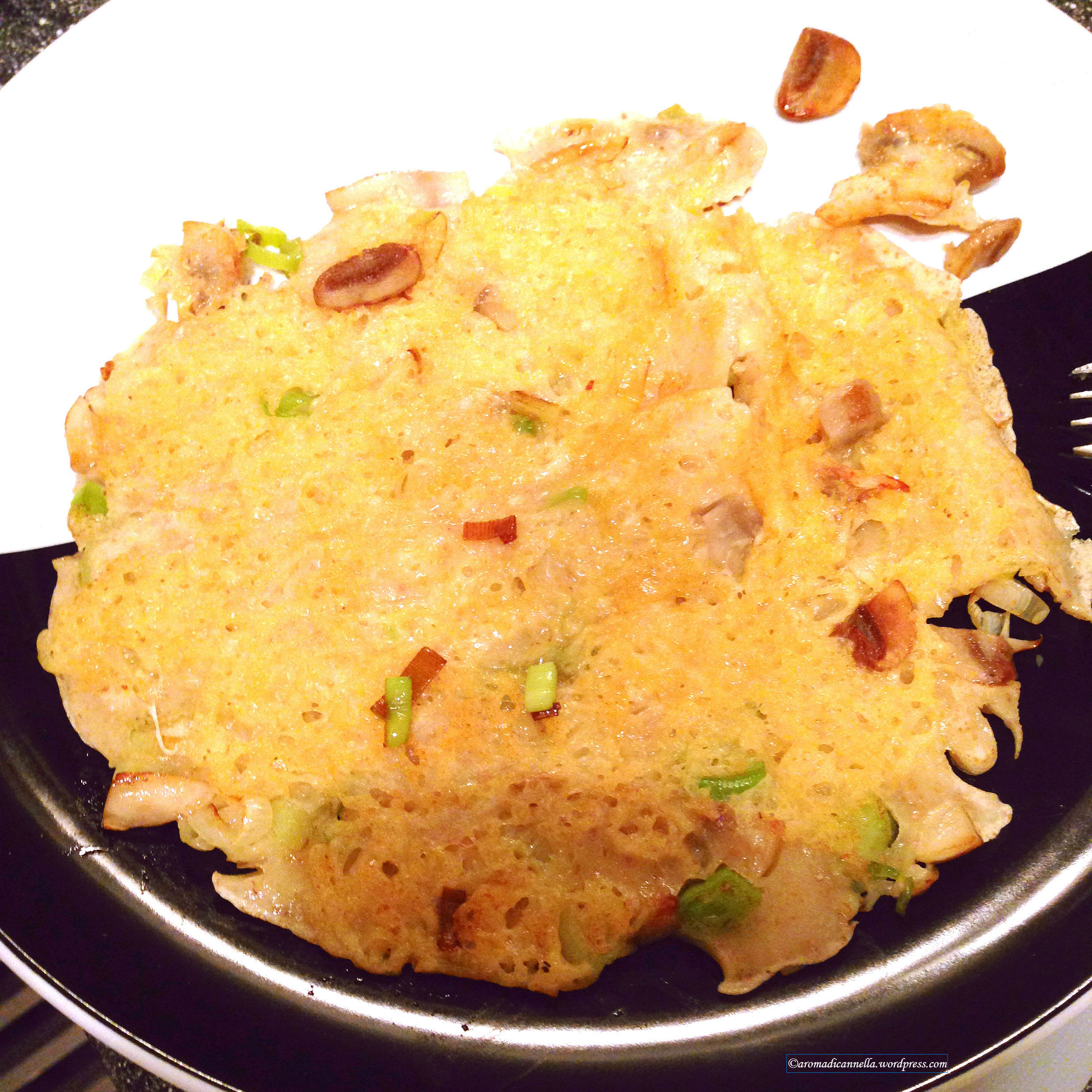 Pancake ai porri e funghi: prima il burro come sempre, poi cuocete gli ingredienti per qualche minuto, aggiungete quindi l’impasto, il formaggio e cuocete da entrambi i lati.